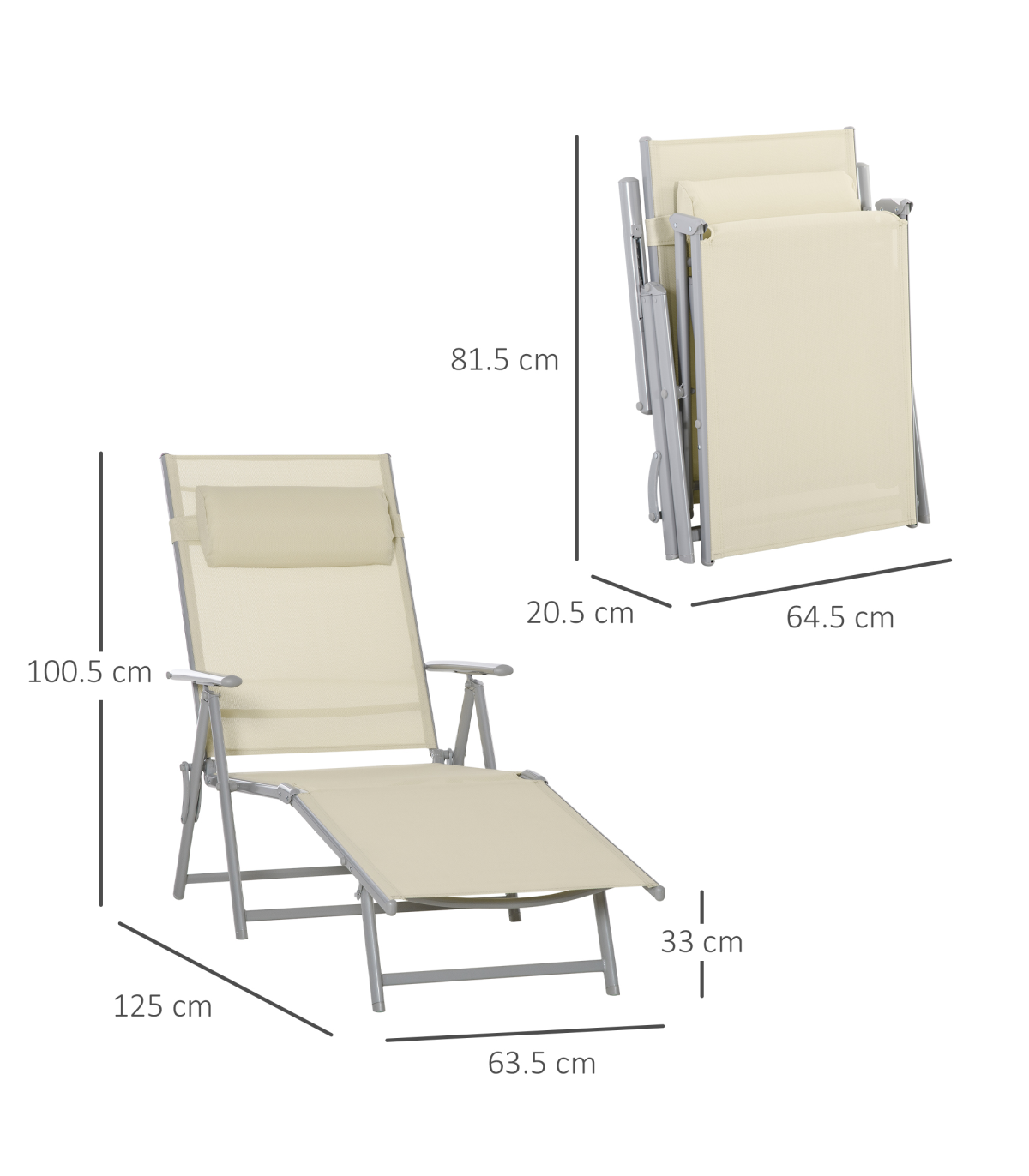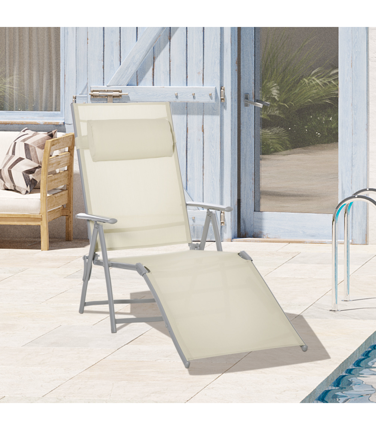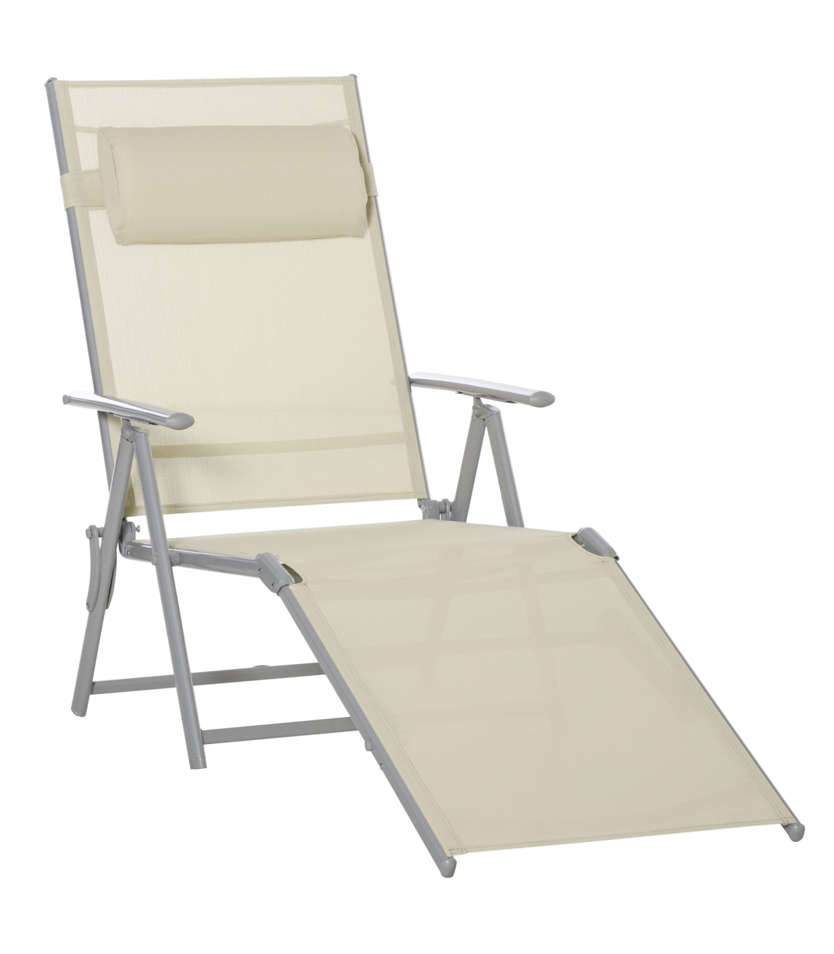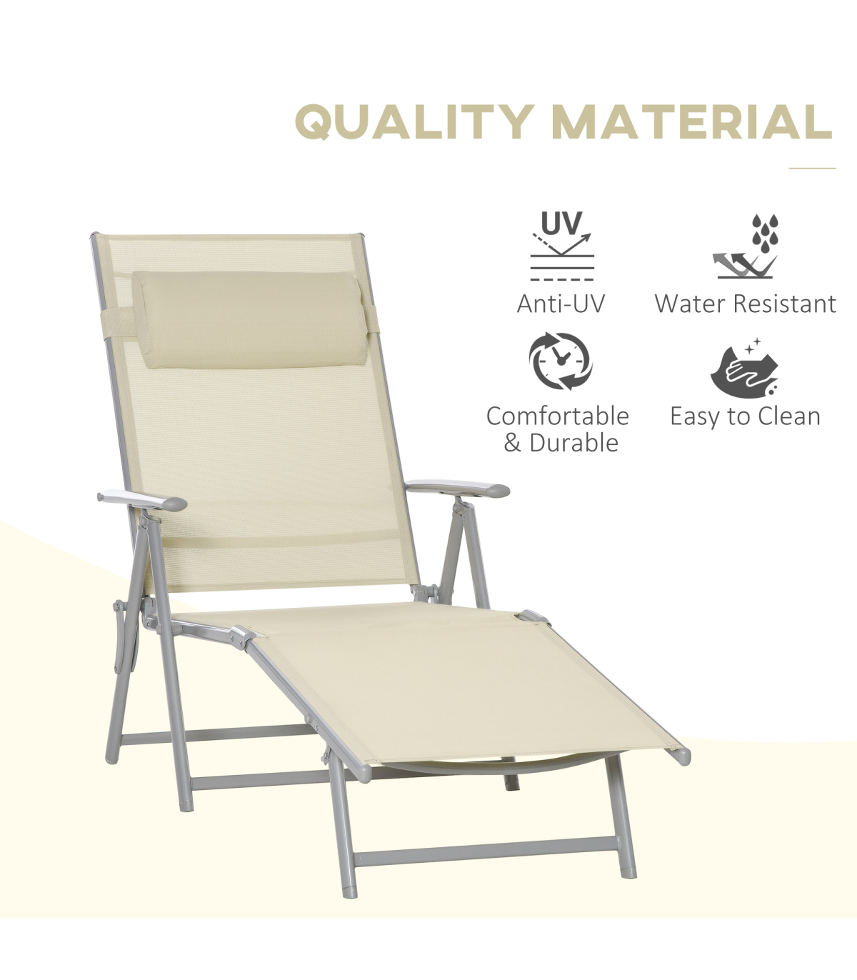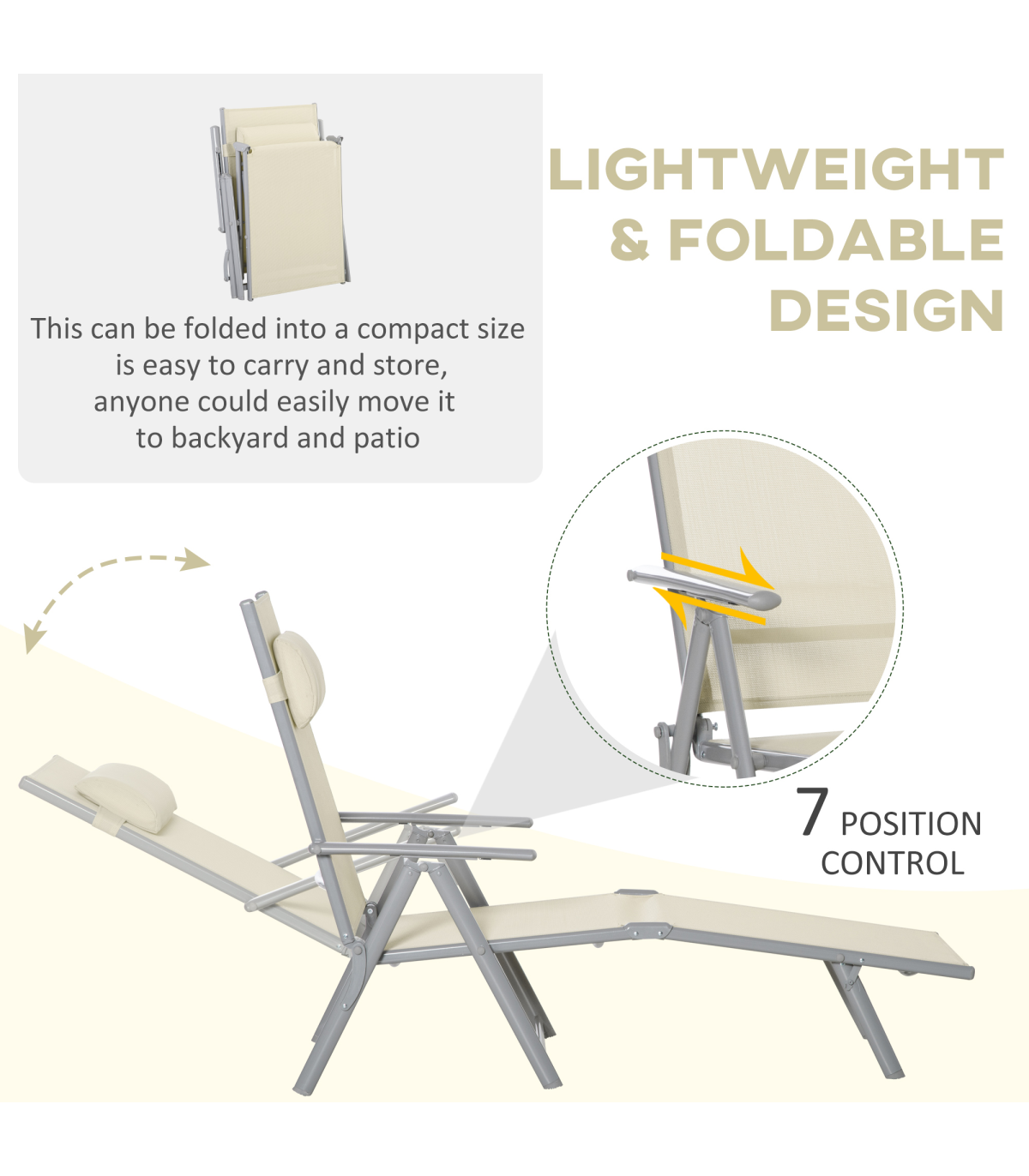 Sun Lounger Folding Chaise Chair Recliner & 7 Adjustable Backrest - Beige