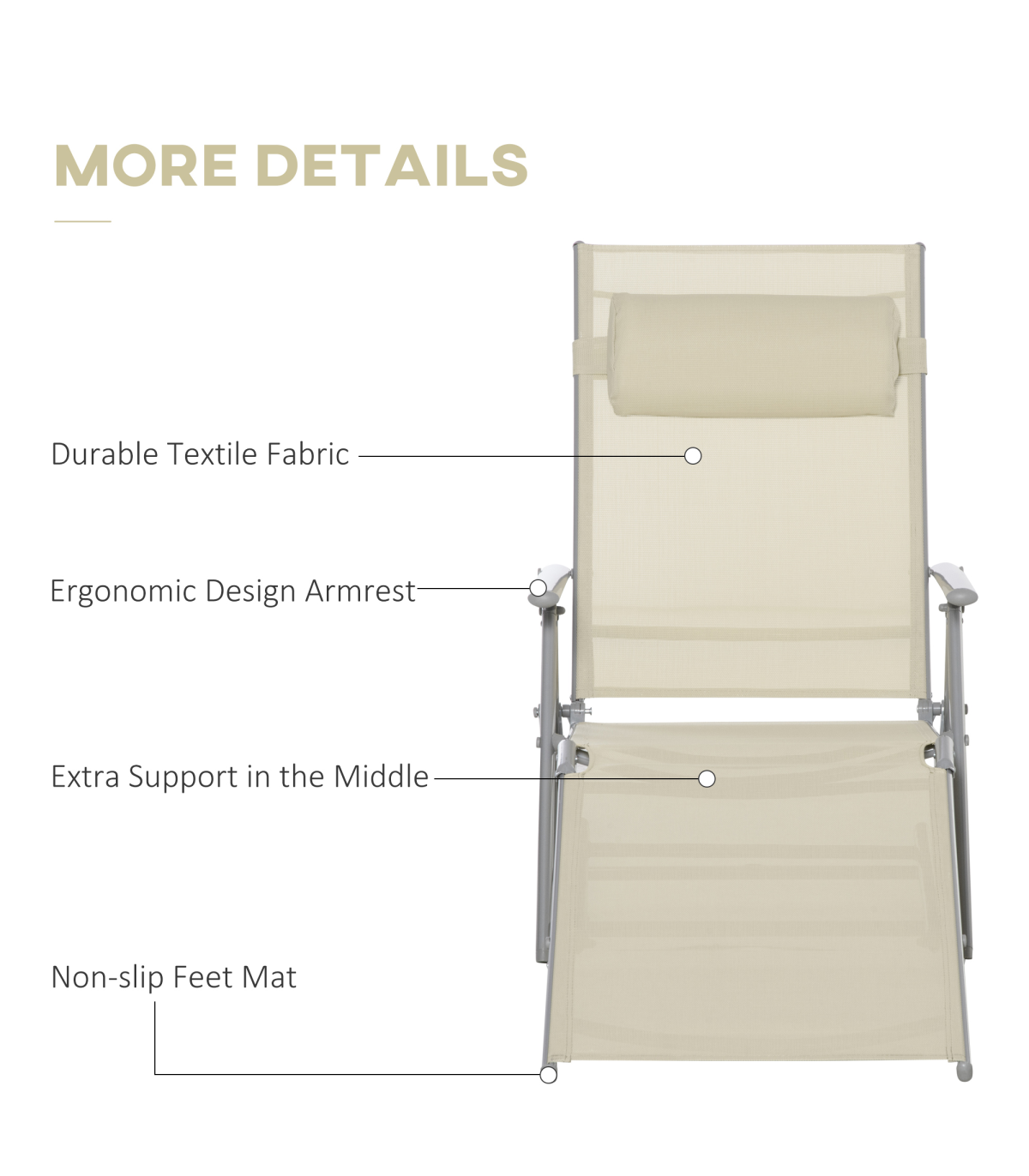 Mesh fabric seat fitted on the metal frame to hold your body comfortably Seven-level adjustable back: relax to a position you want Steel frame is strong and durable - three long legs keep it balanced Folds quickly, easy to carry and store Removable pillow keeps your head and neck comfortable and supported Maximum load 165kg, no assembly required