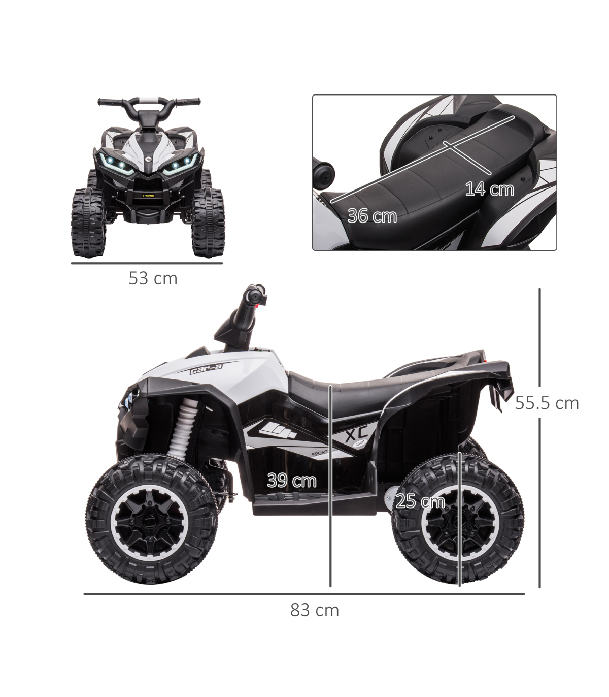 - HOMCOM 12V Electric Quad Bikes for Kids Ride On Car ATV Toy for 3-5 Years Description: - Battery Powered Quad Bike: Includes two motors, this ride-on lasts for 45 minutes after 8-12 hours of charge. It has two speeds - 1.5 and 3km/h, which is the same as a normal walking speed. - Realistic Features: This electric quad bike comes with LED headlights, built-in music and a horn - kids will feel as if they're driving a real vehicle. - Safe to Ride: Wide and textured tyres, providing a smooth and comfortable drive. Four-wheel suspension for added protection when riding. - Dimensions: 55.5H x 83L x 53Wcm. Seat: Off the ground: 39H x 36W x 14Dcm. - Recommended age: 3-5 years. - MAXIMUM LOAD 25KG. - ASSEMBLY REQUIRED.