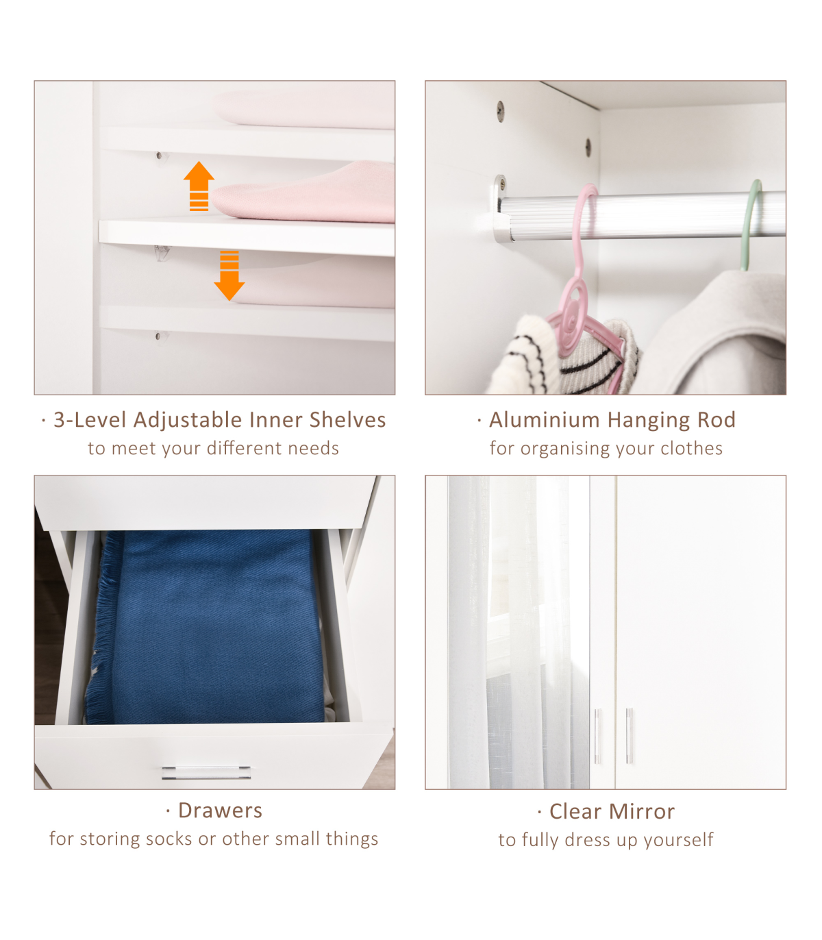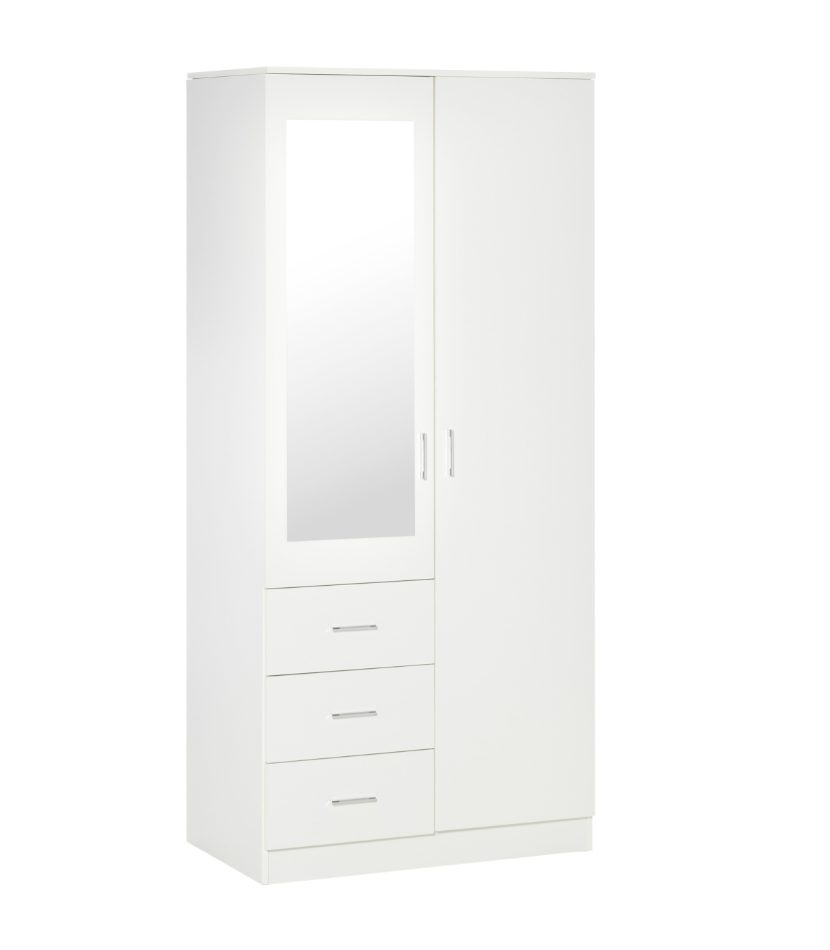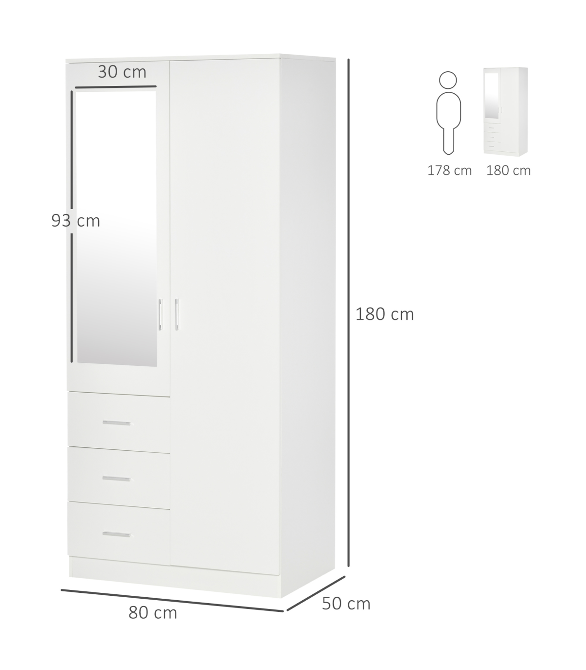 THREE-PART STORAGE: Features three shelves, three drawers and a hanging rail - easy to keep all your clothing in one safe and protected place. Two shelves adjustable to three levels.FRONT MIRROR: It's easy to see your outfit as you get dressed - making getting ready quicker and easier.MODERN DESIGN: Clean white finish is fresh and contemporary. Easy to match with other furniture in your bedroom and home.DIMENSIONS: 180H x 80W x 50Dcm. Drawer inner: 10H x 32W x 43.5Dcm. Shelf: 37W x 45.5Dcm. Mirror: 93H x 30Wcm.MAXIMUM LOAD: Whole: 80kg. Drawer and shelf: 10kg. Clothes rail: 5kg. ASSEMBLY REQUIRED.