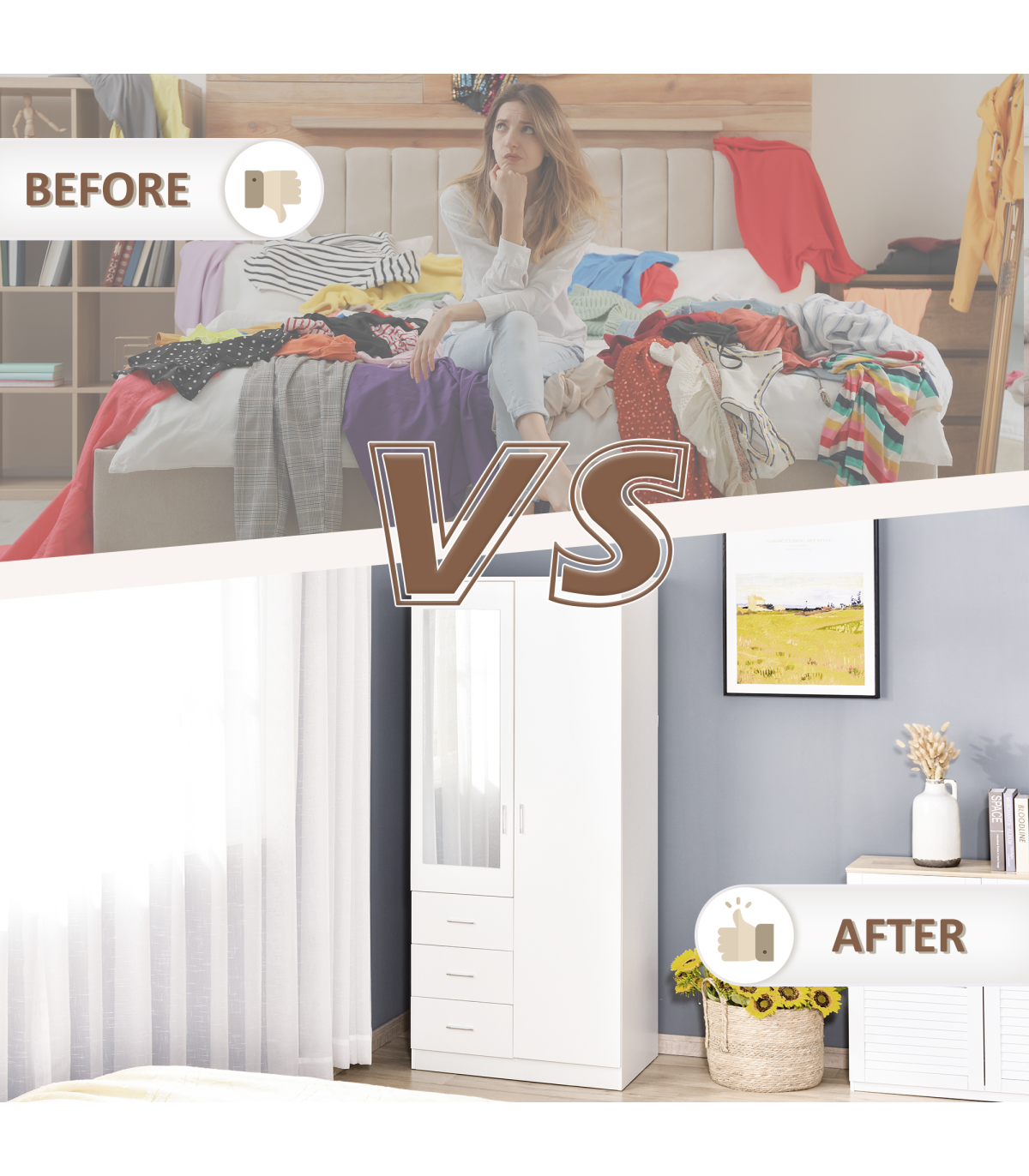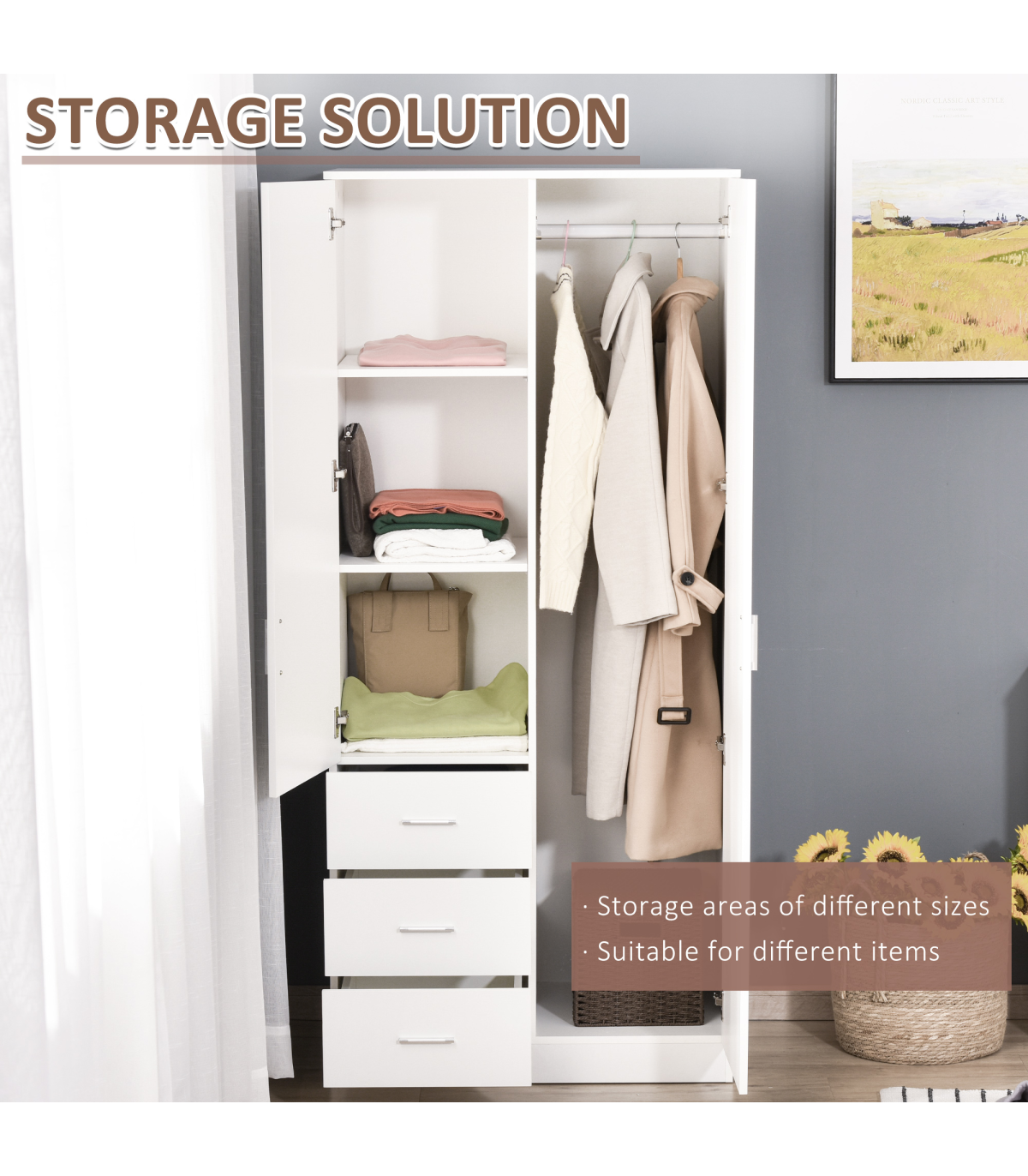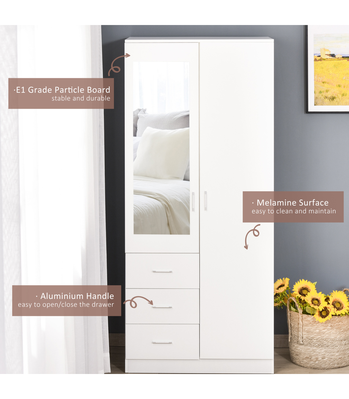 THREE-PART STORAGE: Features three shelves, three drawers and a hanging rail - easy to keep all your clothing in one safe and protected place. Two shelves adjustable to three levels.FRONT MIRROR: It's easy to see your outfit as you get dressed - making getting ready quicker and easier.MODERN DESIGN: Clean white finish is fresh and contemporary. Easy to match with other furniture in your bedroom and home.DIMENSIONS: 180H x 80W x 50Dcm. Drawer inner: 10H x 32W x 43.5Dcm. Shelf: 37W x 45.5Dcm. Mirror: 93H x 30Wcm.MAXIMUM LOAD: Whole: 80kg. Drawer and shelf: 10kg. Clothes rail: 5kg. ASSEMBLY REQUIRED.