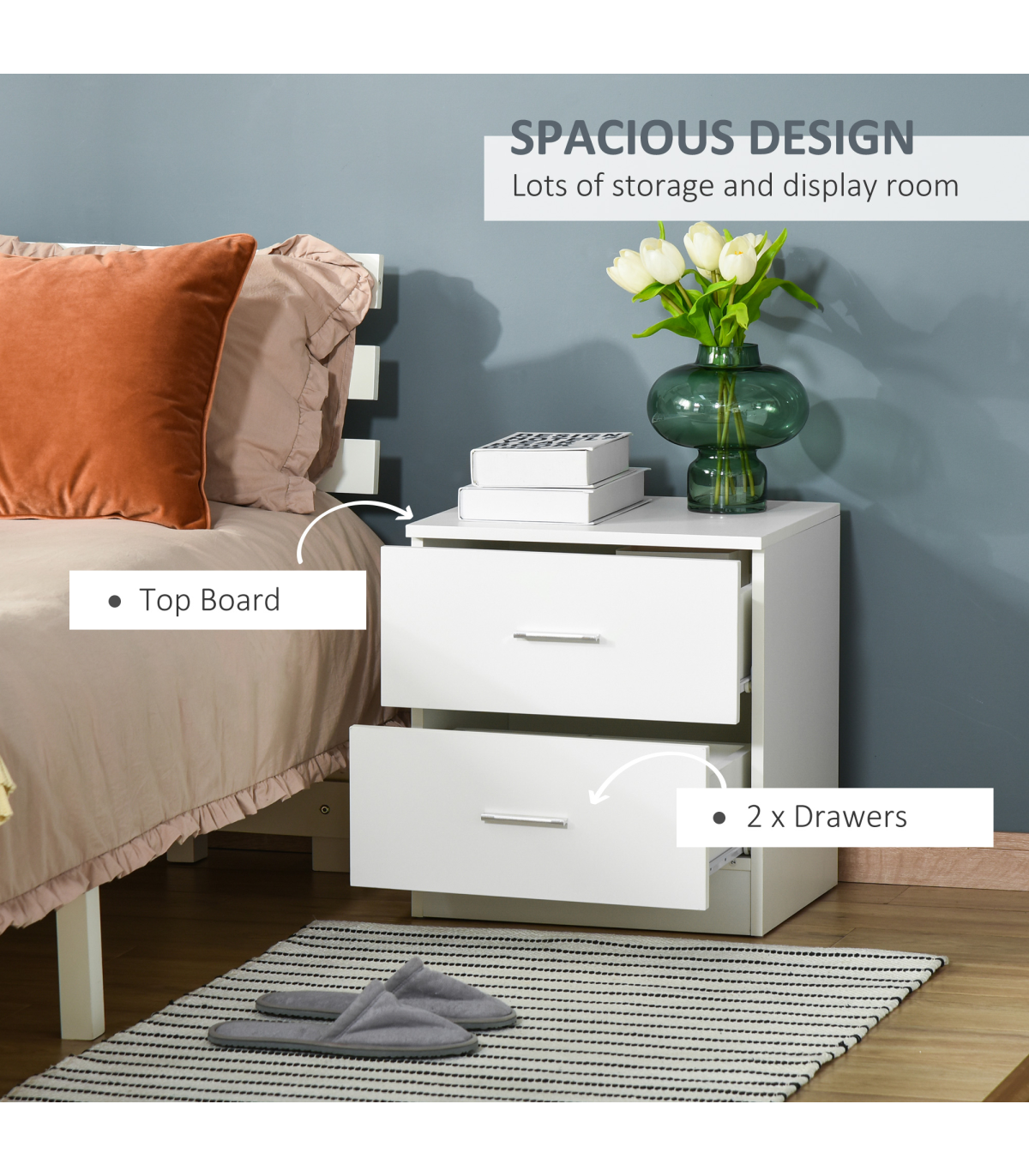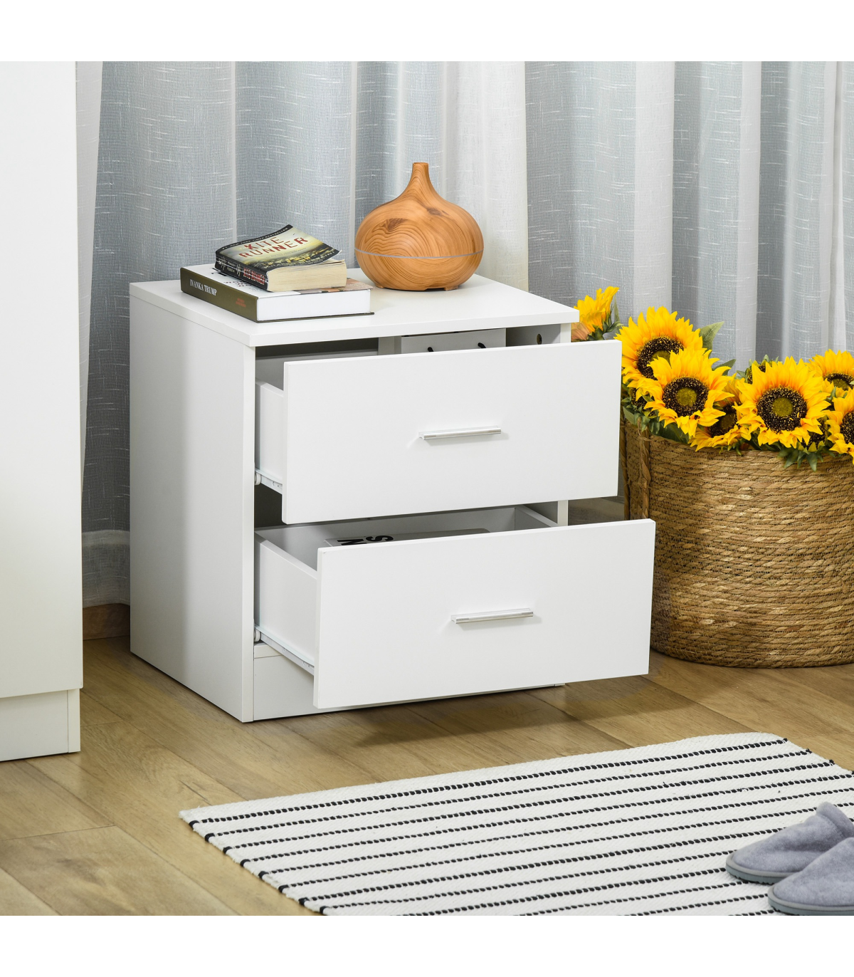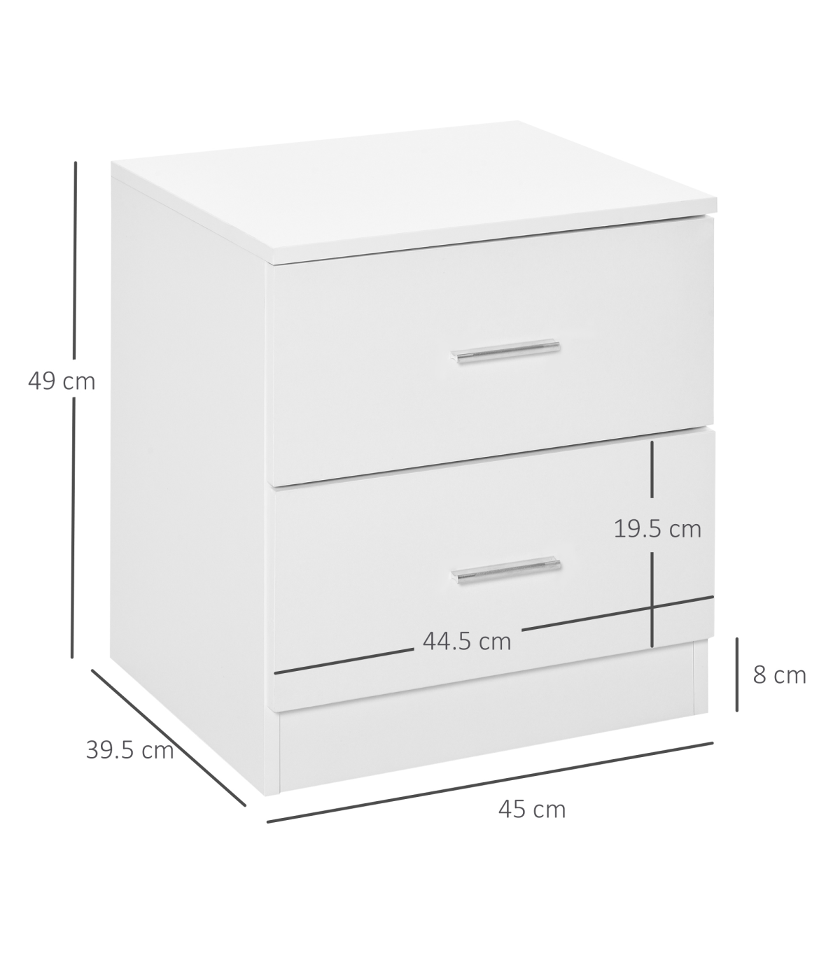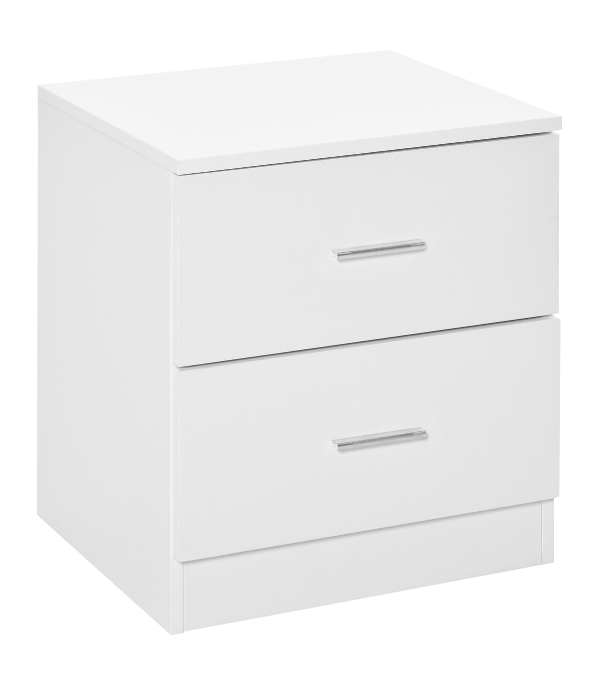 TWO DRAWERS: Room for keeping small bedtime essentials right next to you - toiletries, medication, nightwear. Flat top suitable for alarm clocks and devices close by as you sleep.SMART DESIGN: Clean white colour makes it suitable for practically anywhere! Easy to match with other furniture, suitable for many different-style decors.STURDY: Particle board structure is tough, can be reliably used every day. Smooth finish surface is easy to clean.DIMENSIONS: Overall Dimension: 45W x 39.5D x 49Hcm,MAXIMUM LOAD: Whole: 30kg. Drawer: 5kg each. ASSEMBLY REQUIRED.