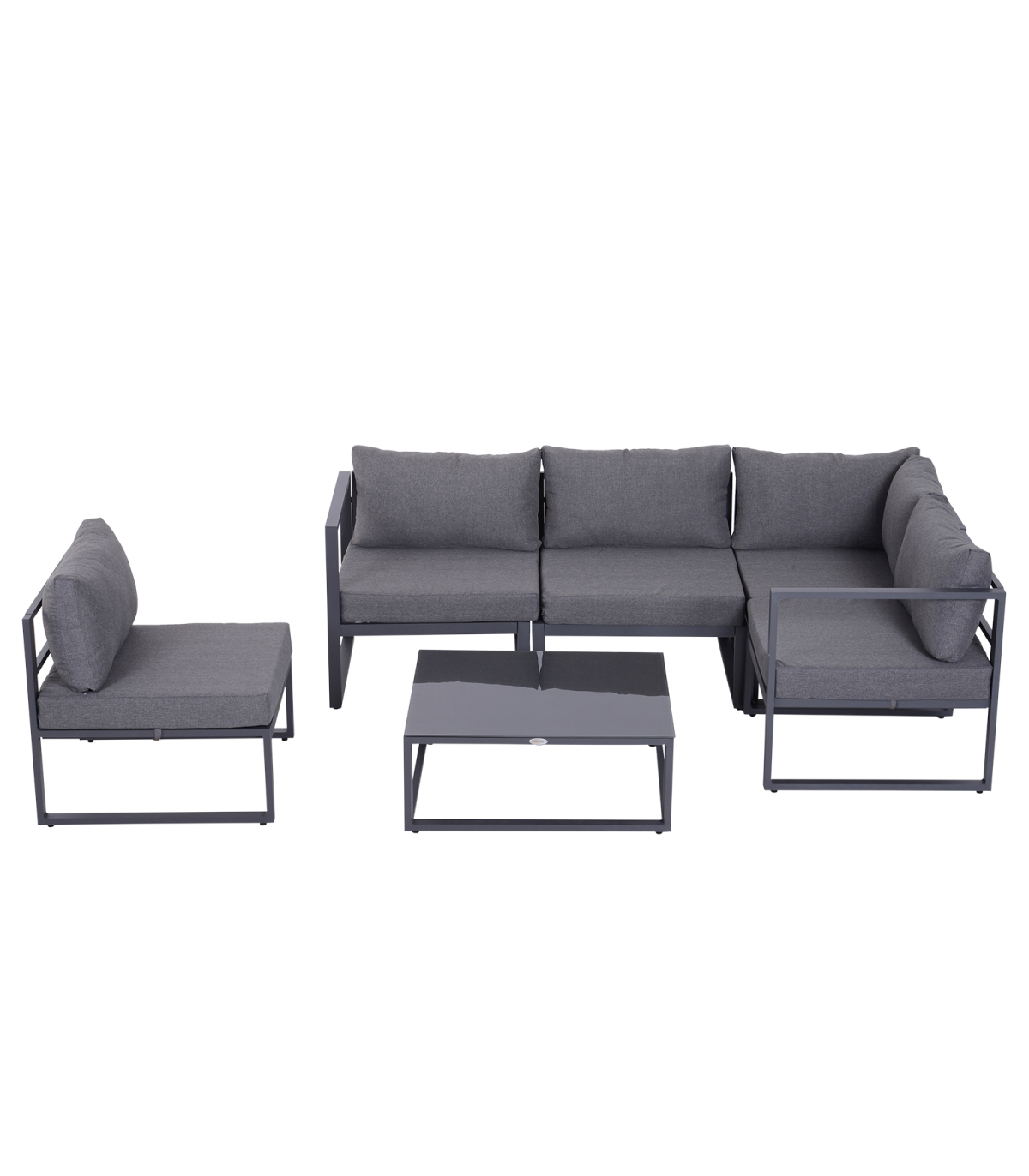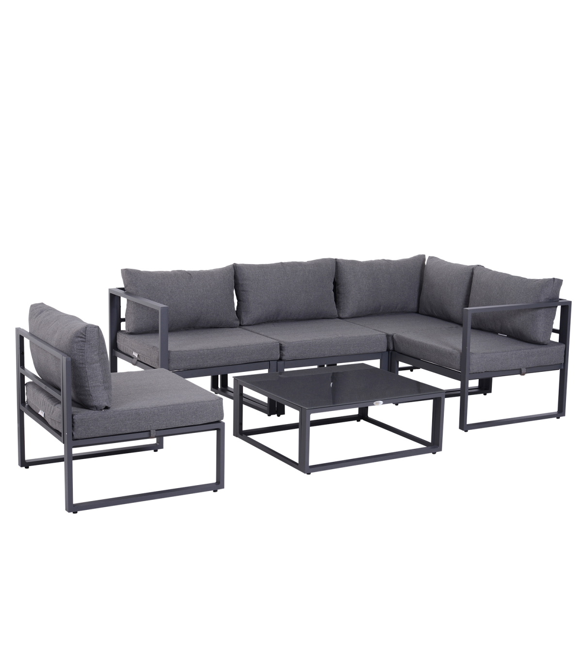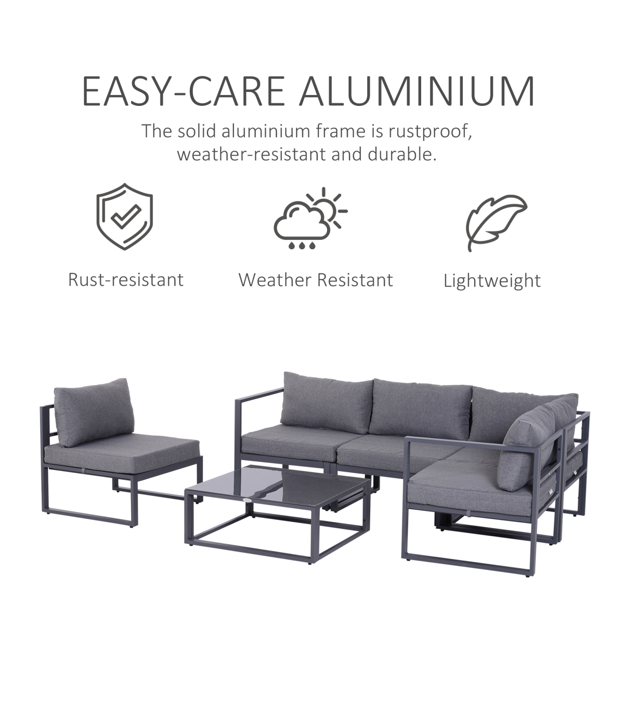 - "6Pcs Outdoor Sectional Sofa Set Conversation Aluminum Frame Cushion Outsunny" - Description: - SIX PIECE GARDEN DINING SET: Includes three corner seats, two middle seats, and a matching coffee table. - COMFORTABLE: Thick padded cushions for all-day relaxation. - ALUMINIUM FRAME: Keeps each piece strong and stable all-year-round. UV and fade-resistant. - TEMPERED GLASS TABLETOP: Adds a slick finishing touch and can be wiped clean easily. - EASY TO MAINTAIN: Cushion covers can be removed and washed for a fresh look all-year-round. - DIMENSIONS: - Middle chair: 69L x 65W x 63Hcm. - Corner chair: 65L x 65W x 63Hcm. - Table: 75L x 70W x 30Hcm. - MAXIMUM WEIGHT CAPACITY: - Chair: 160kg. - Table: 30kg. - ASSEMBLY REQUIRED.