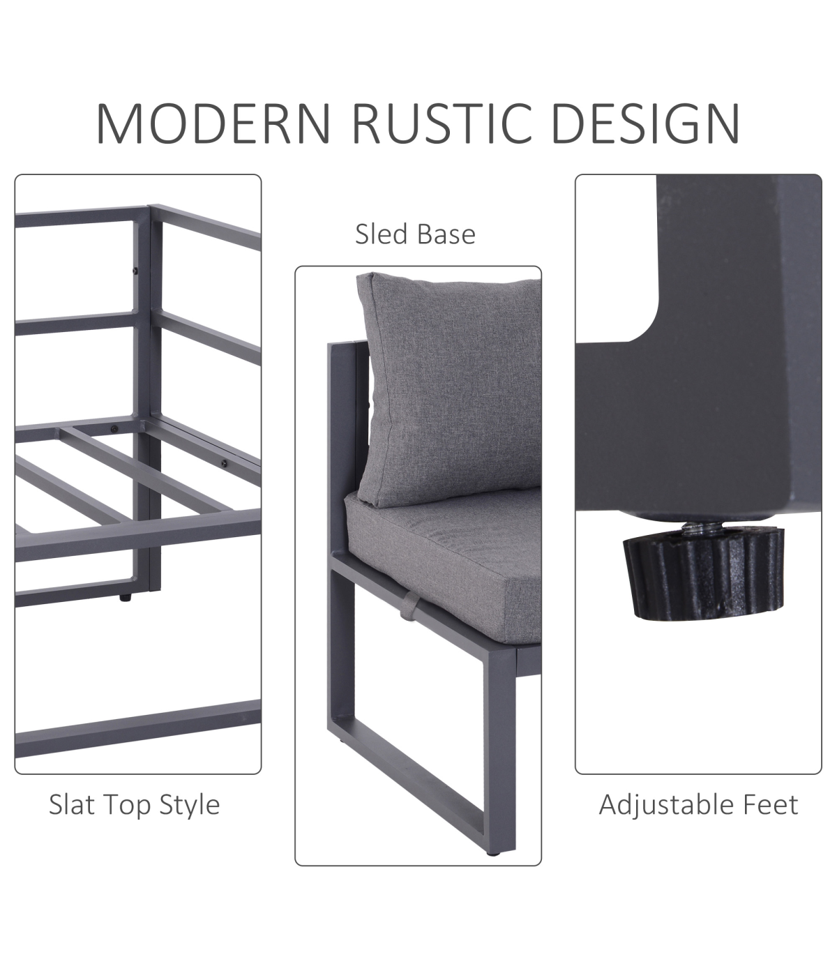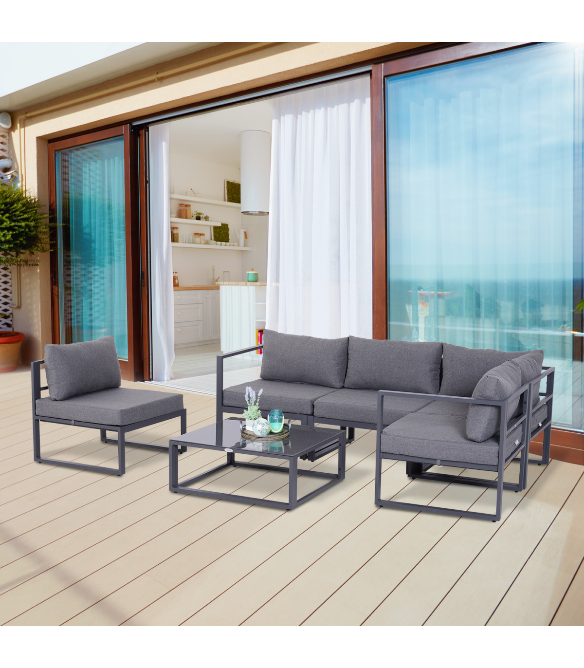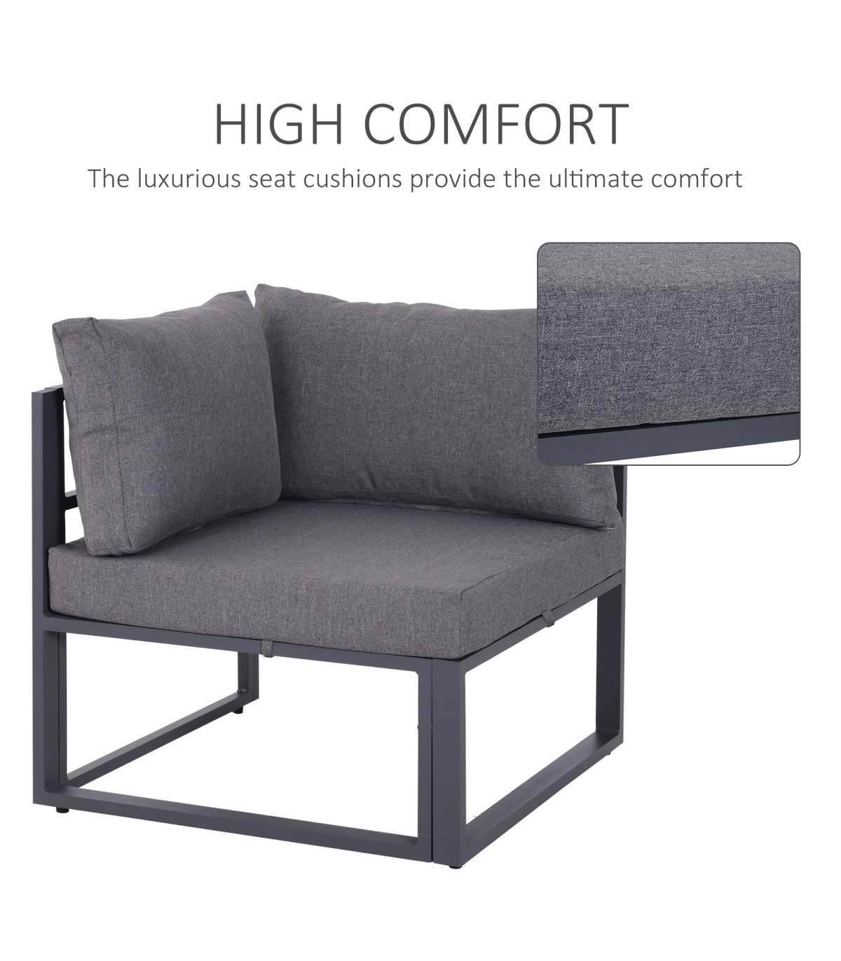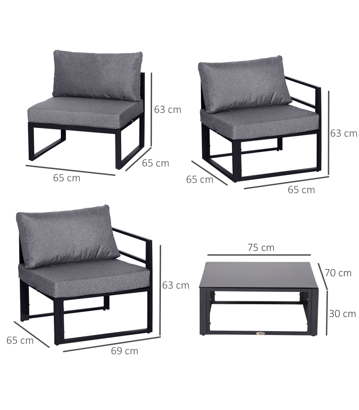 - "6Pcs Outdoor Sectional Sofa Set Conversation Aluminum Frame Cushion Outsunny" - Description: - SIX PIECE GARDEN DINING SET: Includes three corner seats, two middle seats, and a matching coffee table. - COMFORTABLE: Thick padded cushions for all-day relaxation. - ALUMINIUM FRAME: Keeps each piece strong and stable all-year-round. UV and fade-resistant. - TEMPERED GLASS TABLETOP: Adds a slick finishing touch and can be wiped clean easily. - EASY TO MAINTAIN: Cushion covers can be removed and washed for a fresh look all-year-round. - DIMENSIONS: - Middle chair: 69L x 65W x 63Hcm. - Corner chair: 65L x 65W x 63Hcm. - Table: 75L x 70W x 30Hcm. - MAXIMUM WEIGHT CAPACITY: - Chair: 160kg. - Table: 30kg. - ASSEMBLY REQUIRED.