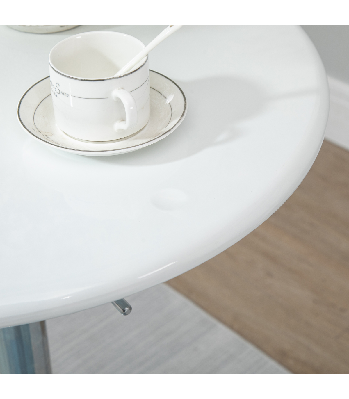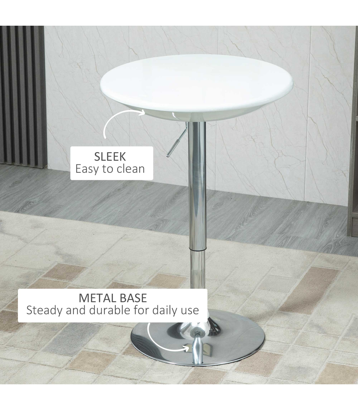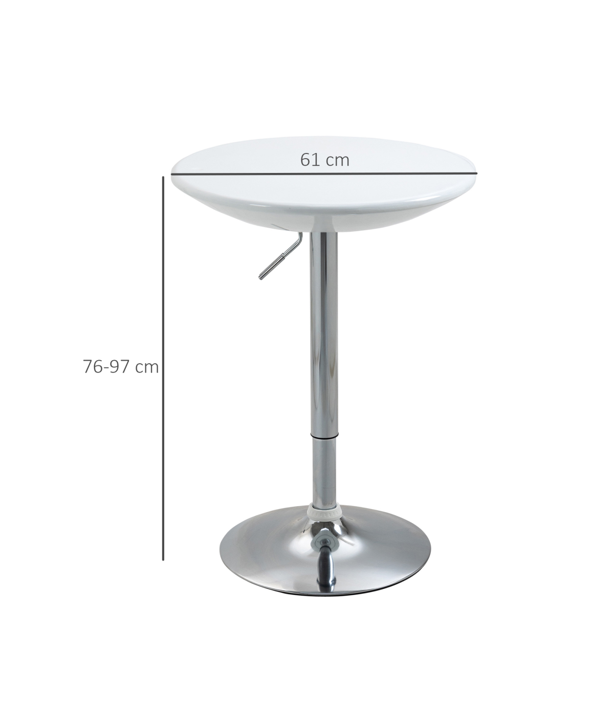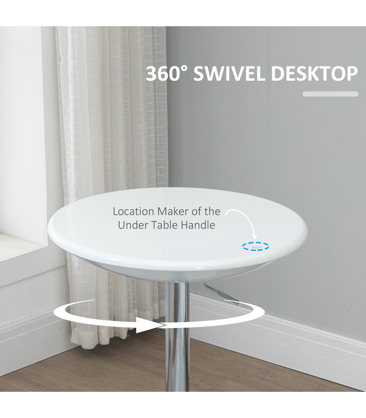 SLEEK MOD AESTHETIC: The sleek and neutral white painted tabletop with silver steel base is a perfect addition to modern home bars, patio, pubs, parties and restaurant, etc. The location maker of the handle is a convenient design.360SWIVEL TABLETOP: Swivel tabletop provides you with easy access to the foods, drinks, fruits, snack or coffee, making you enjoy the leisure time to your heart's content. ABS painted waterproof desktop can be cleaned with a wet cloth and not be easily dirtied by water or oil stains.HEIGHT ADJUSTABLE: Powered by a pneumatic gas lever, this table can be adjusted from 76 cm to 97 cm to accommodate seated or standing guests, depending on the situation and setting.STURDY STEEL BASE: Made of electroplating and steel chassis, this sturdy pub table can hold up to 80 kg.DIMENSION: Overall Dimension: 61L x 61W x 76-97H cm. Assembly Required.