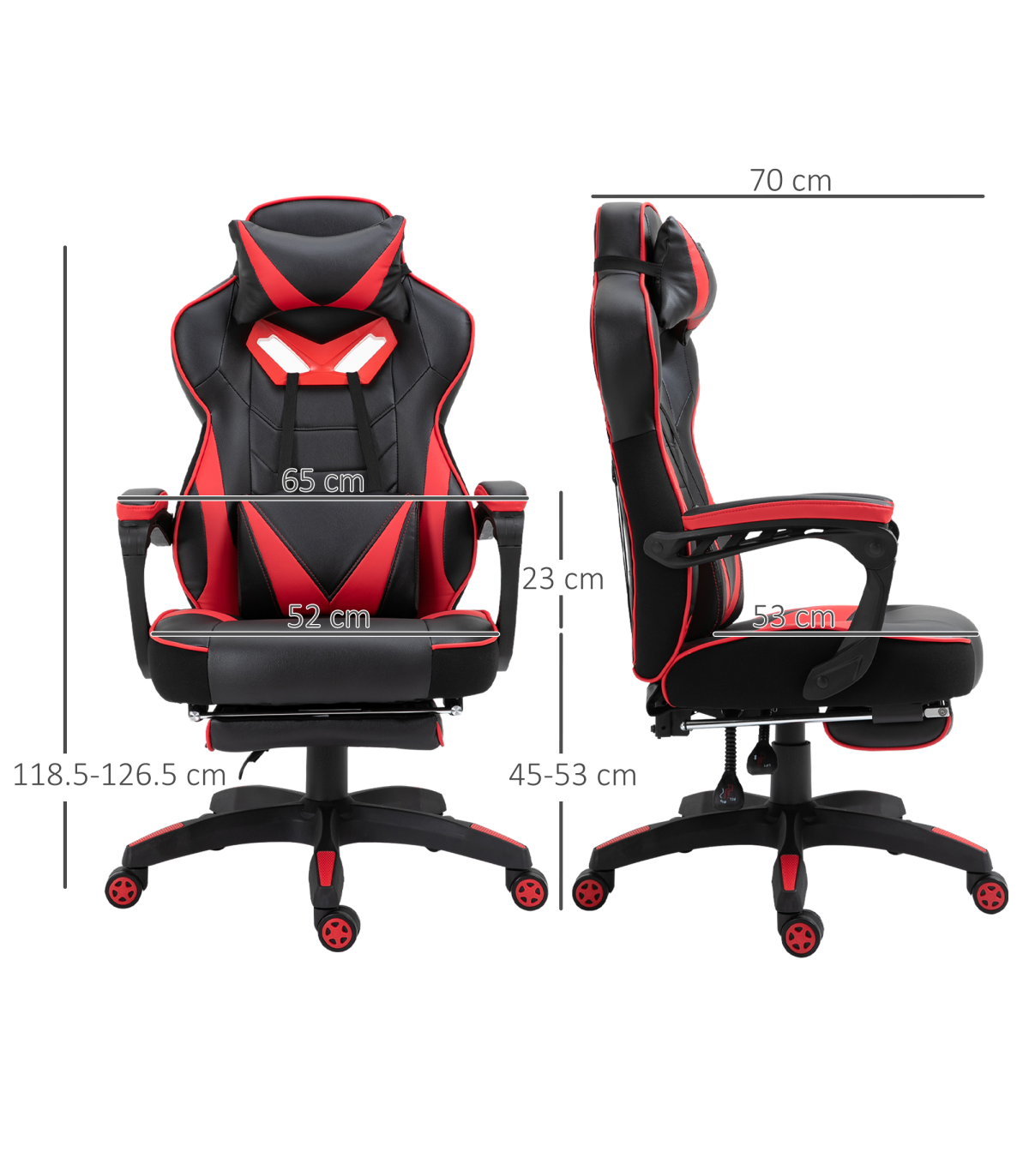 - "Gaming Chair Ergonomic Reclining w/ Manual Footrest Wheels Stylish Office Red" - Description: - Stylish: Two-tone faux leather upholstery - this game chair brings style into your gaming room and work space. - Comfortable: Thick padding all over, padded armrests, a high back, swivel base, and cut-out panels on the back for airflow. Wide seat offers plenty of room. - Manual footrest: Elevate your lower body on this gaming chair. Easy to pull out and push back in - great for relaxing with the back fully reclined back at 170�. - 360� swivel base: Five caster wheels for easy movement while seated. - Dimensions: 118.5-126.5H x 65W x 70Dcm. Seat: 45-53H x 55W x 53Dcm. Maximum load 120kg. Assembly required.
