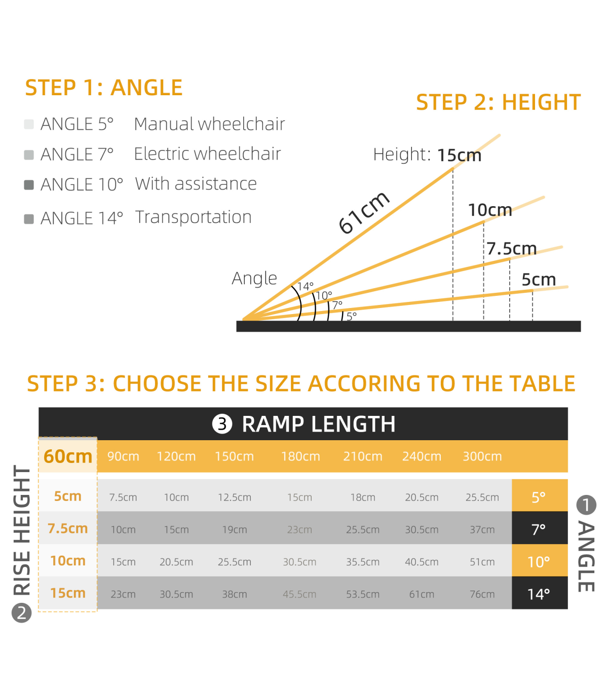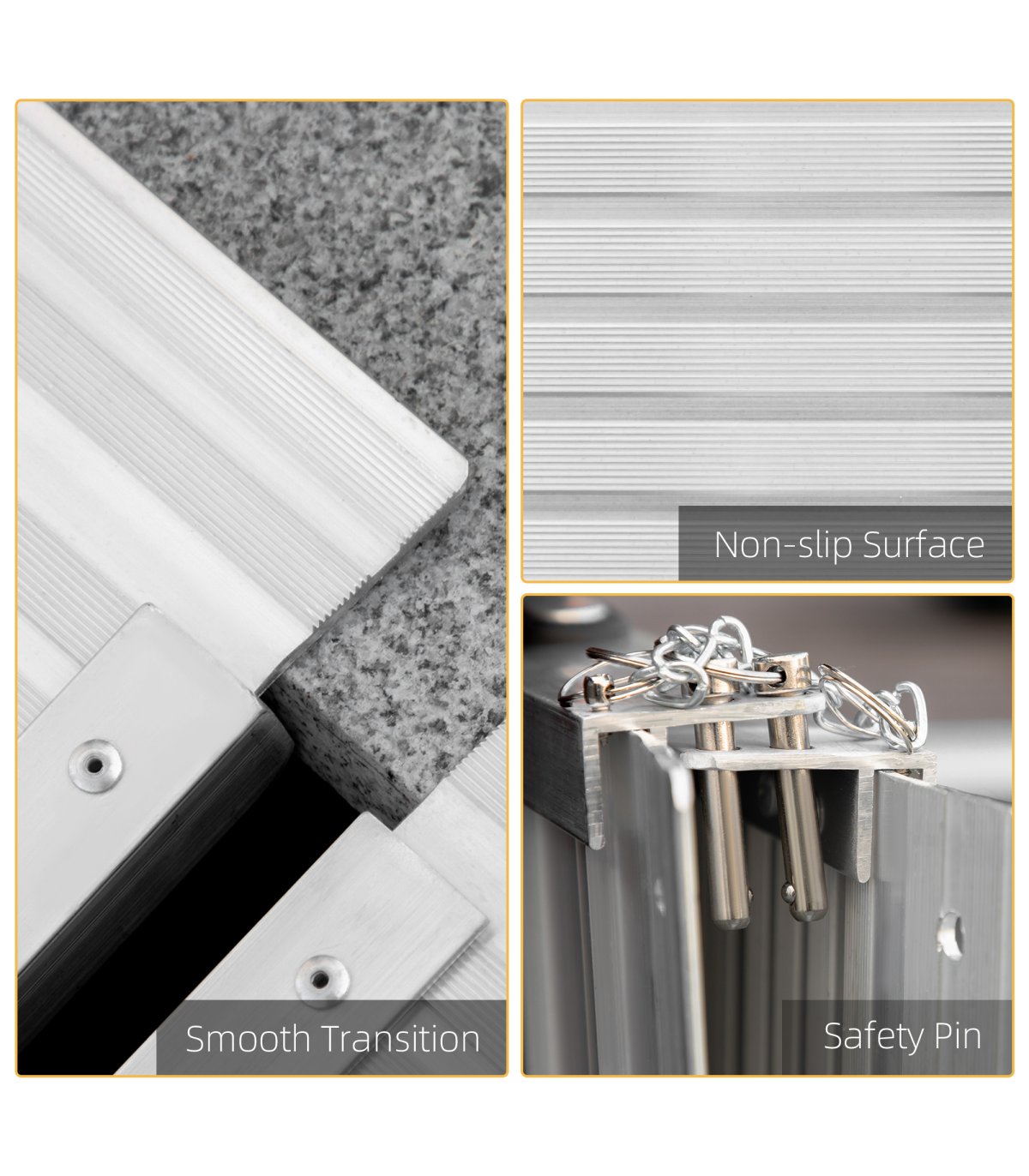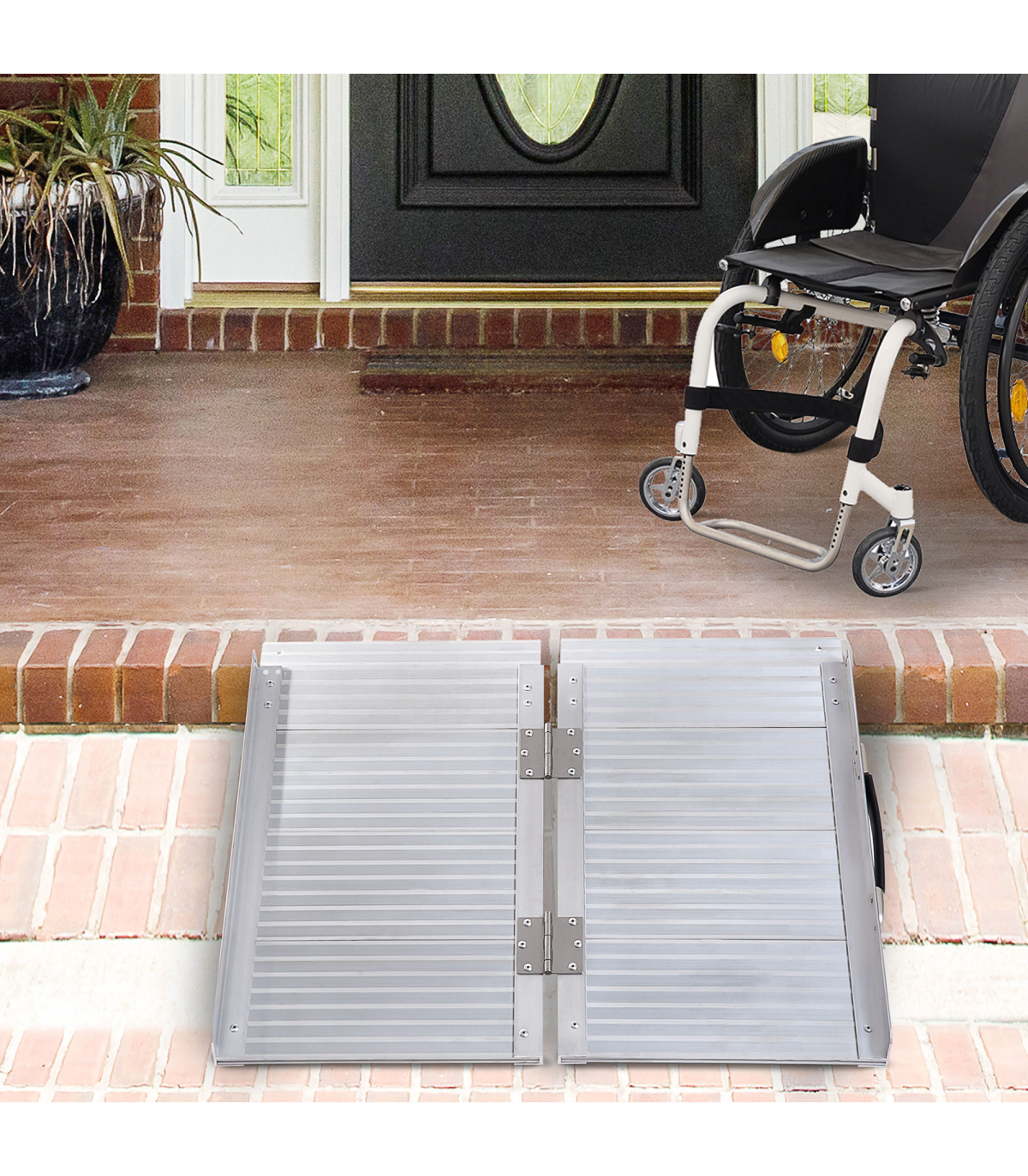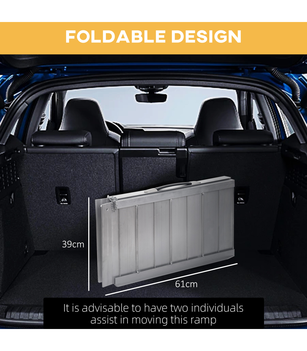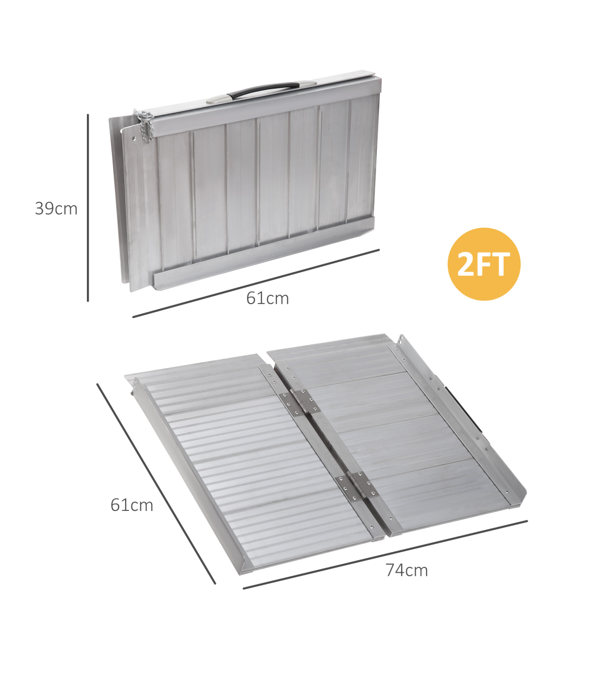MULTI-USE ALUMINIUM RAMP: Helps move wheelchairs, buggies and walkers etc. move up to higher step platforms easilyALUMINIUM BODY: Anti-corrosive for extensive use outdoors, this ramp for mobility scooters is steady and tough for reliability and support whilst using.GUARDRAILS: Placed on each side, the portable ramp prevents the wheels from rolling off the edges and causing harm.ANTI-SLIP SURFACE: Prevents wheels moving around whilst using the folding ramp, making it very safe once on. FOLDING DESIGN: Equipped with handle, allowing this ramps for wheelchairs to be picked, moved and stored easily.DOOR RAMP DIMENSIONS: 61L x 74W x 5T cm, Folded Size: 61L x 39W x 9T cm MAXIMUM LOAD WEIGHT 270KG.