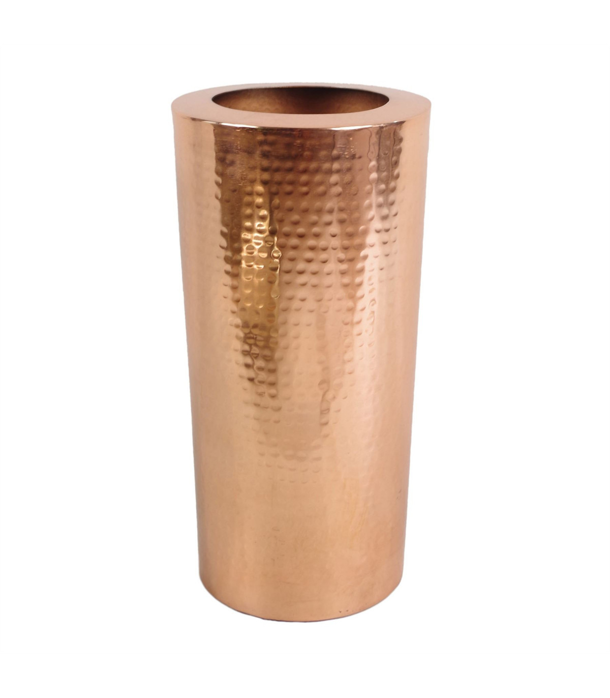 This metal vase measures 15cm wide x 30cm high. It is made of metal with a hammered antique copper finish. The inner diameter is 10cm. These vases are all hand made in a rustic finish with intentional minor imperfections. As all these vases are hand made there are minor differences from one to another and each one is slightly unique. Designed for our artificial flowers. This is a decorative vase and is not intended to hold water.