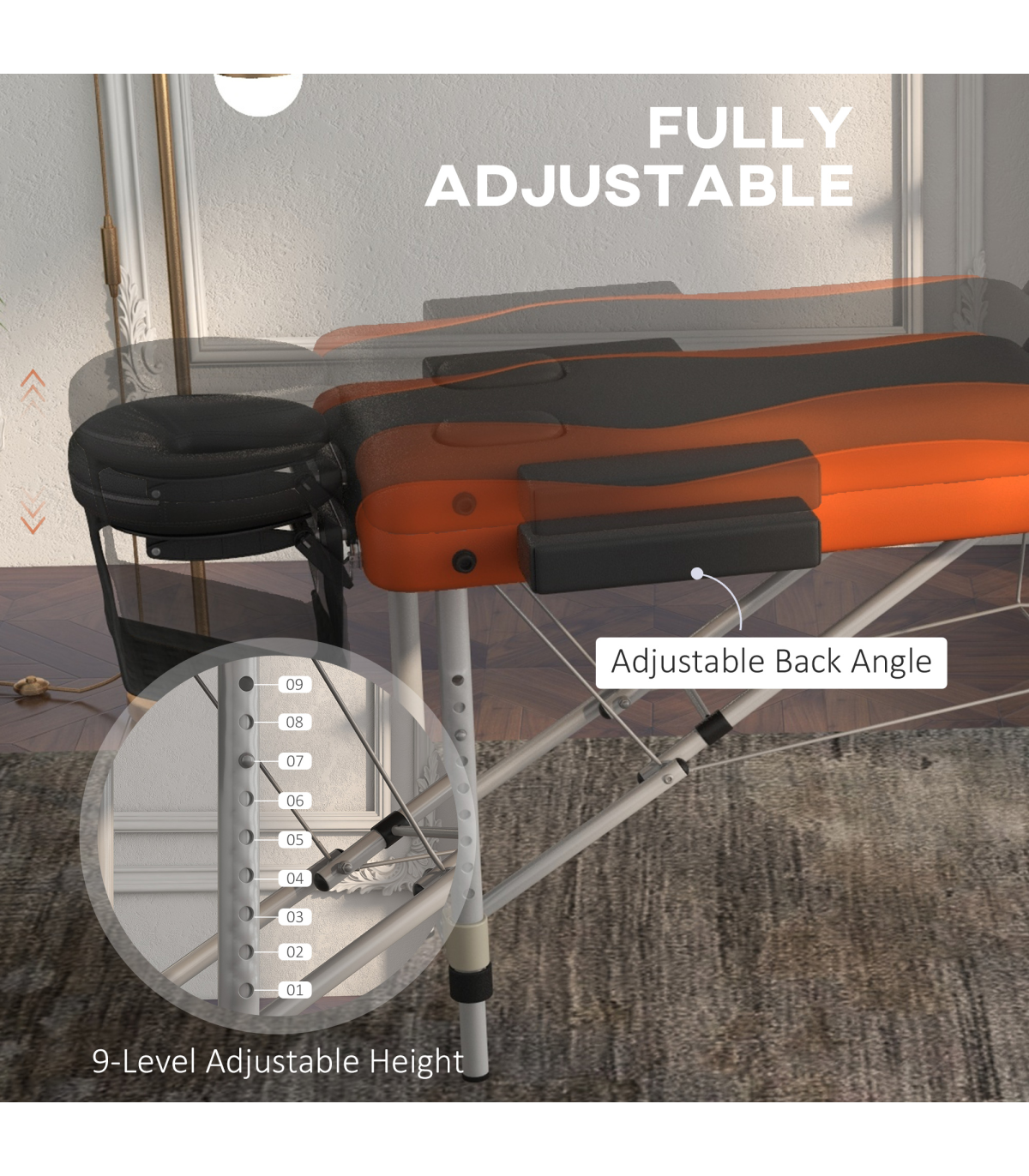 Experience salon-level comfort at home with this HOMCOM massage table. The strong and supportive aluminium frame is adjustable to nine different heights: set to a position most comfortable. The head section can also be lifted to ten different positions, with a padded headrest to keep your neck and head comfortable, whilst allowing you to breathe if positioned face down. Its foldable design is easy to set up complete with side handle to carry easily.
