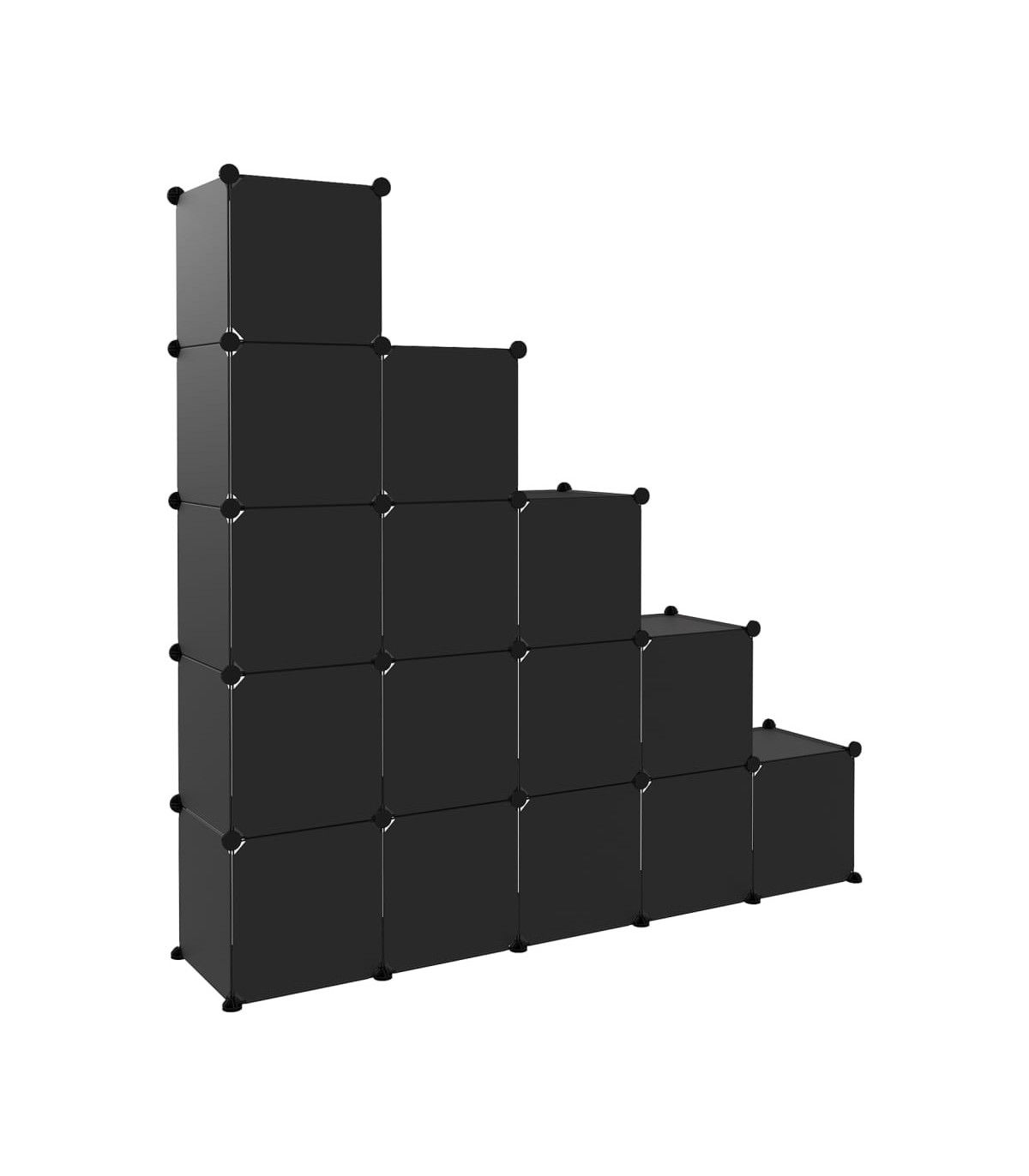 This versatile storage cube organiser is meant to make the best use of the limited space and satisfy your various storage needs. Practical material: The storage organiser is made of PP plastic panels, which are waterproof and need low maintenance.Strong and stable structure: The steel frames ensure sturdiness and stability.User-friendly design: Thanks to the lightweight design, the storage shelf can be assembled to your liking with the included wood hammer. When not in use, it is easy to separate the panels and stack them to save space.Ample storage space: This plastic closet contains 15 modular cubes. The storage space makes it easy to keep things organised.Wide applications: With large storage space and a simple design, the storage rack is an excellent storage solution for your home, dormitory and office. Note:The maximum loading capacity of each cube is 10 kg.