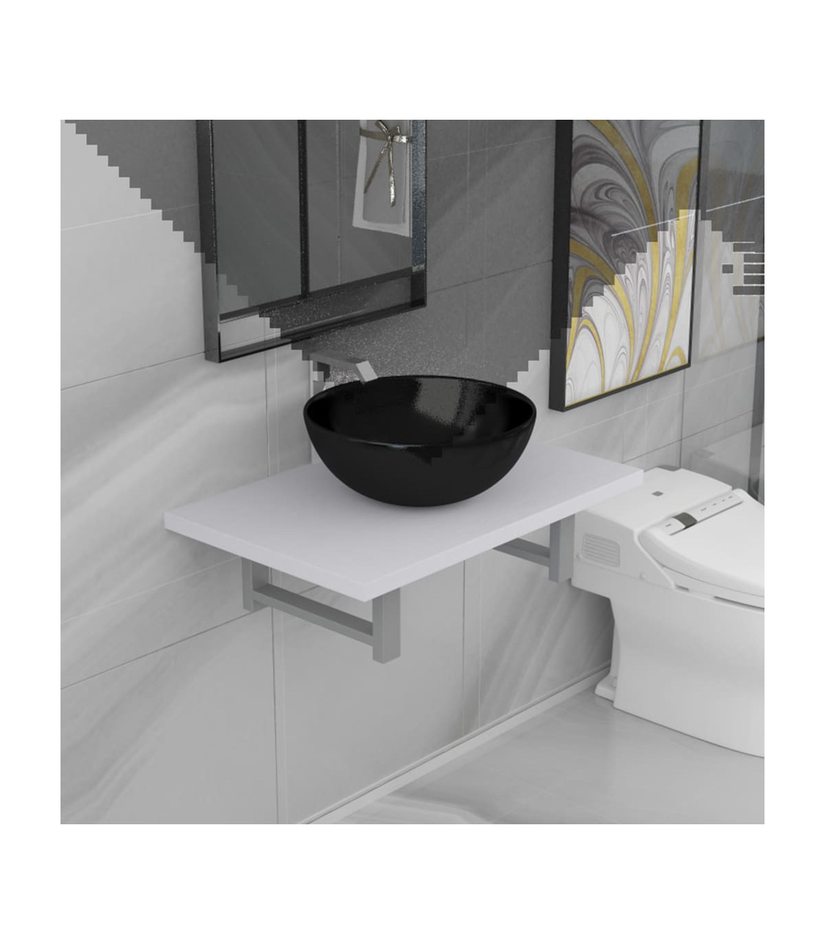 Our practical and timeless bathroom furniture set consists of a wall shelf and a round-shaped basin. It will make a stylish addition to any bathroom, washroom or powder room. Made of the strong material, the bathroom wall shelf is exceedingly stable and durable, making it the perfect place to place the included ceramic basin. The ceramic basin has a high gloss finish and is easy to clean with a damp cloth. In addition, the bathroom furniture can be easily installed on the wall with our included brackets and mounting materials. The perfect combination of the wall shelf and wash basin will be the focal point in your bathroom! Please note that no drain is included in delivery.