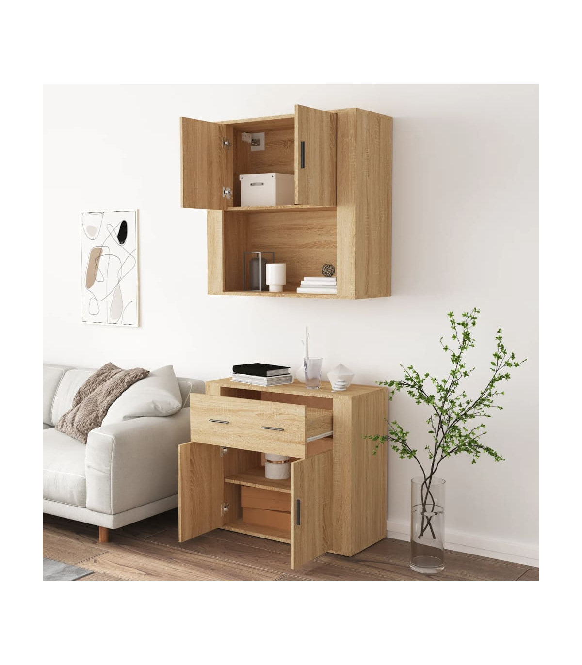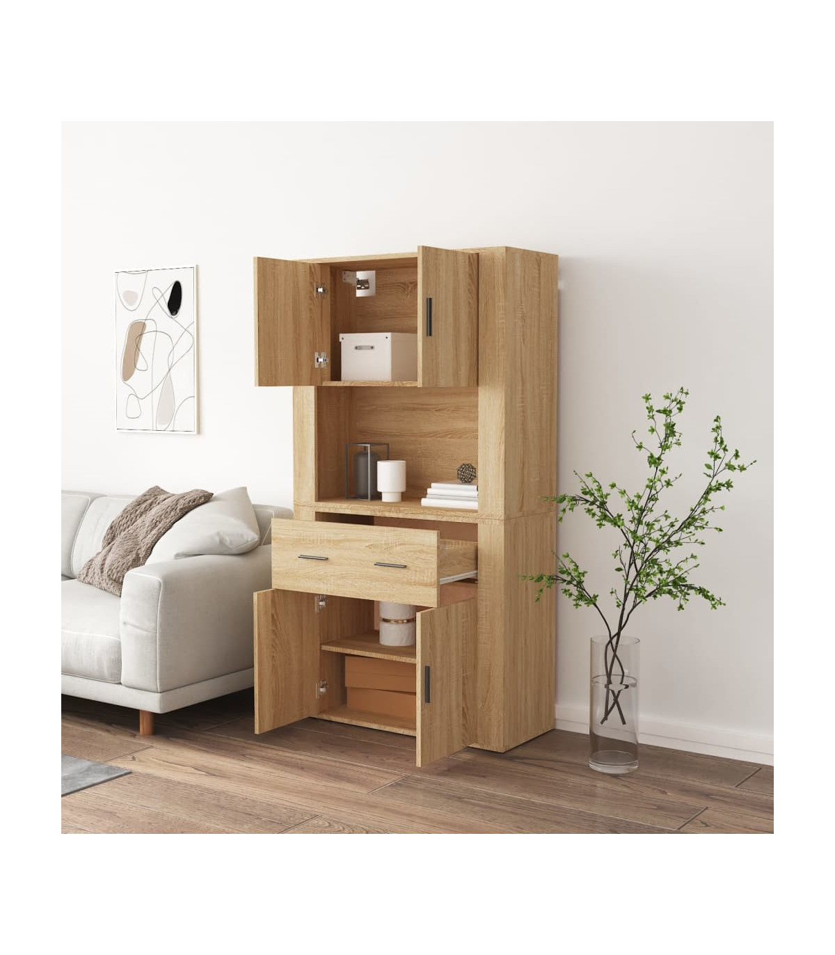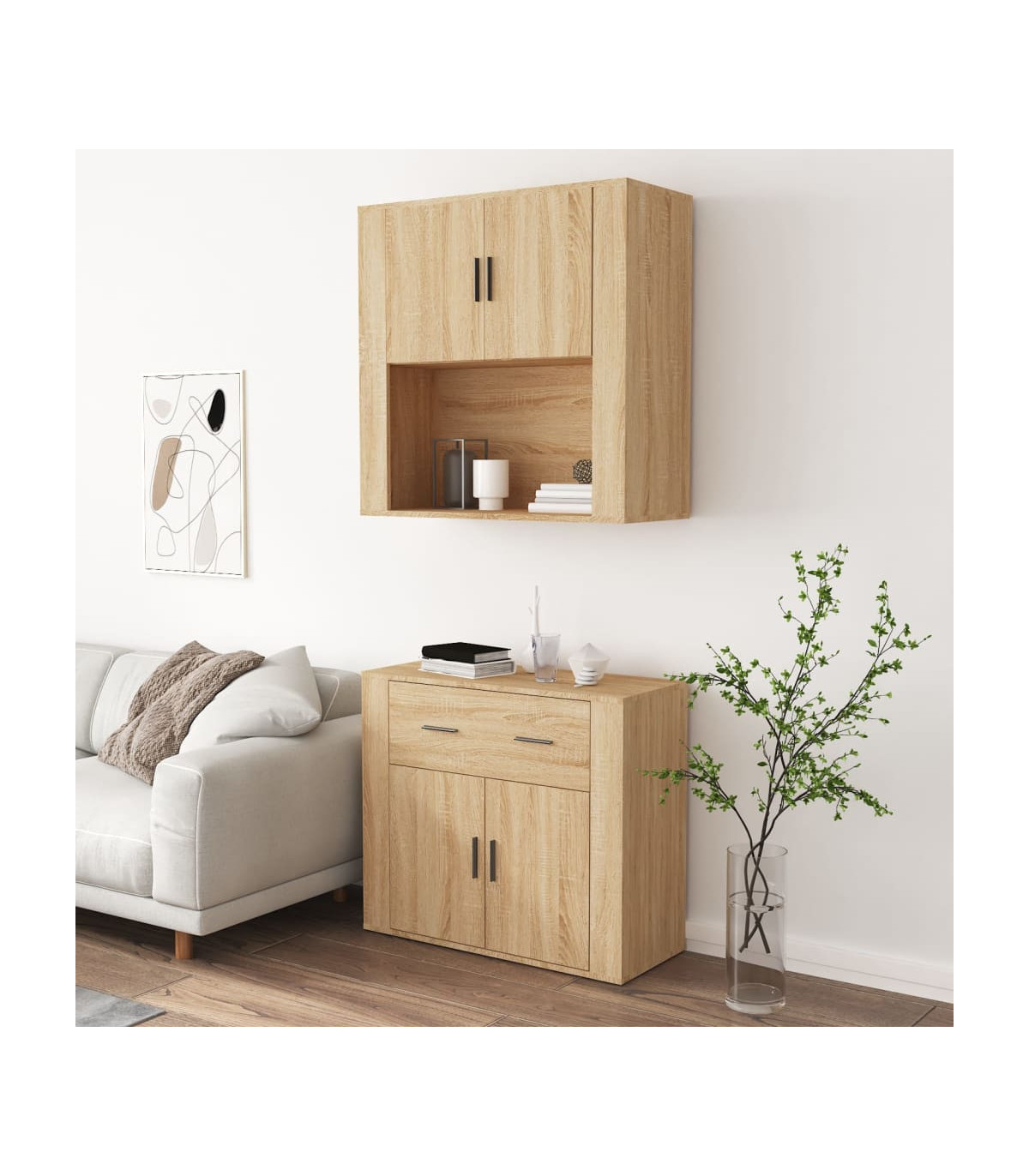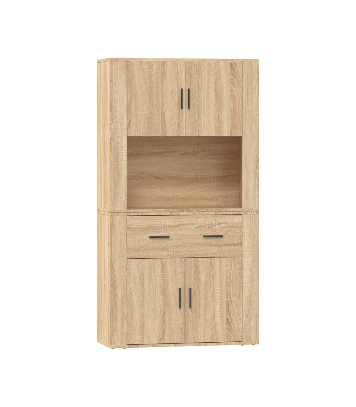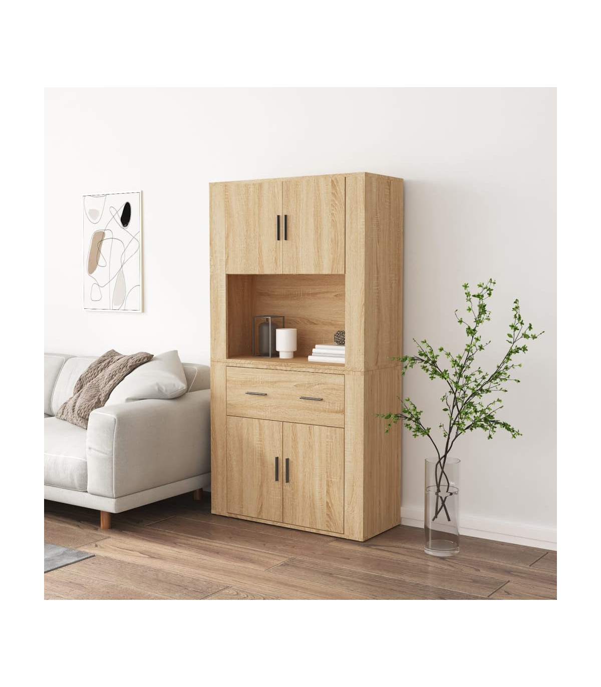 Are you hunting for a stylish highboard? This highboard adds a unique charm to your existing interior! Durable material: The engineered wood is of exceptional quality with a smooth surface and features strength, stability and resistance to moisture.Ample storage space: The sideboard offers ample storage space for keeping your various daily essentials well organised and within easy reach.Wall-mounted function: The storage cabinet can be wall-mounted on the top of the sideboard to create a highboard, which saves floor space. That way, you can maximise your living space and keep the area clean and tidy. Good to know:To make assembly as easy as possible, each product is delivered with a manual.Screws and plugs for inside the wall are not included. We advise to find and use screws and plugs suitable specifically for your walls. If you're not sure, you can consult with a professional. Please read and follow each step of the instructions. Warning:To prevent it being overturned, this product must be used with the provided wall attachment device.