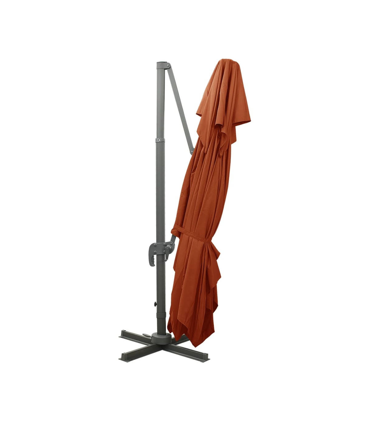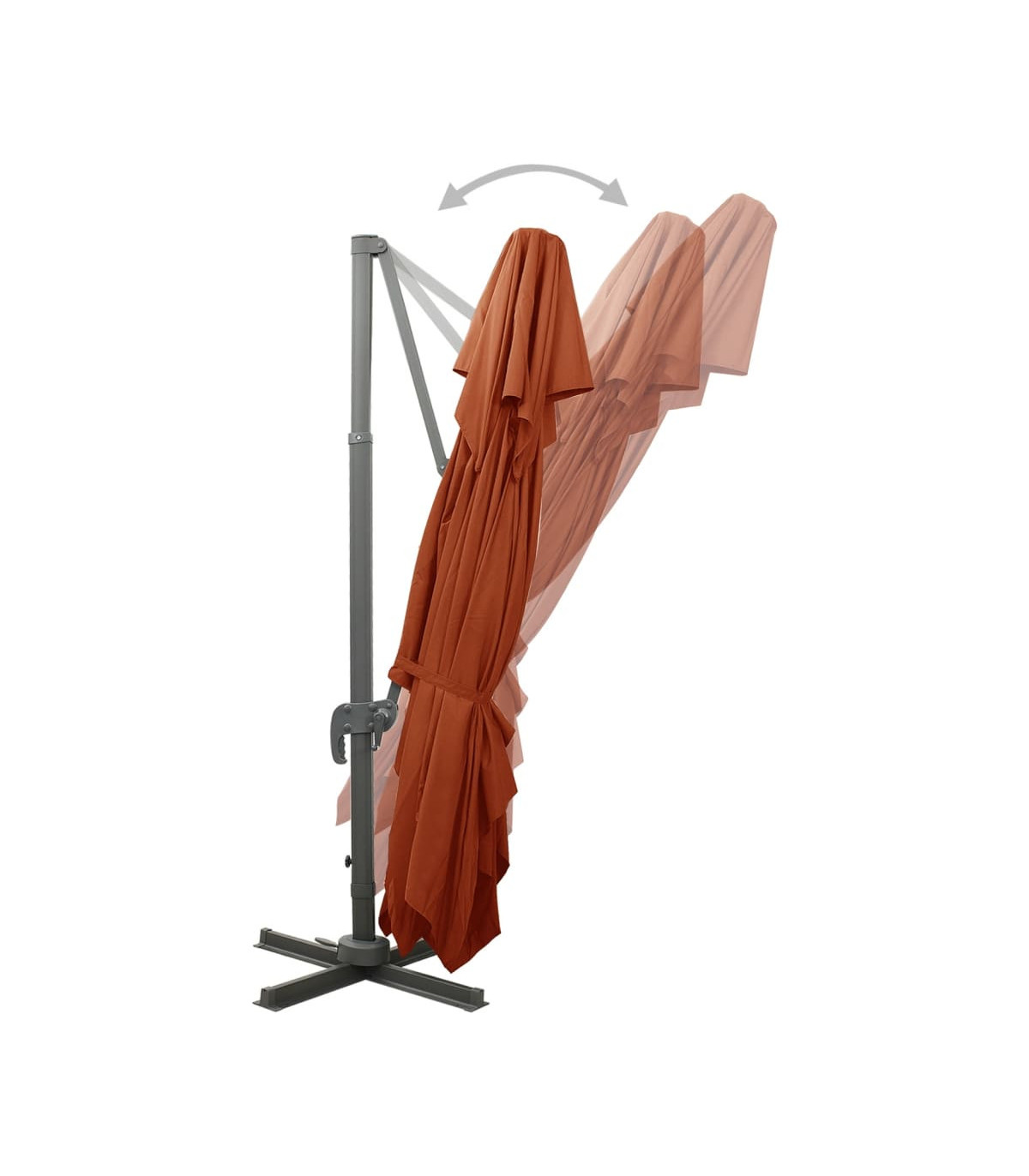 This cantilever umbrella is perfect to create some shade and protect you from the sun's harmful UV rays. Made of UV protective and anti-fade polyester, the parasol cover provides you with optimum protection against the sun and is easy to clean. It features a sturdy cross base to add stability. The exclusive design of this parasol allows you to tilt and rotate it in 360 degrees to block the sun. The strong aluminium pole, along with the 8 ribs, makes the parasol very stable and durable. This garden umbrella can be easily opened and closed thanks to the crank mechanism. Additionally, the double-top design canopy helps ventilation. Please note that we recommend treating the umbrella fabric with a waterproofing spray if it is subjected to heavy rainfall.