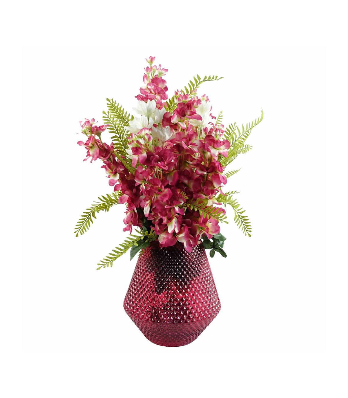 Pack of 6 x Dark Pink Delphinium with silk petals. Can be used to make arrangements with our other artificial flowers or as decorations on their own. Each stem measures 75cm overall height x 10cm wide x 10 deep with an array of flowers and leaves. Flowers are silk. These are easy to cut down shorter using a pair of wire cutters if required. Some of our photos show vases to give an idea of size and possibilities for arrangement but no vases or planters are included with these flowers.