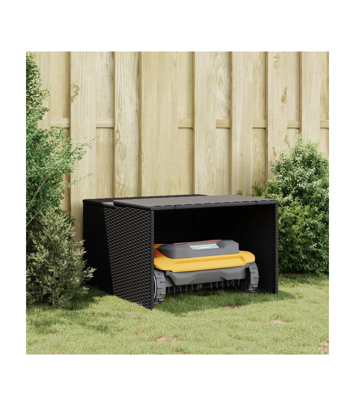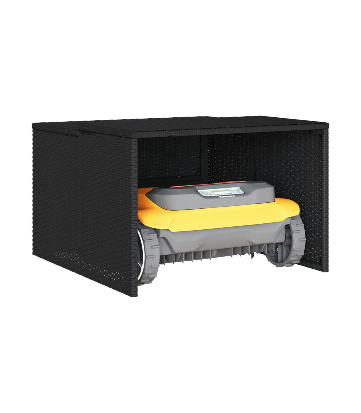 This robot mower garage is the ideal parking place to station your garden robotic mower when it is not in use. Durable material: PE rattan, also known as poly rattan, is a strong, low-maintenance synthetic material that looks like natural rattan. It's lightweight, easy to clean, and commonly used for outdoor products due to its durability and weather-resistant properties.Weather protection: This robotic lawn mower garage provides the perfect protection for your lawn robot, shielding it from the elements including rain, hail, and UV light. Also, thanks to the sloping top design, rainwater and snow can simply flow down.Multifunctional: Whether it's on a lawn, paved surface, or concrete foundation, this lawn mower storage shed can be easily placed on any flat surface with the included mounting accessories.Robust and stable frame: The powder-coated steel frame ensures the sturdiness and stability of the outdoor lawn mower storage.
