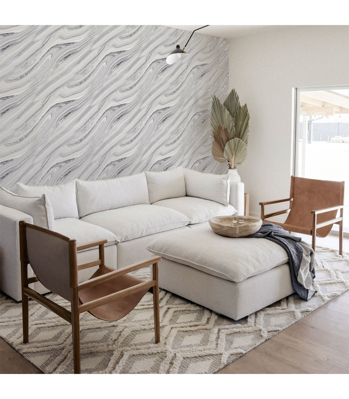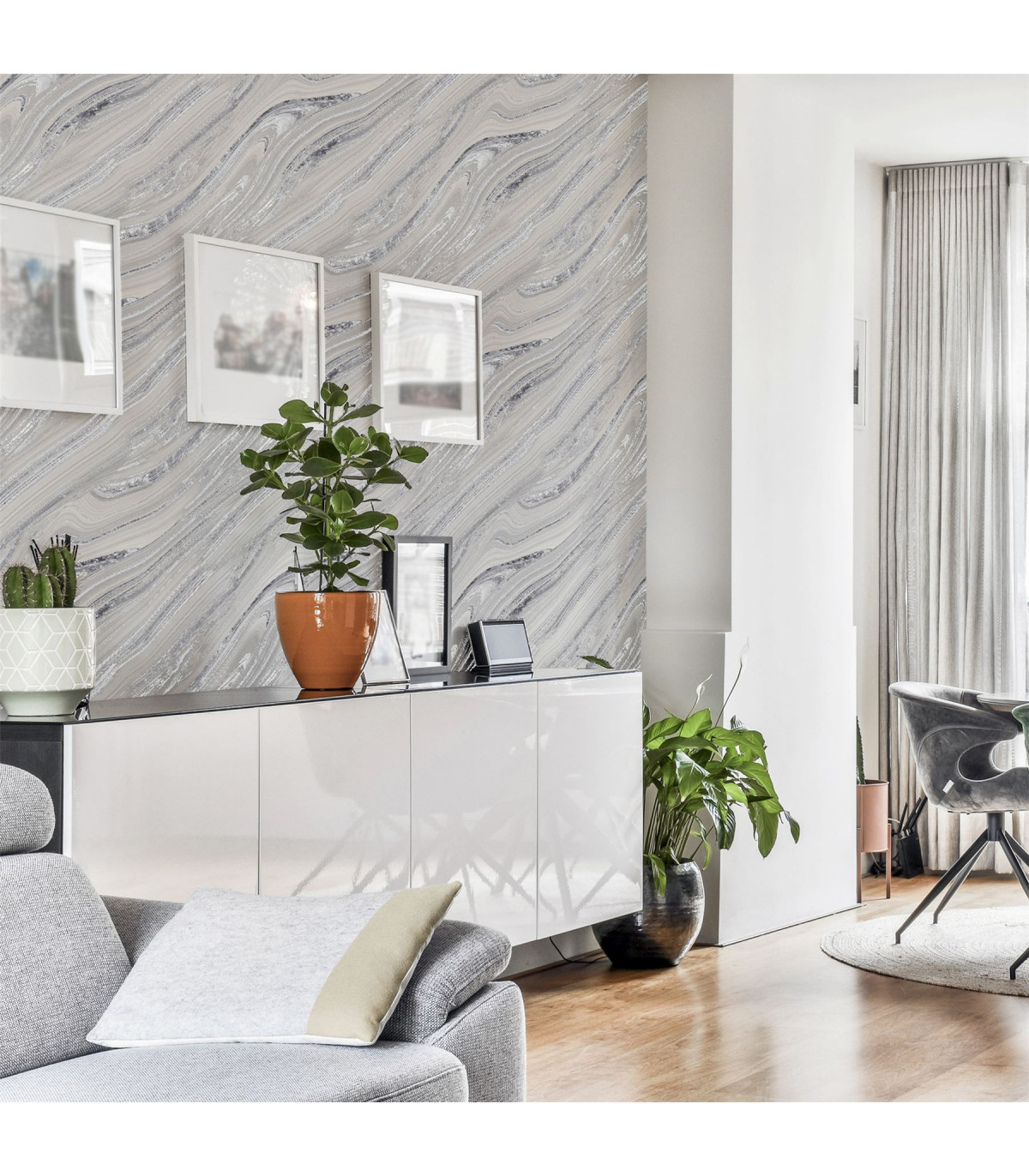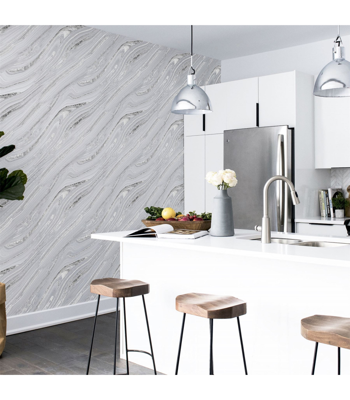 Add an artistic flare to your living space with this contemporary mineral effect wallpaper. Featuring the grains from mineral rock formations with encased glitter in a silver colour tone is truly a stunning design. This wallpaper is perfect to use for a feature wall in any home. Hanging Method: Paste the Paper Pattern Match: Straight Match Pattern Repeat: 53cm