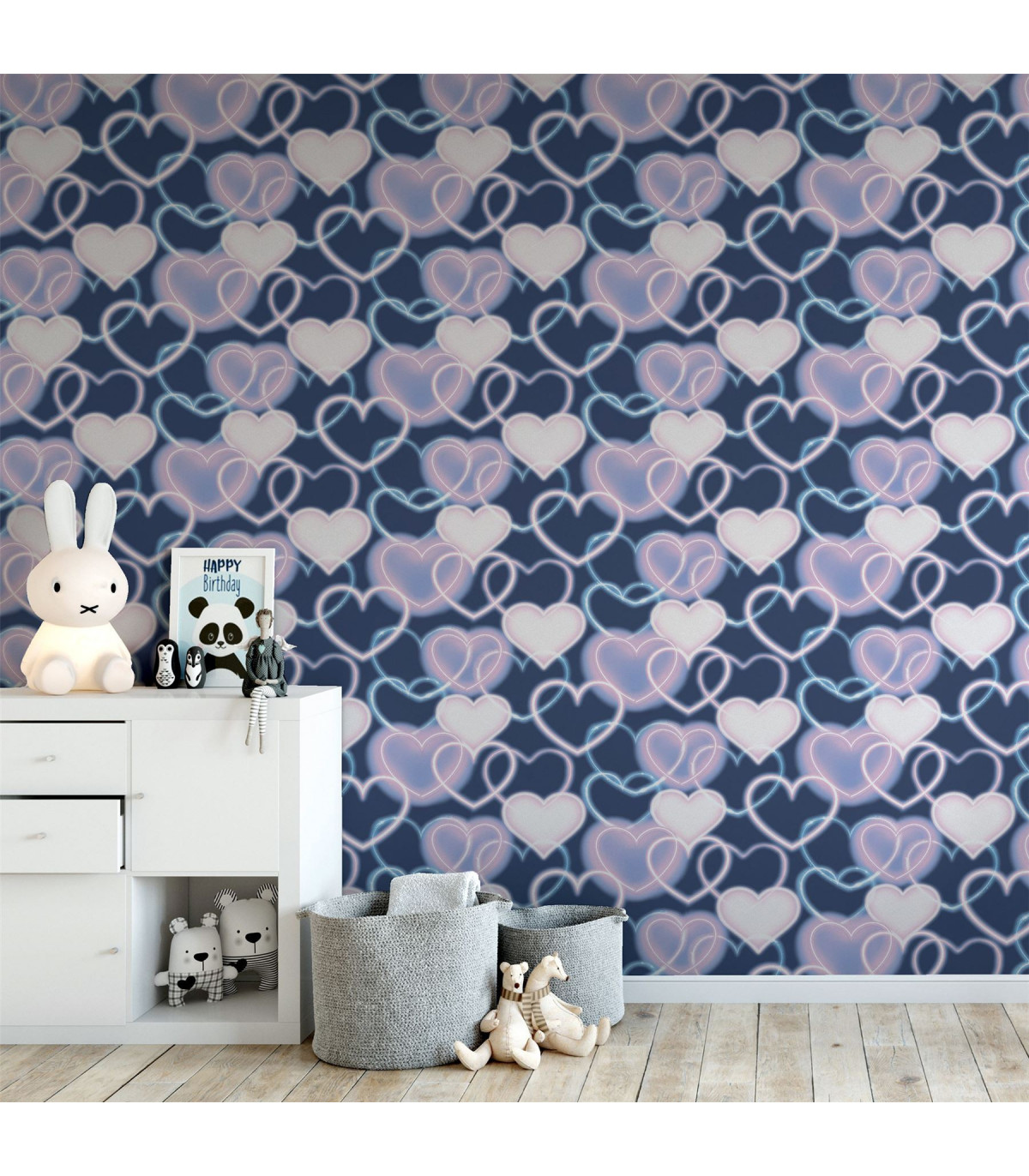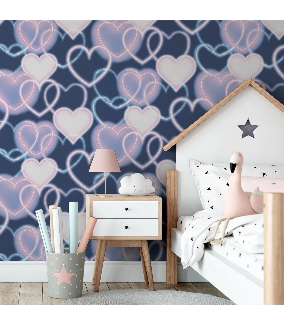 This wallpaper has been designed with love, this heart wallpaper is filled with the cool neon style hearts to give a fun and noughties vibe. Pink hearts are set on a navy background. This heart print wallpaper is perfect for a teens room. Hanging Method: Paste the Paper Pattern Match: Off Set 26.5cm Pattern Repeat: 53cm