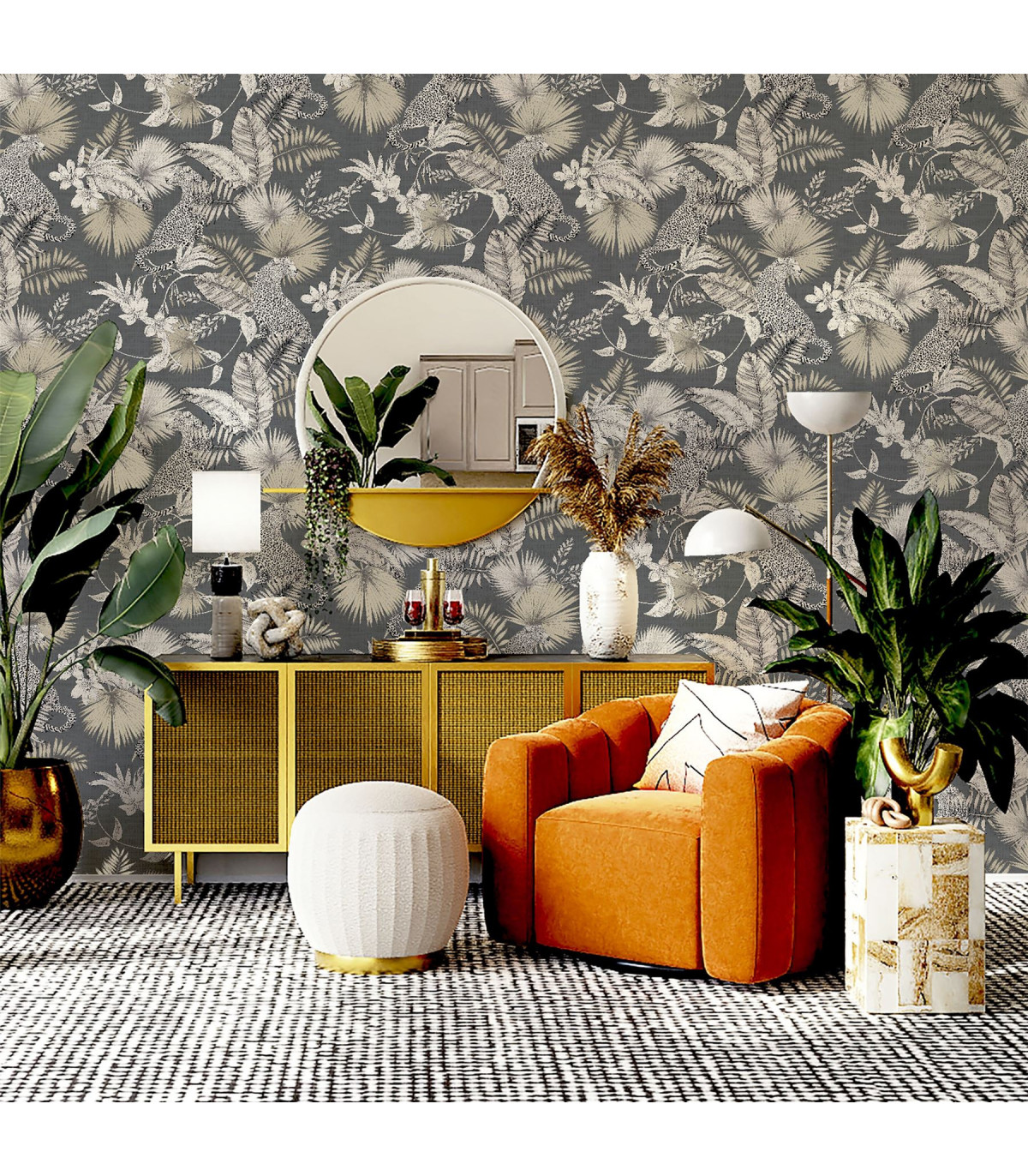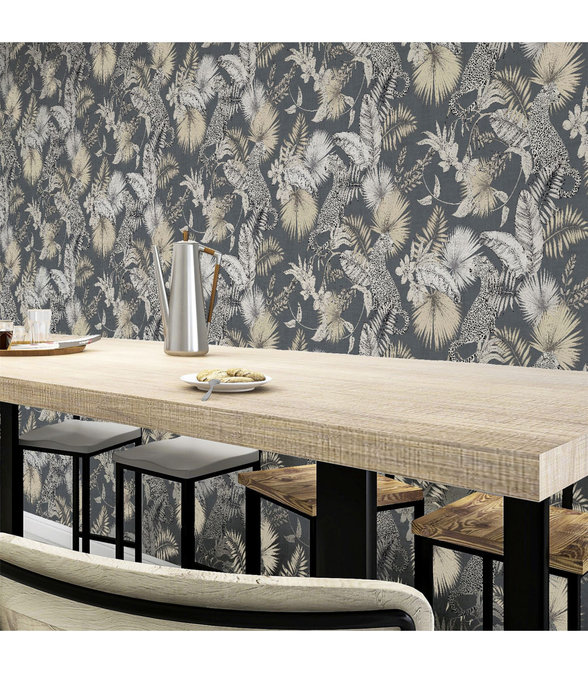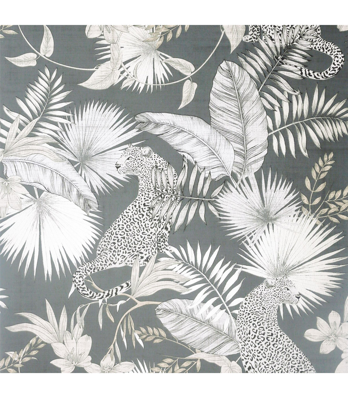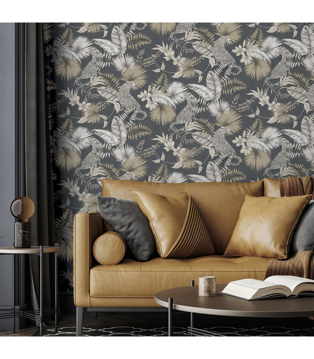 This Jungle themed Leopard Wallpaper will bring a stylish exotic touch to your home. The jungle scene features majestic leopards and tropical foliage in neutral tones with a soft metallic sheen, making this wallpaper a perfect choice for a feature wall of your home. This wallpaper is set on a modern dark background for a dramatic and striking look and is easy to apply and would look great in a living room, bedroom, or a hallway. Hanging Method: Paste the Paper Pattern Match: Off Set 26.5cm Pattern Repeat: 53cm