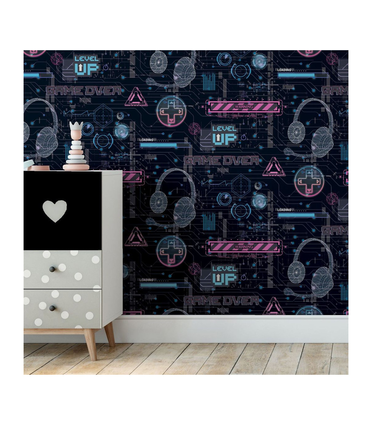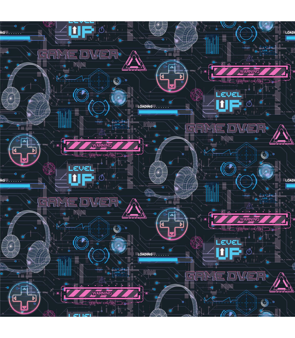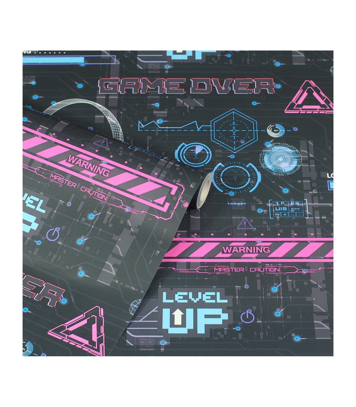 Bring a gamers imagination to life with this video glitch wallpaper. This design features gamer style graphics and neon style signs in multiple colours throughout. This wallpaper is perfect for any gamer in your home and has a matrix inspired vibe to it. Perfect for boys rooms, play rooms, dens or even offices.  Hanging Method: Paste the Paper Pattern Match: Off Set 26.5cm Pattern Repeat: 53cm