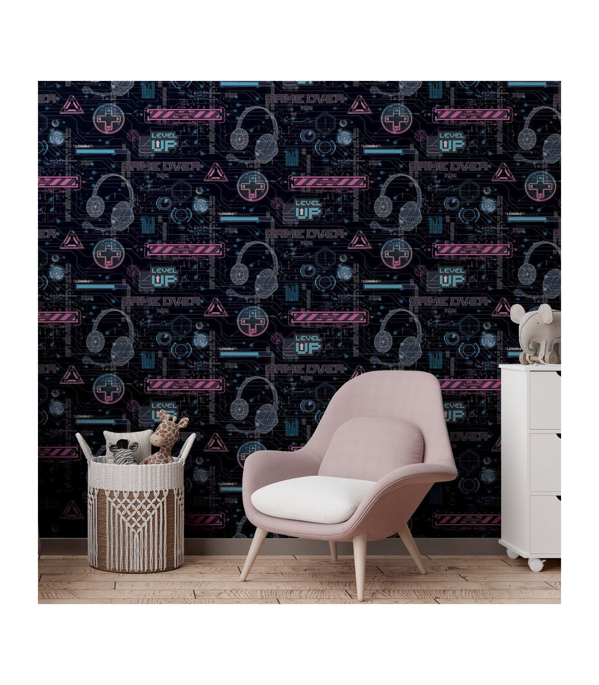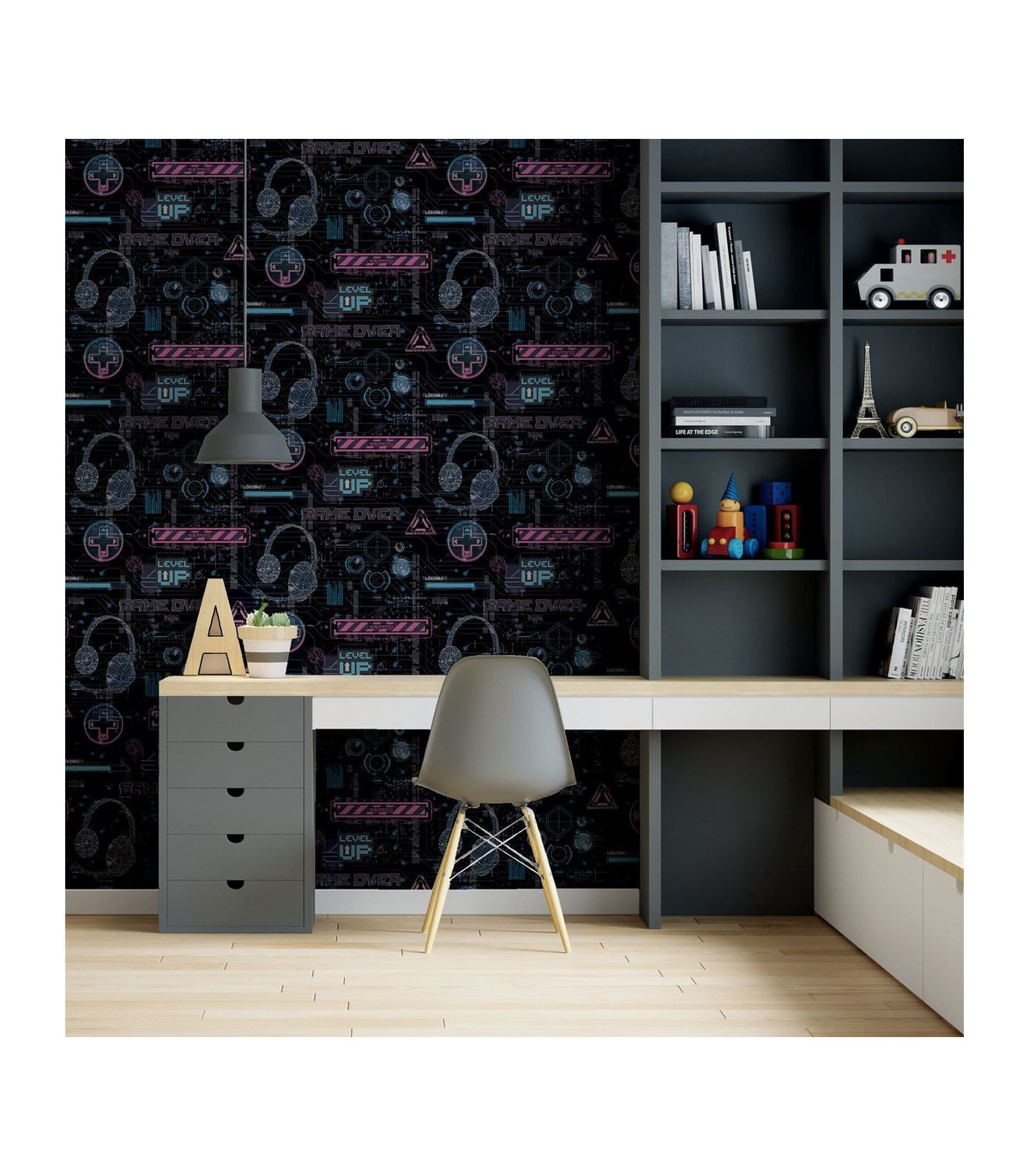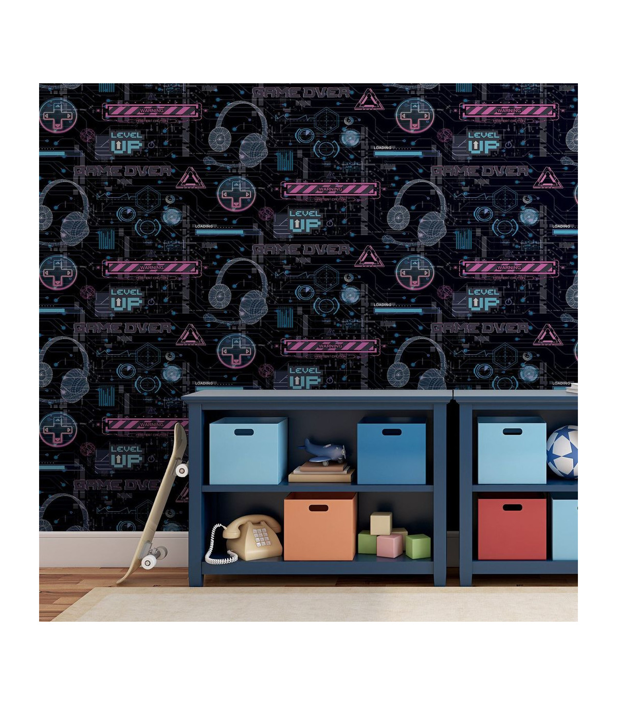 Bring a gamers imagination to life with this video glitch wallpaper. This design features gamer style graphics and neon style signs in multiple colours throughout. This wallpaper is perfect for any gamer in your home and has a matrix inspired vibe to it. Perfect for boys rooms, play rooms, dens or even offices.  Hanging Method: Paste the Paper Pattern Match: Off Set 26.5cm Pattern Repeat: 53cm