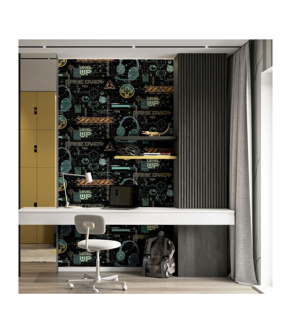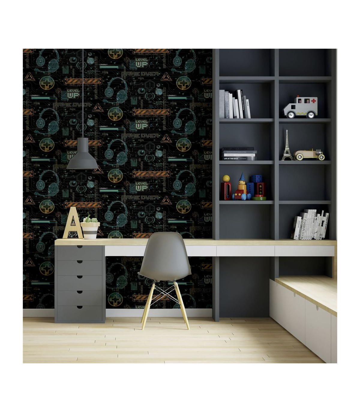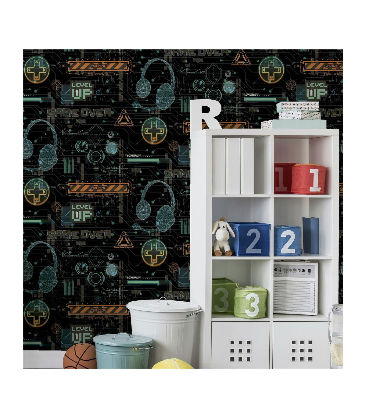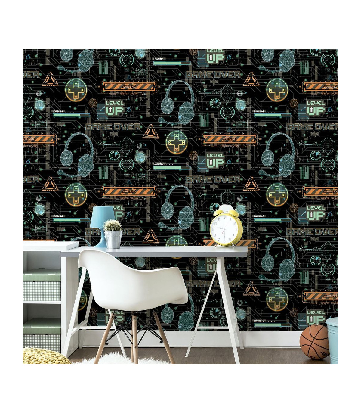 Bring a gamers imagination to life with this video glitch wallpaper. This design features gamer style graphics and neon style signs in multiple colours throughout. This wallpaper is perfect for any gamer in your home and has a matrix inspired vibe to it. Perfect for boys rooms, play rooms, dens or even offices.  Hanging Method: Paste the Paper Pattern Match: Off Set 26.5cm Pattern Repeat: 53cm