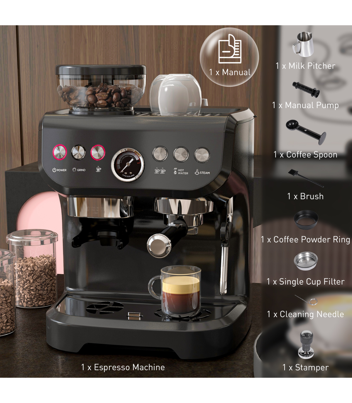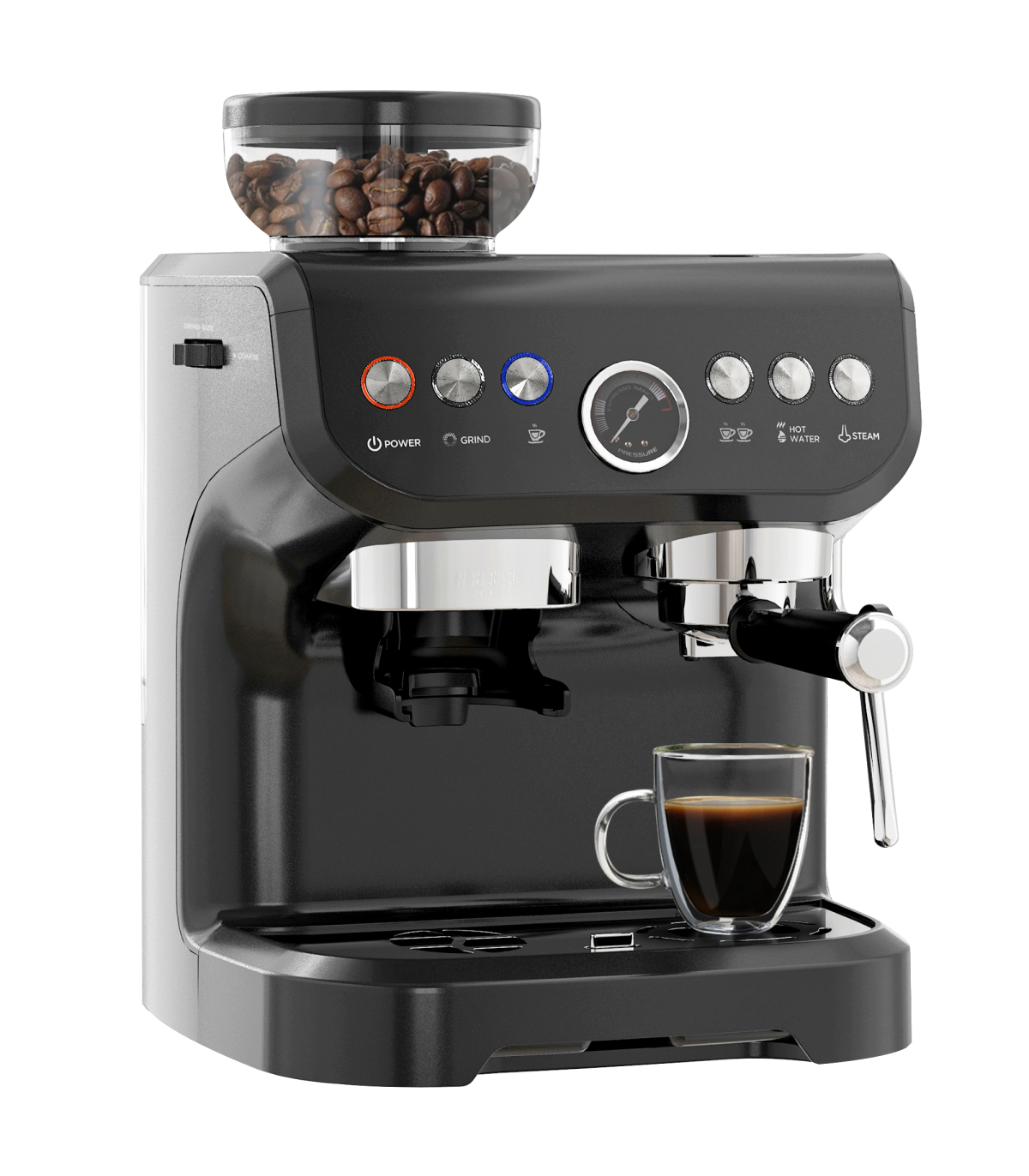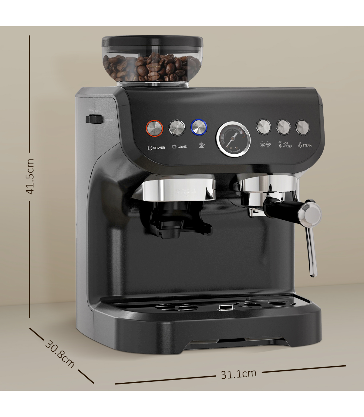 Espresso Coffee Machine w/ Integrated Bean Grinder & Steam Wand 15 Bar Pressure