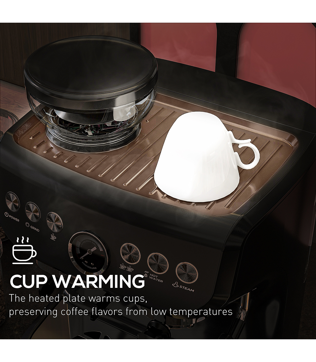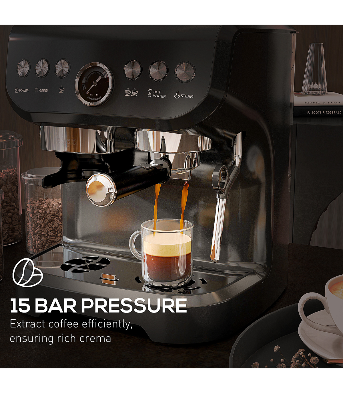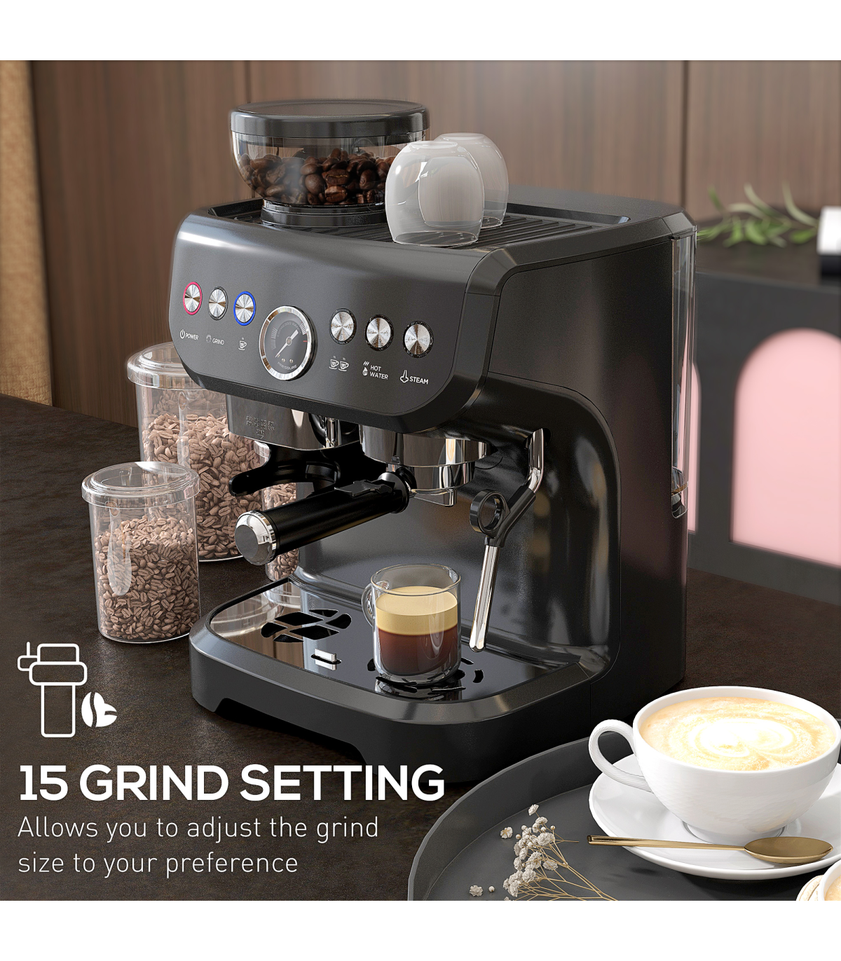 Create professional coffee, all in your own home with this HOMCOM automatic coffee machine. Look to the steam wand for frothy milk, with the 15 grind options giving you plenty of choice in how course or smooth you want the finish. With the 15 bar pressure, this coffee machine gives you a delicious beverage, everytime. Comes with all the parts you need.