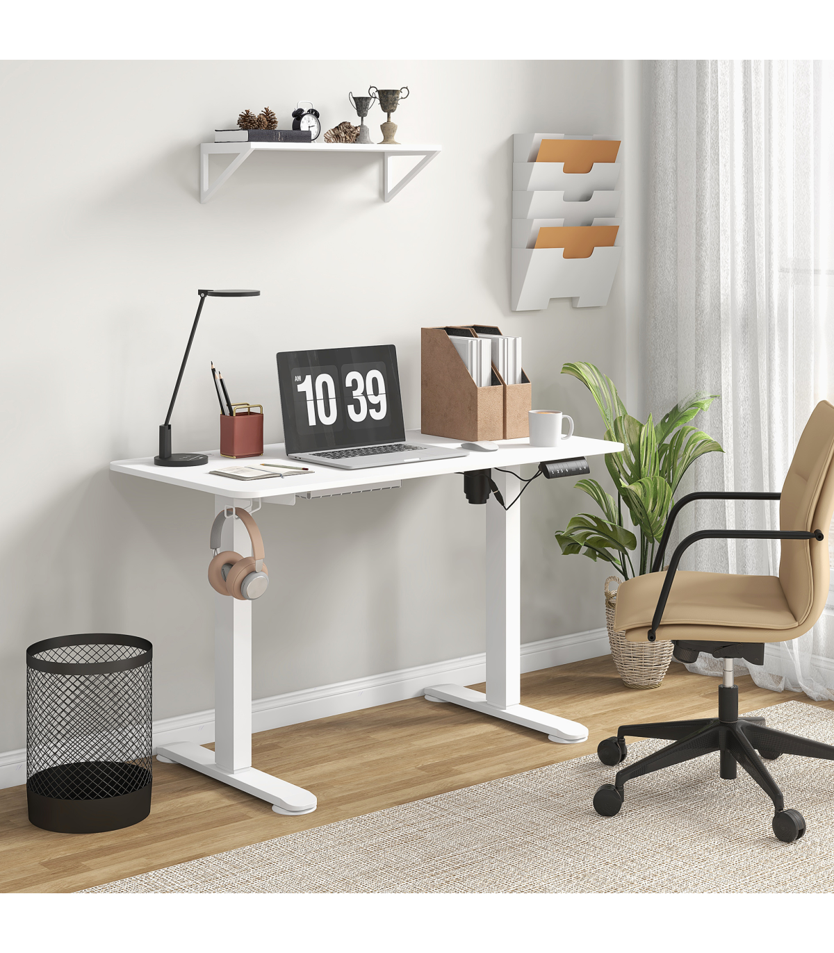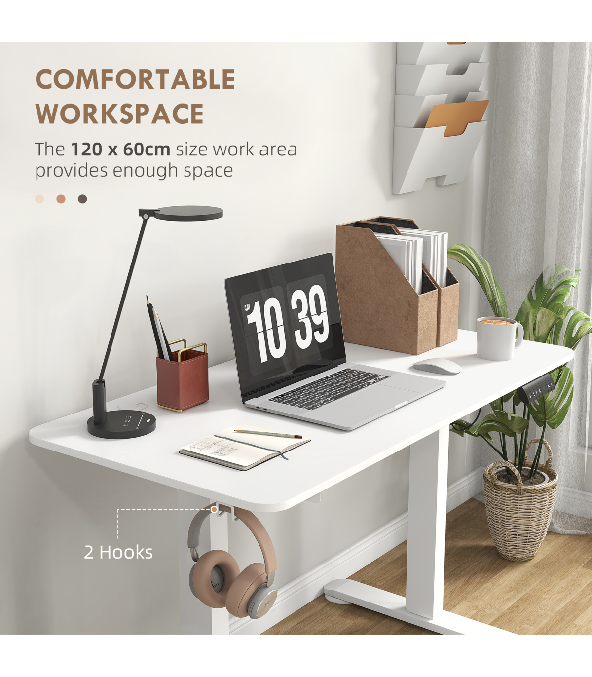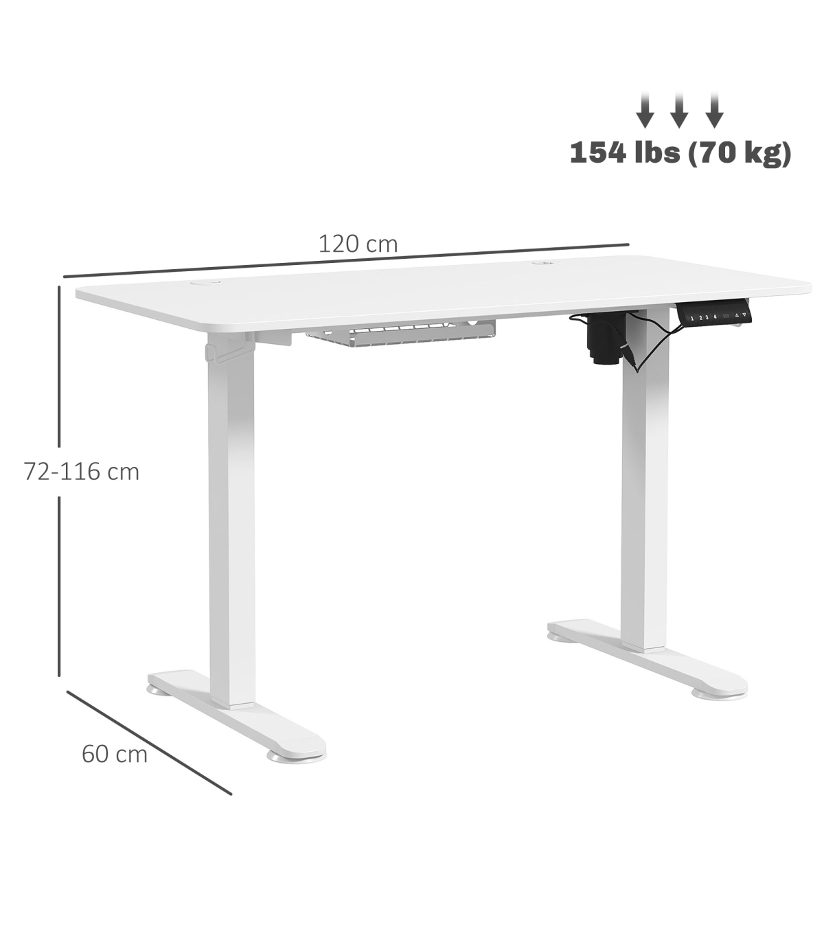 ● 72-116cm adjustable height: use sitting to standing. Four handy memory presets; ● 120 x 60cm tabletop gives you plenty of working room; ● Cable hole and box to keep all wires together. Helps avoid mess; ● Collision avoidance system and overheat protection ensure security; ● Powder coated steel frame for a strong core, with handy adjustable feet; ● Maximum load 70kg, assembly required; ● Colour: White; ● Materials: Particleboard, Steel; ● Overall Dimension: 120W x 60D x 72-116Hcm; ● Adjustment Speed: 32mm/s; ● Power Cord Length: 2m; ● Weight Capacity: 70kg (total), 10kg (each hook); ● Input: 100-240V, 50/60HZ; ● Output: 29V/1.8A, 52.2W; ● Item Label: 838-427V70WT;