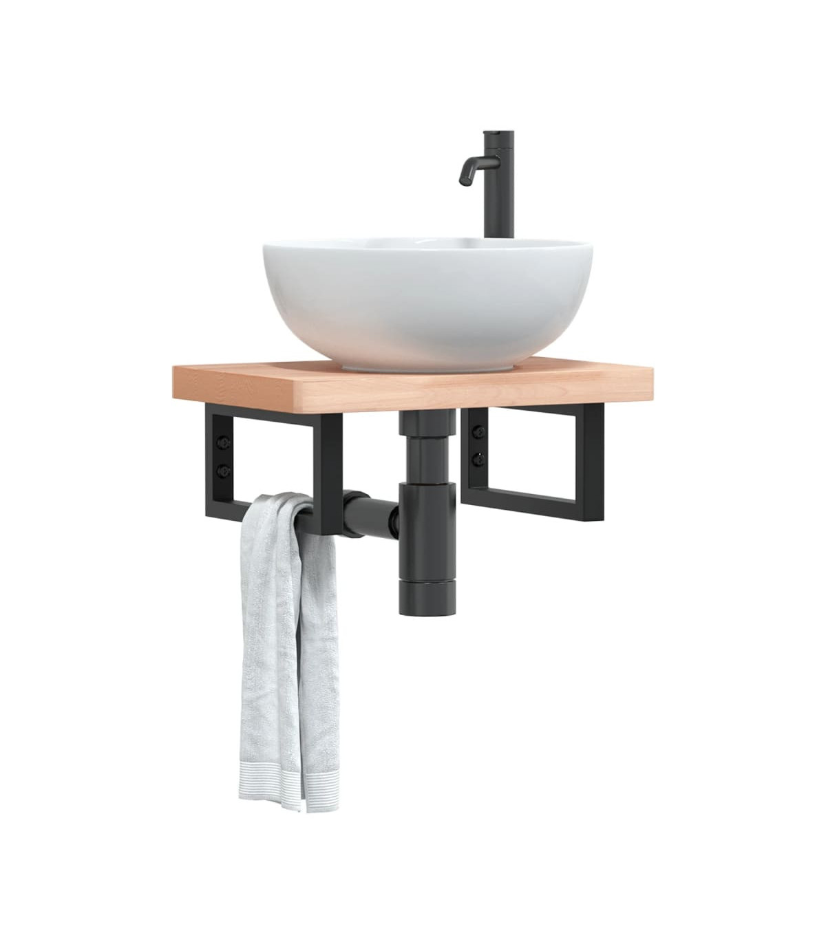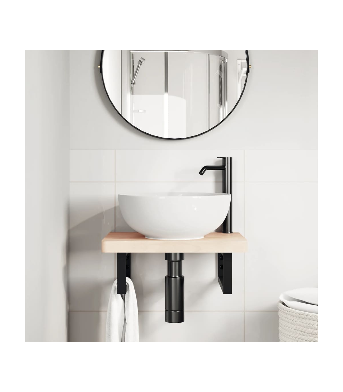 The wall mounted basin shelf securely attaches to the wall, providing an elegant and space-saving solution for your bathroom. Sturdy and long-lasting: This basin shelf is combined with a steel structure and a solid beech wood top, making it sturdy, stable, and long-lasting. Space-saving: The floating basin shelf has ample space to store creams and small items. Thanks to the rectangular shape, you can hang towels or other things on the support to save space. Easy to use: The countertop comes undrilled to allow the basin to be mounted on the left, right, or in the centre, depending on your room's requirements. Thanks to the pre-drilled holes in the holder, it can be easily assembled with the tabletop and mounted on the wall. Wide applications: Thanks to its modern design, it provides additional space for various types of bathrooms. Good to know:Screws are not included, you can purchase the screws separately based on the information provided below. Wall attachment: 2 pcs M8 expansion screws per bracket Wooden top: 2 pcs M5x18 screws (T=2) or 2 pcs M5x20 screws (T=2,5/4cm) per bracket