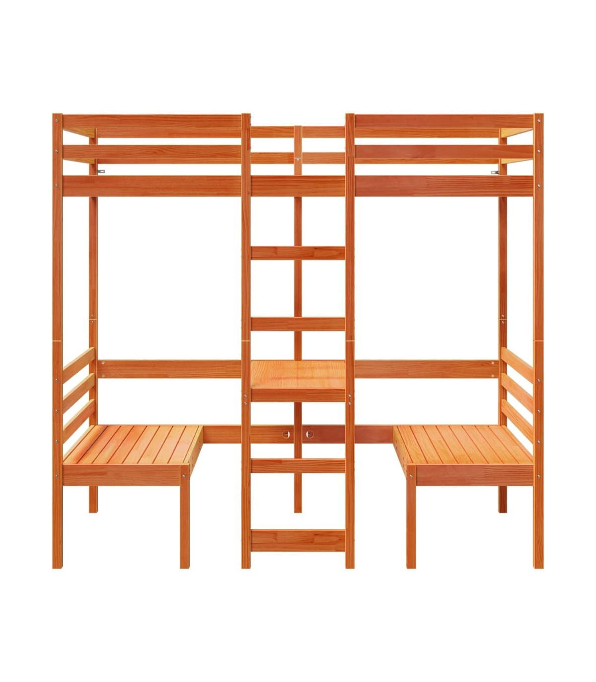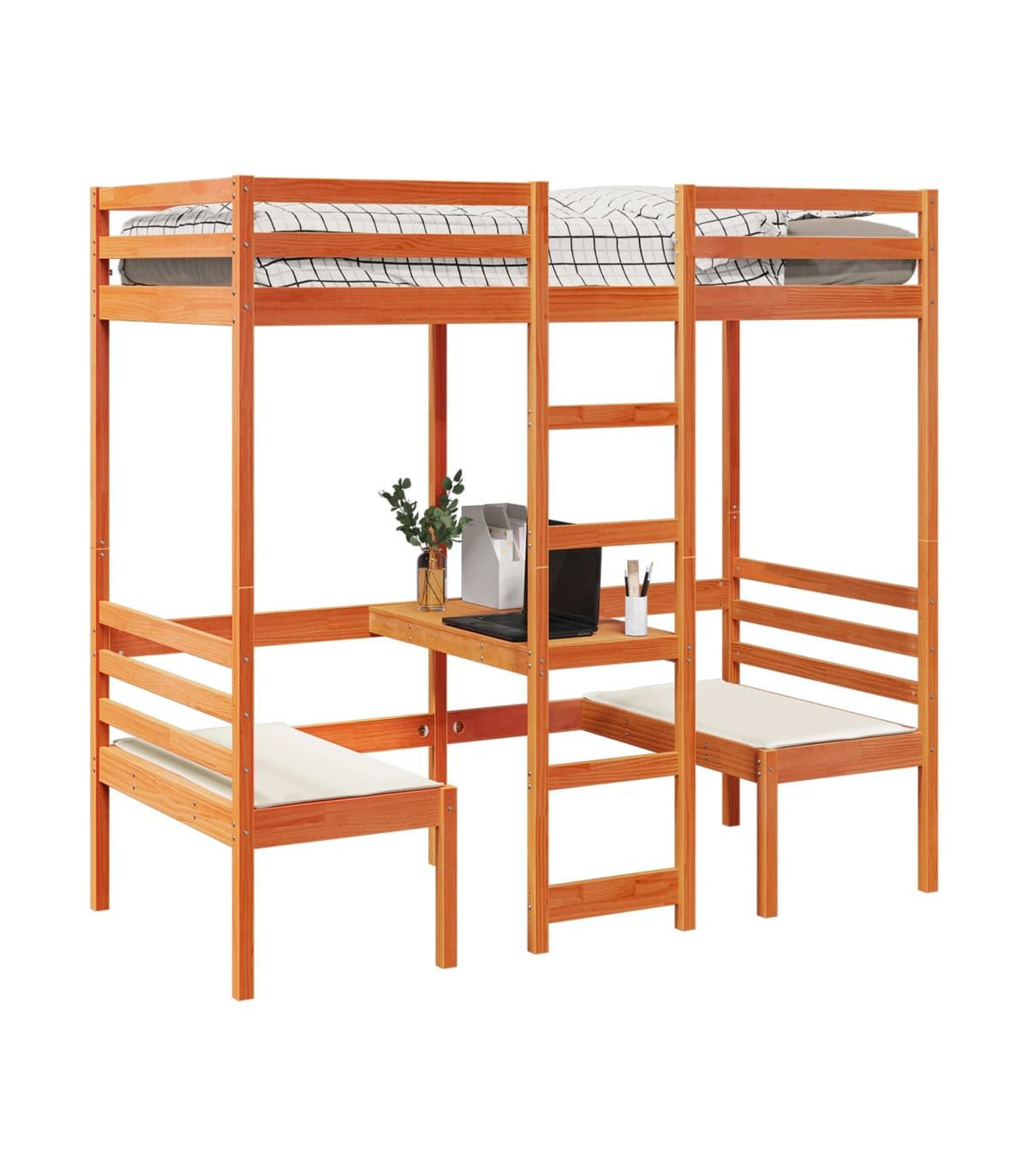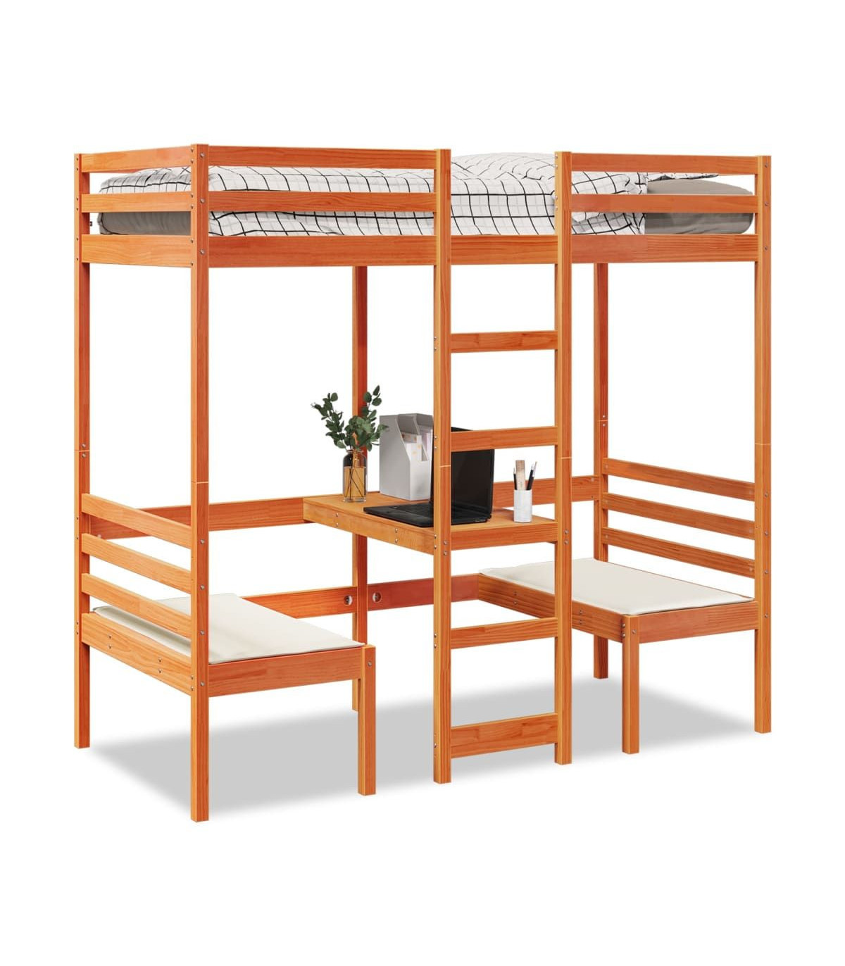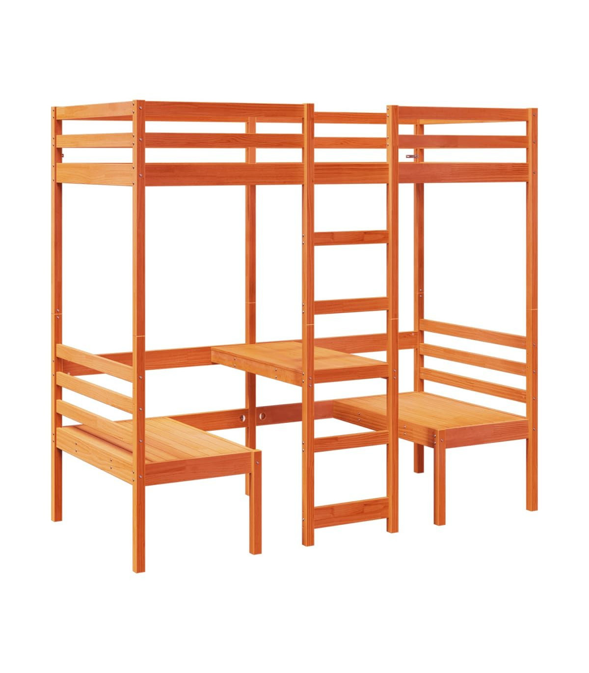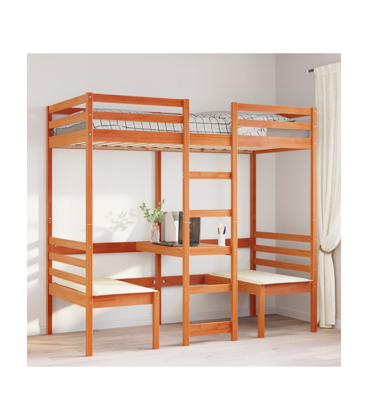 This versatile loft bed integrates a single bed with a desk and chairs, providing a cosy sleeping space, and a spacious work area. It is an ideal choice for homes with limited space.Stable and long-lasting frame: Solid pinewood is known for its strength and durability. Its straight grains and distinctive knots contribute to its rustic charm.Maximise space utilisation: This bed frame features a desk and two chairs underneath, effectively utilising the under-bed space to provide a cosy space for working and studying. It is an ideal choice for smaller or more confined areas.Easy to climb up and down: This bed frame features a built-in ladder, providing convenient access for users to climb up and down.Guardrails for enhanced safety: This bed frame is equipped with guardrails to prevent you from falling out of bed while sleeping.Slatted base for optimal support: The bed frame is equipped with a slatted base for support and breathability for your mattress.Warning:To prevent it from tipping over, this product must be used with the provided wall attachment device.Good to know:A mattress is not included with this bed. We do offer a various selection of mattresses. You can check our shop for a matching mattress.Screws and plugs for inside the wall are not included. We advise to find and use screws and plugs suitable specifically for your walls. If you're not sure, you can consult with a professional. Please read and follow each step of the instructions.
