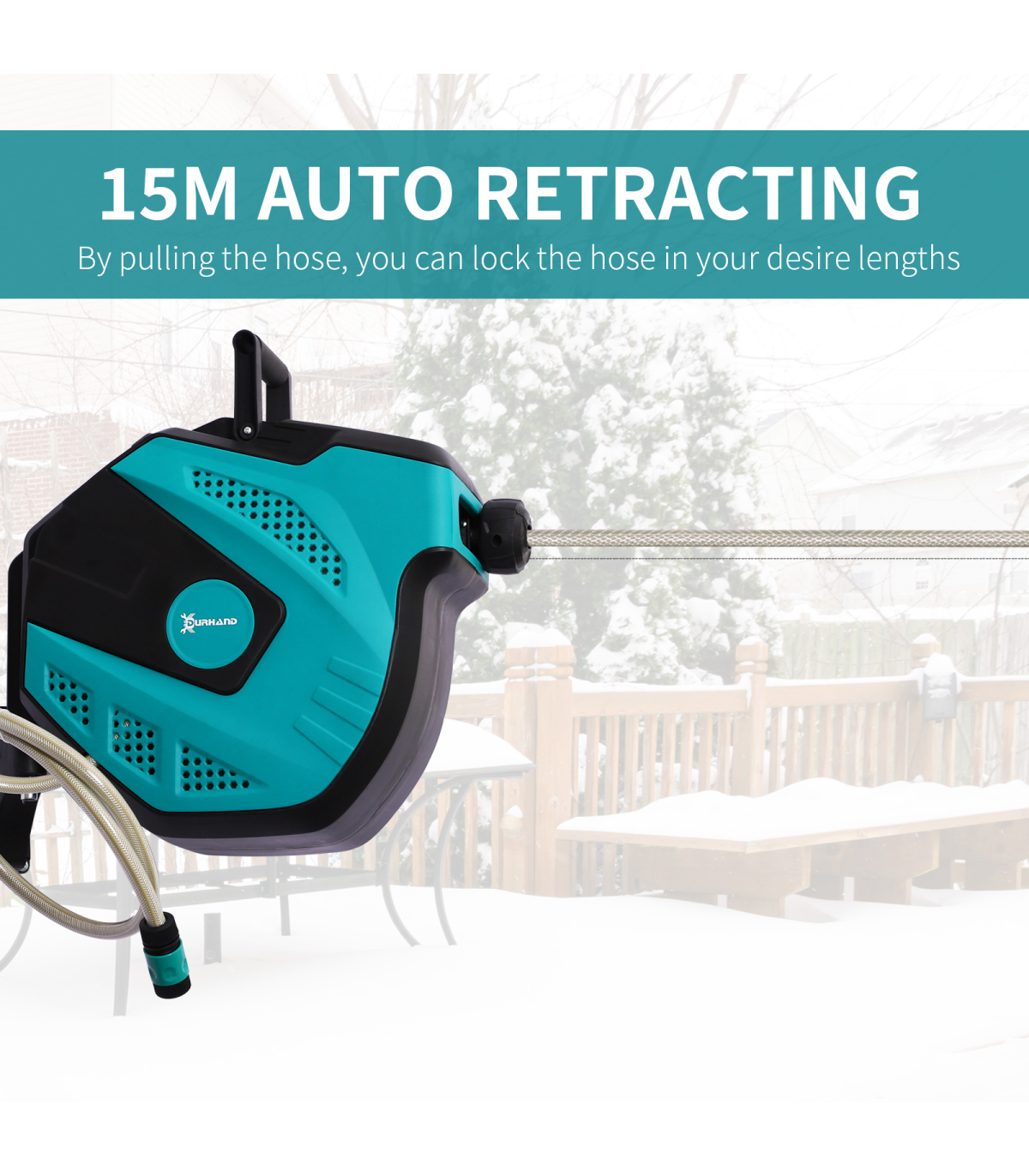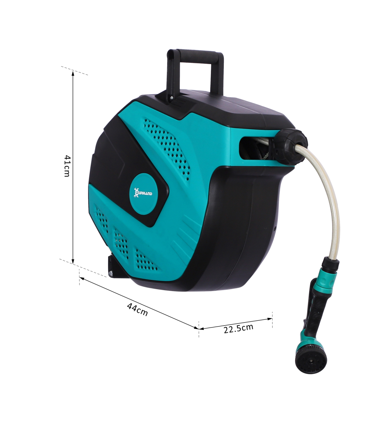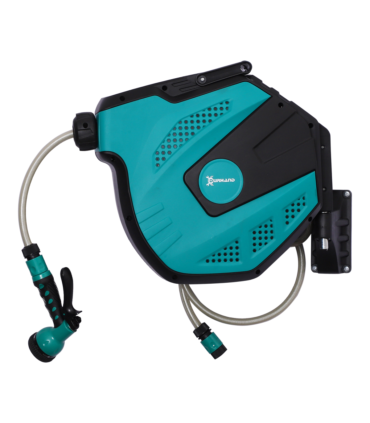 - DURHAND 15m Water Hose Reel-Black/Green - Description: - 15m water hose perfect for home and commercial use - High quality and impact resistant plastic construction to provide years of use - Auto guide rewind system for smooth and easy retraction - Seven different watering patterns and lockable hose for complete control - Ready assembled with a 180-degree swivel mounting bracket and accessories - Great for watering gardens, front lawns, patios and more.