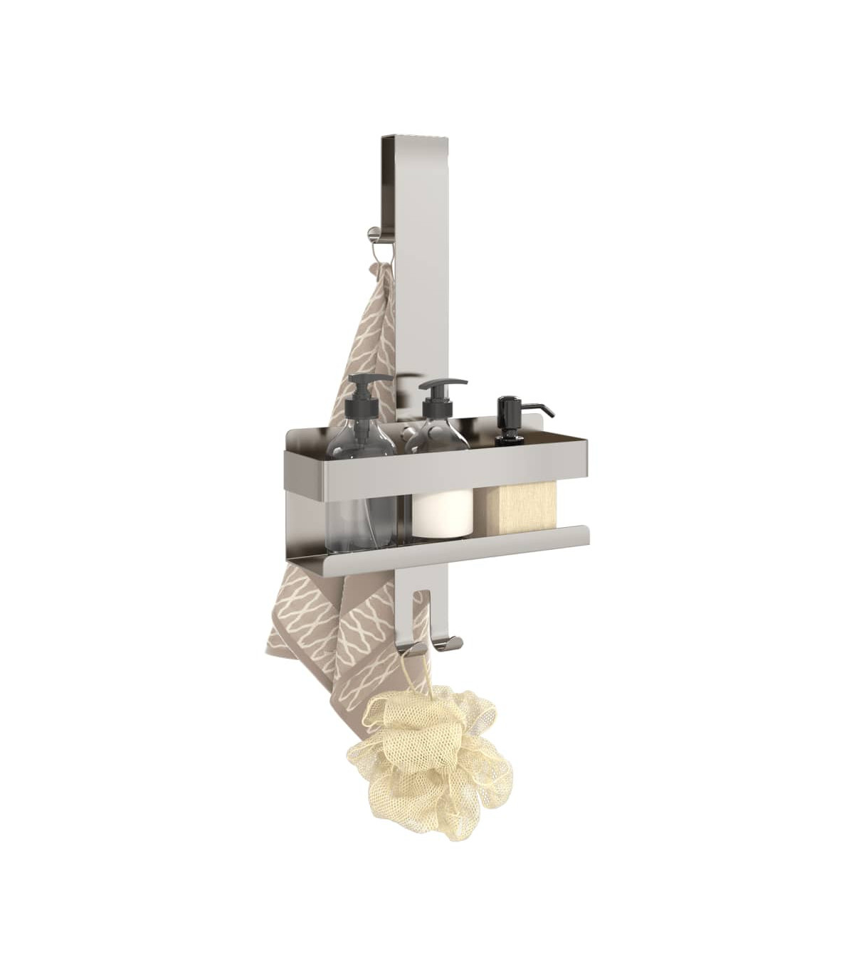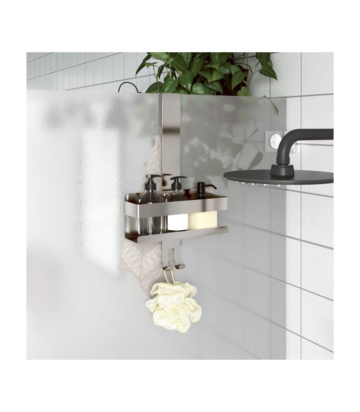 This hanging shower caddy is not only stylish but very functional, and will be a great choice for those in need of extra storage space. Long-lasting and durable material: Stainless steel is known for its resistance to corrosion, durability, low maintenance requirements, and sleek look, making it an ideal choice for various industries including construction and household products.Convenient 2-in-1 design: This hanging shower caddy offers a convenient storage solution for your shower essentials. You can hang towels and bathrobes on the external hooks and keep shower sponges and razors on the internal hooks for easy access.Ample storage space: The storage basket offers enough space for shower gel, soap, shampoo and other essentials.