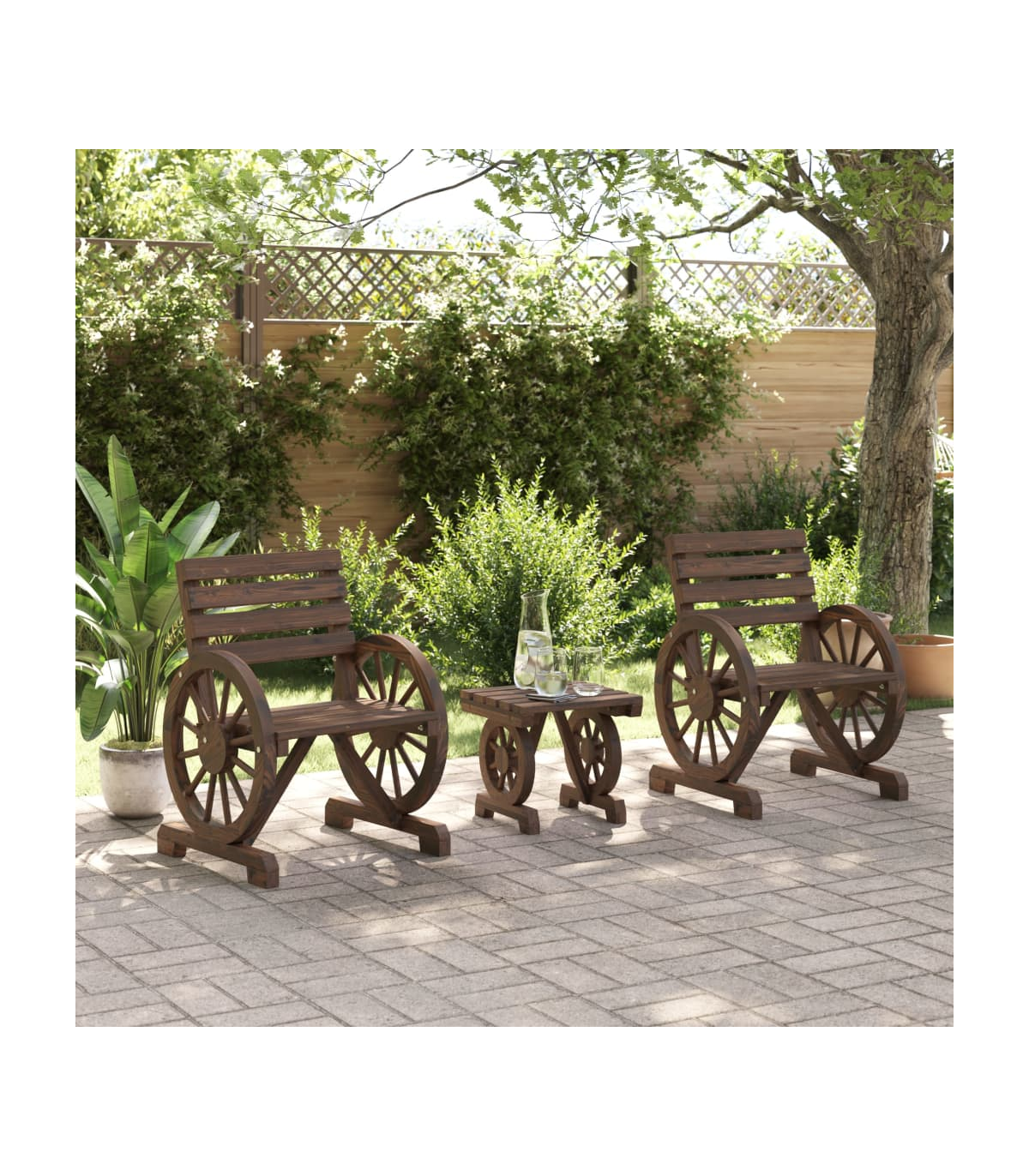Enjoy your leisure time with this wooden garden lounge set in Adirondack style. Solid fir wood: Solid fir wood is a beautiful and durable material that maintains its integrity even when exposed to moisture. It does not dry out or warp, making it a reliable choice.Comfortable seating: The garden lounge chair features an ergonomic seat and angled backrest for optimal seating comfort. Additionally, the wagon-wheel shaped armrests provide comfortable space to rest your arms.Practical table: The coffee table is perfect for placing your drinks, food and other decorative items. Good to know:To make sure your outdoor furniture stays beautiful, we recommend protecting it with a waterproof cover.