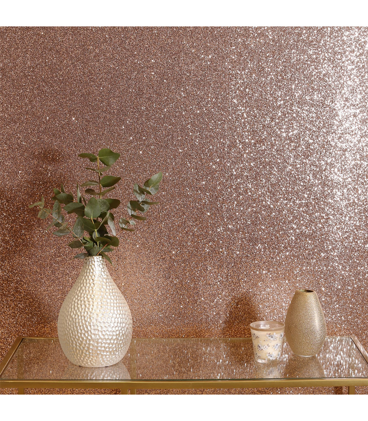Sparkly and shimmering, this sequin finish wallpaper in rose gold will bring maximum glitz to any space. Team it with painted walls, a striking patterned paper or even throughout a room for a fabulous effect. It really is a paper designed to turn heads. With a textured metallic finish, light bounces off in every direction, for glamour by day and by night. Hang it in a walk in wardrobe, cloakroom or feature wall for instant luxury. Suitable for most rooms except high moisture environments. Hanging Method: Paste the Wall Pattern Match: Free Match Pattern Repeat: N/A Roll Size: 6m x 0.53m.