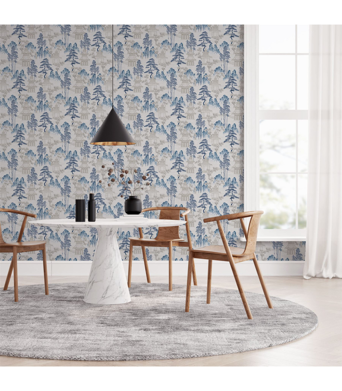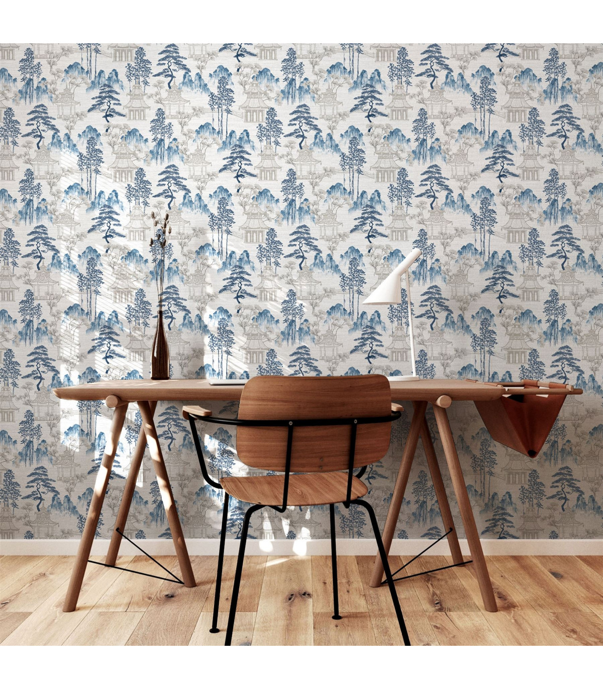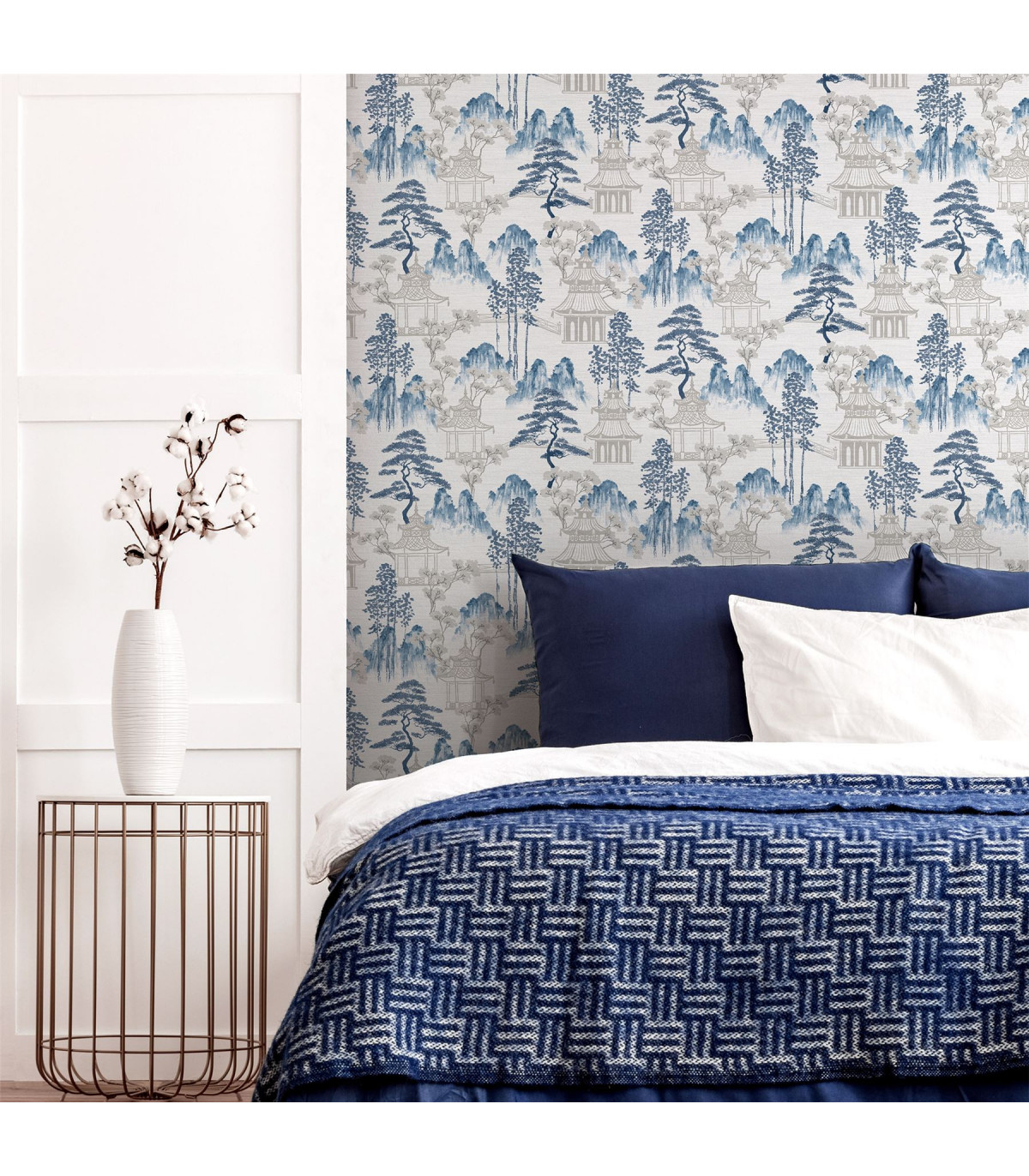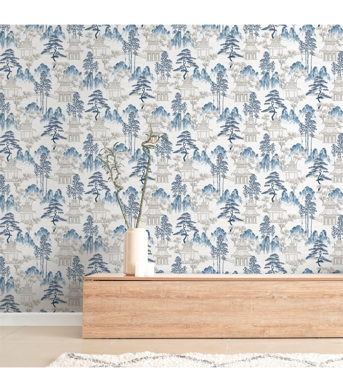 Our Japanese Pagoda features intricate watercolour elements that encapsulates the culture and scenery. Beautiful Blossoms, pagodas, and mountain scapes in shades of blue on an off-white background. A perfect wallpaper, for a feature wall, alcoves or for an entire room, in a living room, dining room or bedroom. Each roll of paper is design to give an elegant and clean look to any wall you choose to use it on. Hanging Method: Paste the Paper Pattern Match: Off Set 26.5cm Pattern Repeat: 53cm