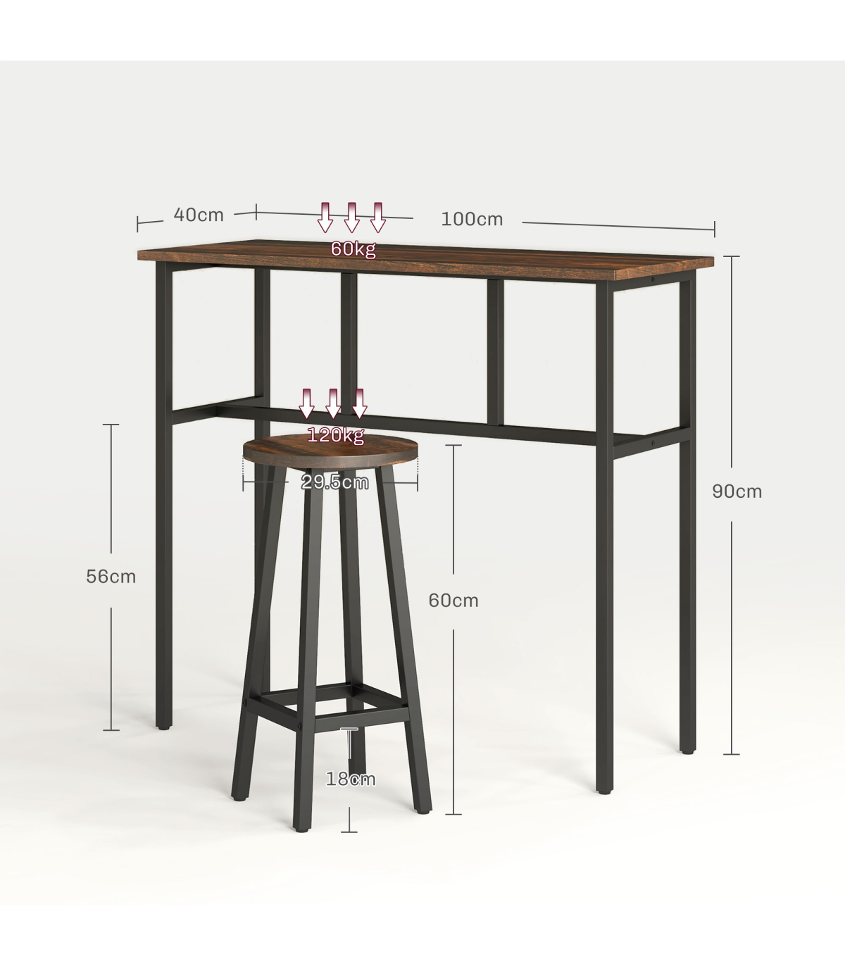 ● Classic and simple look blends well in a variety of stylish home setups; ● 6-piece set consists of 2 rectangular tables and 4 barstools; ● The tables can be placed against a wall or can even be paired together; ● Stools can be located under the table to save space; ● Particle board top ensures easy cleaning, while steel frame adds to its sturdiness and stability; ● Ideal for bar area, dining rooms, kitchens, and where space is limited; ● Required assembly; ● Colour: Rustic Brown; ● Material: Particle board, Steel; ● Overall Dimensions: 100L x 40W x 90Hcm (table), 29.5W x 29.5D x 60Hcm (stool); ● Weight Capacity: 60kg (table), 120kg (stool); ● Item Label: 835-678V00RB;