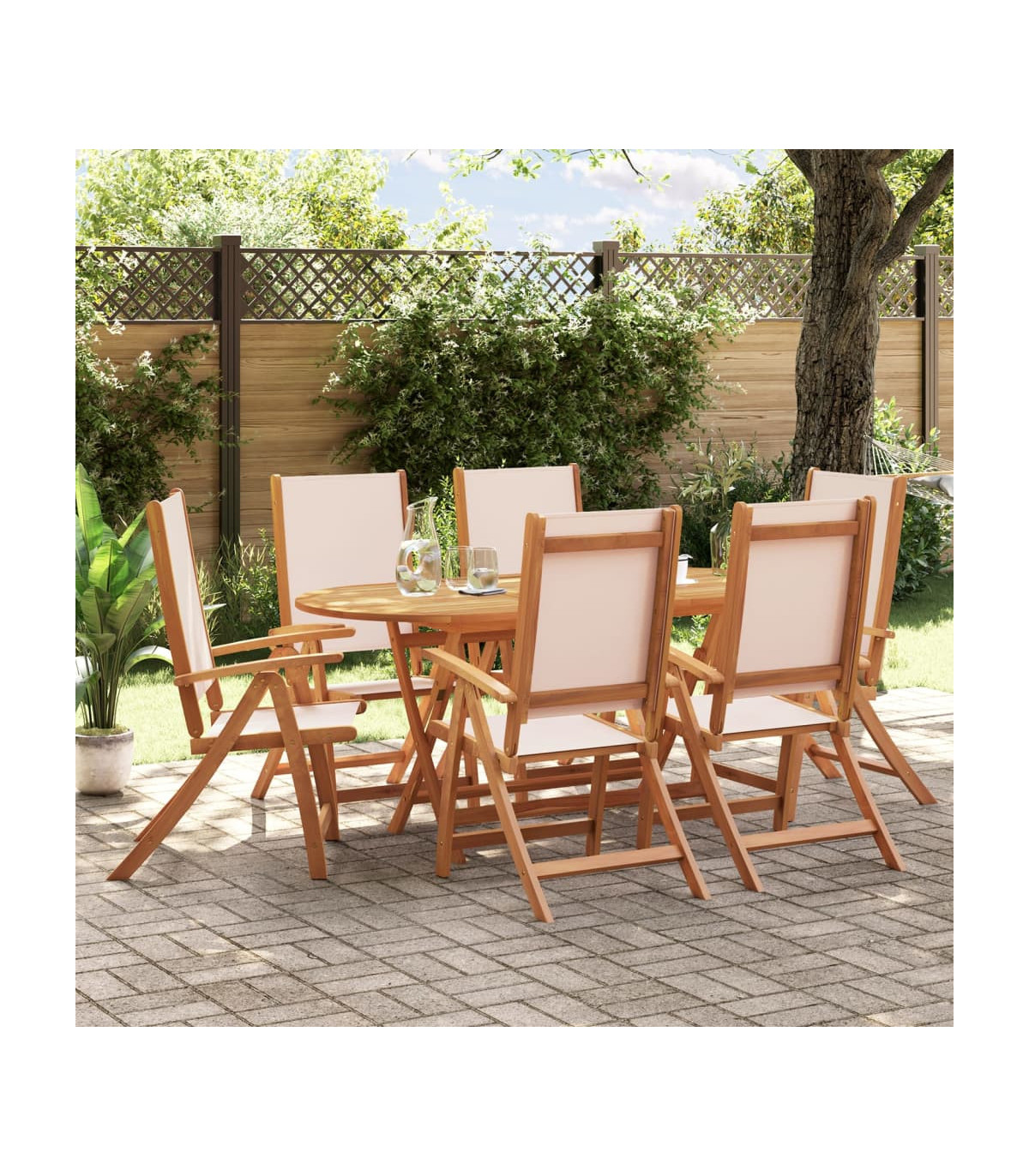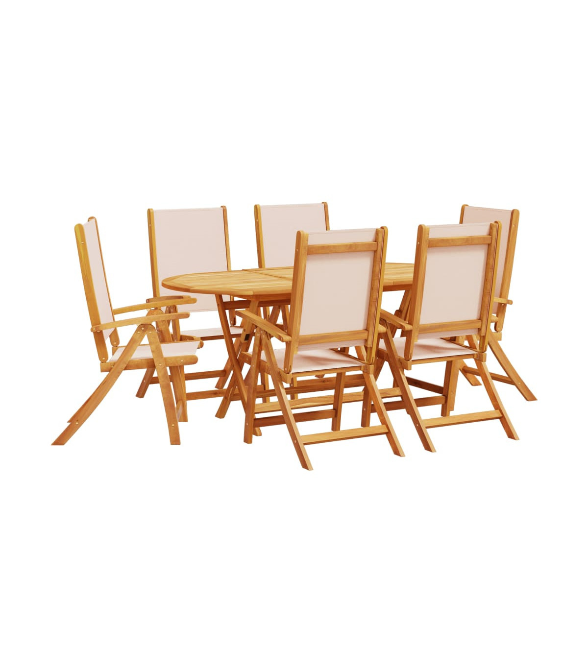 This stylish and contemporary wooden dining set consists of 1 oval table and 6 folding chairs and will be a great choice for al fresco dining in the garden or patio. Our wooden garden furniture set will be the focal point of your garden, terrace or patio. The dining table is made of high-quality acacia wood, a tropical hardwood, which is weather-resistant and durable. The dark oil finished surface is also easy to clean with a damp cloth. The chairs can be adjusted in 5 positions and have a smooth, soft-to-the-touch, weather-resistant texilene top, so you can always find the most comfortable seating position. The table and the chairs can be folded to save space when not in use. Delivery includes 1 oval table and 6 folding chairs.