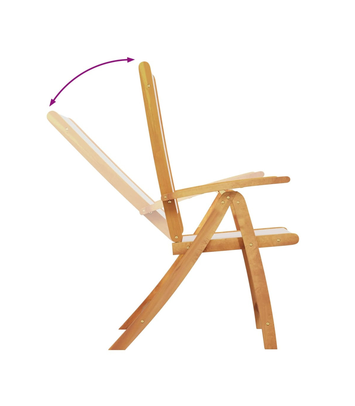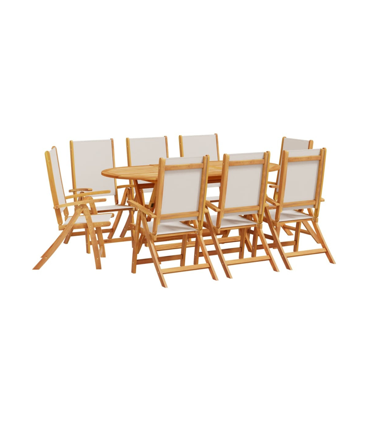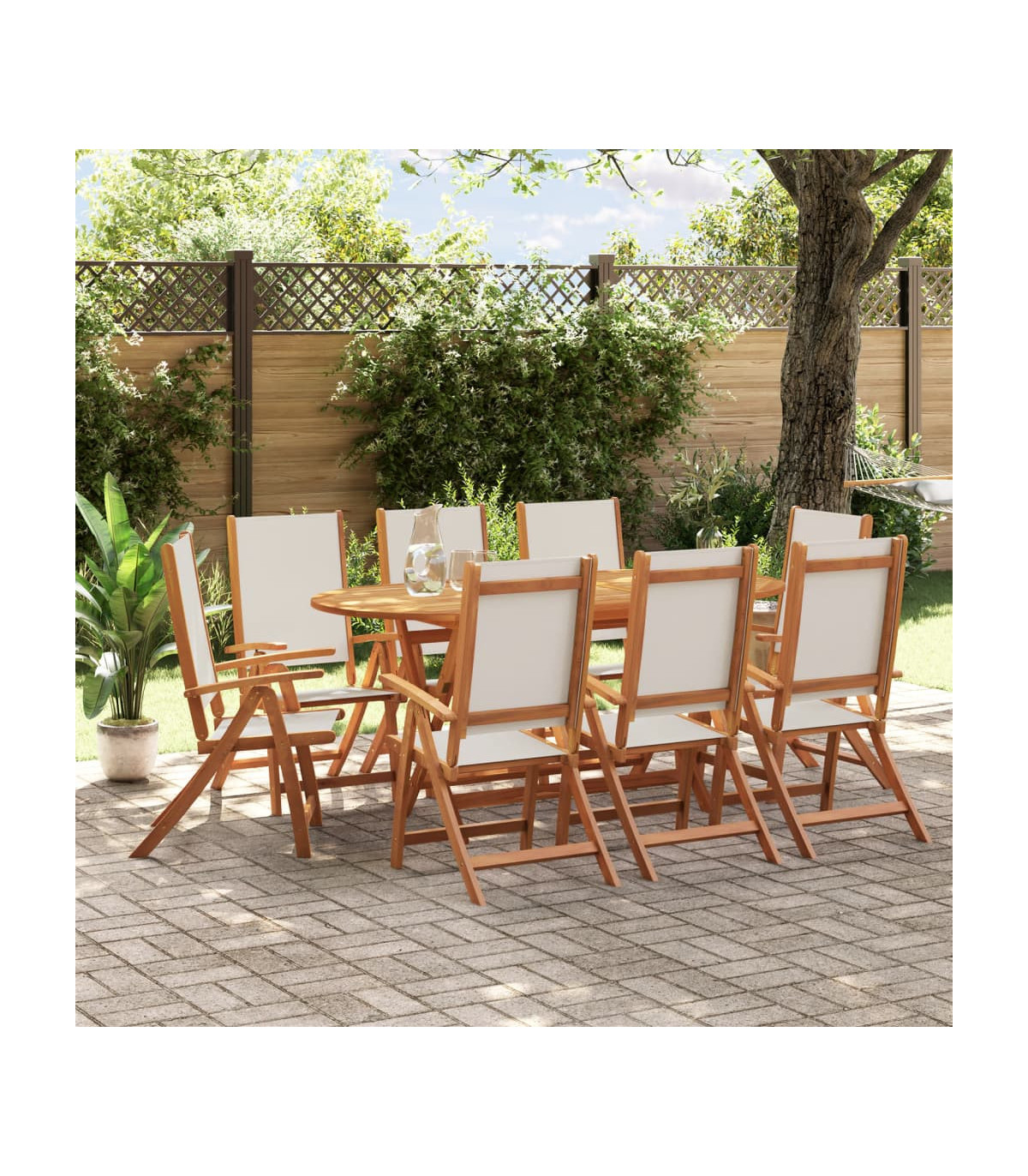 This stylish and contemporary wooden dining set consists of 1 oval table and 6 folding chairs and will be a great choice for al fresco dining in the garden or patio. Our wooden garden furniture set will be the focal point of your garden, terrace or patio. The dining table is made of high-quality acacia wood, a tropical hardwood, which is weather-resistant and durable. The dark oil finished surface is also easy to clean with a damp cloth. The chairs can be adjusted in 5 positions and have a smooth, soft-to-the-touch, weather-resistant texilene top, so you can always find the most comfortable seating position. The table and the chairs can be folded to save space when not in use. Delivery includes 1 oval table and 6 folding chairs.