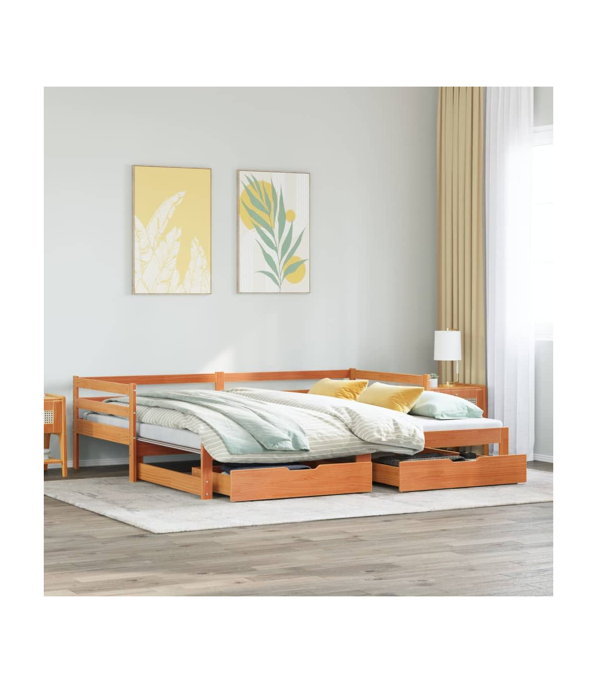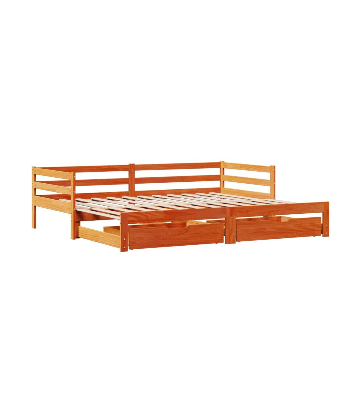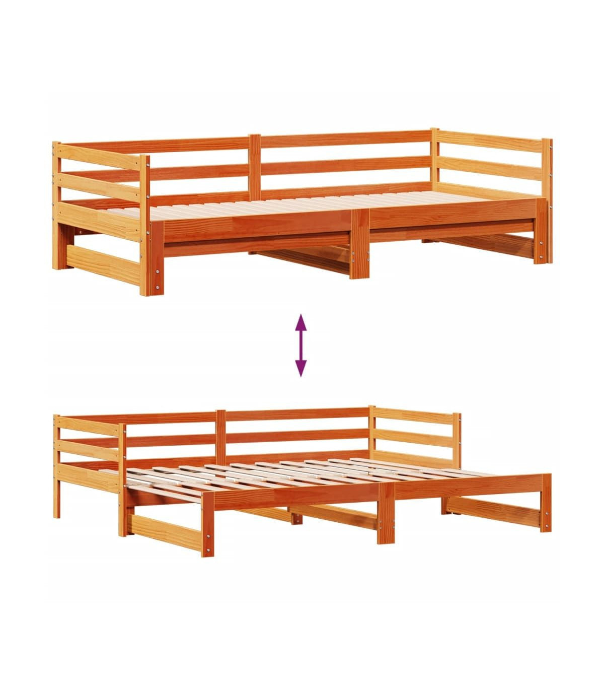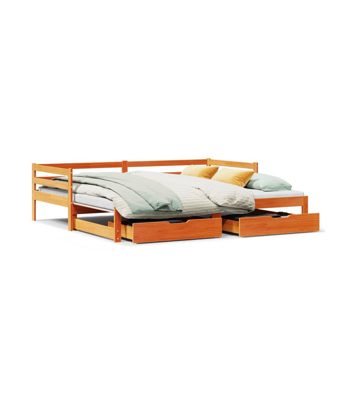 This 2-in-1 daybed with trundle, serving as both a sofa and bed, makes a practical and eye-catching addition to your living room or bedroom. Stable and long-lasting frame: Solid pinewood is known for its strength and durability. Its straight grains and distinctive knots contribute to its rustic charm.Versatile daybed: The sofa bed functions as a sofa during the day and easily converts into a double bed at night by pulling out the trundle, providing a convenient solution for hosting guests and maximising space.Slats for optimal support: The couch bed is complete with slats to offer essential support and breathability to your mattress.Ample storage space: This guest bed has two drawers that provide ample space for storing your clothes, socks, toys, cushions, etc. Good to know:Mattresses are not included with this bed. We do offer a various selection of mattresses. You can check our shop for matching mattresses.