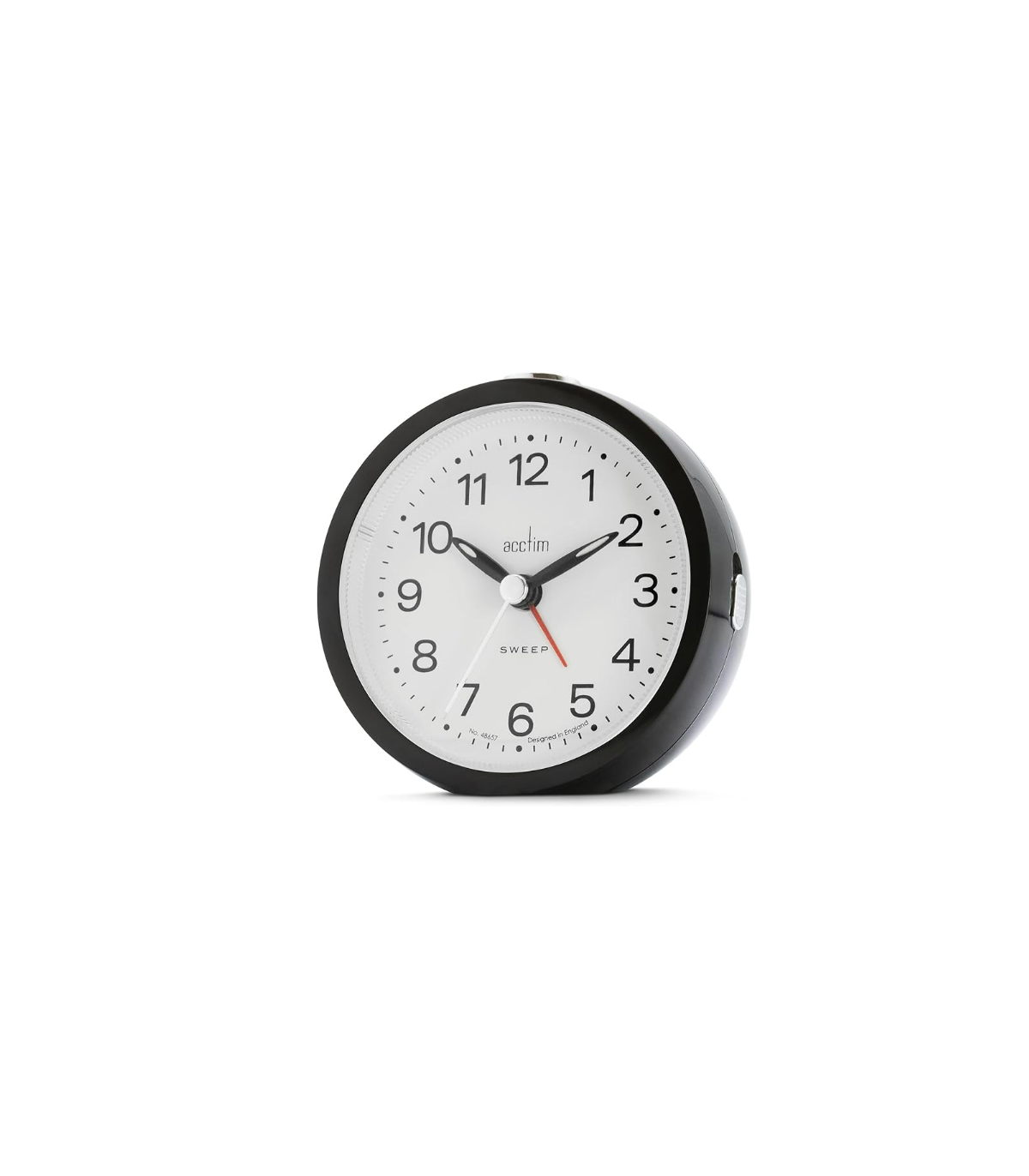 The round Elana alarm clock has non-ticking sweep seconds hand with Quartz movement for precision timekeeping. It comes with an alarm with a snooze function and a light, plus luminous tipped hands for easy nighttime visibility.