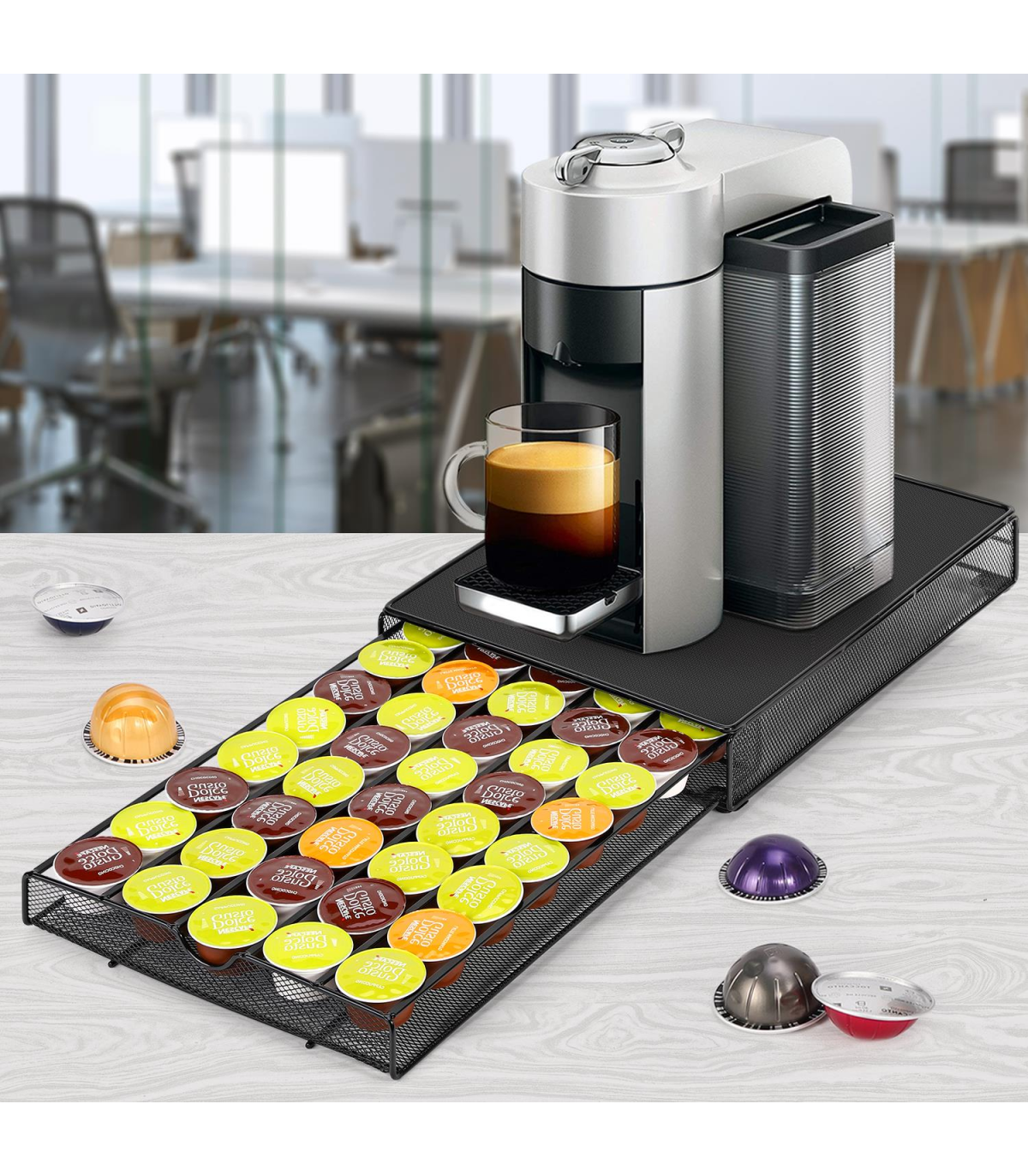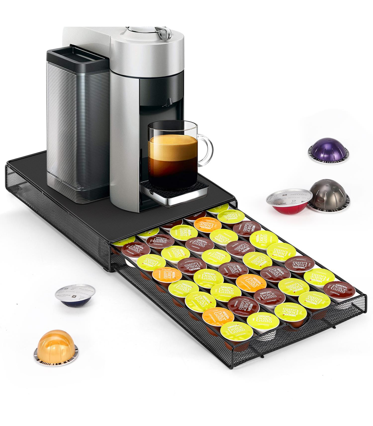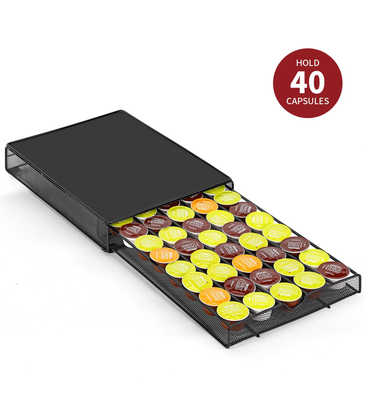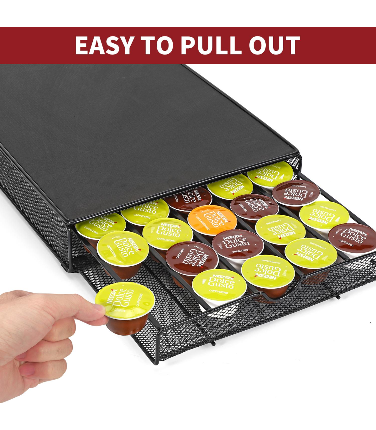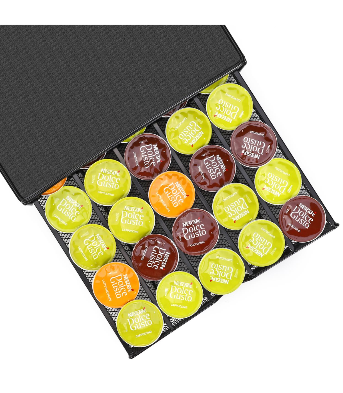 CONVENIENT CAPSULE ORGANISER: This sliding storage drawer holds up to 80 Dolce Gusto capsules, letting you keep your favourites like espresso, latte, and cappuccino neatly organised and accessible. SPACE-EFFICIENT DESIGN: Make the most of your countertop