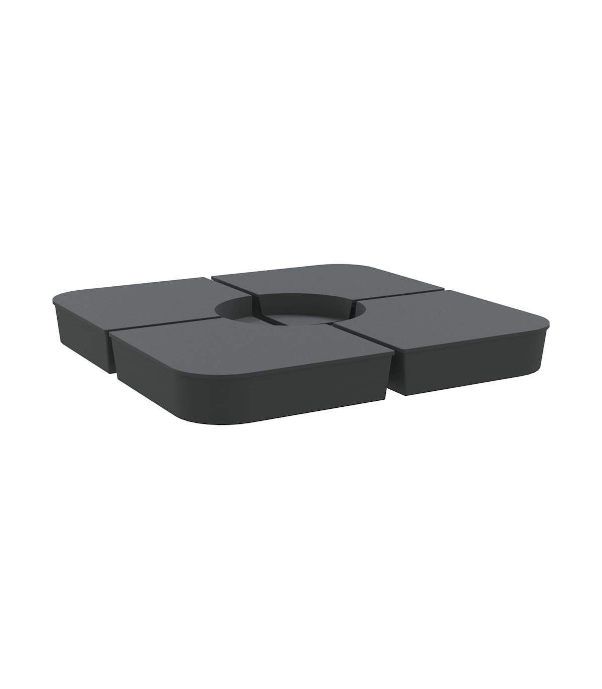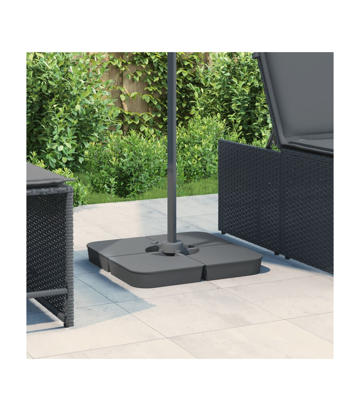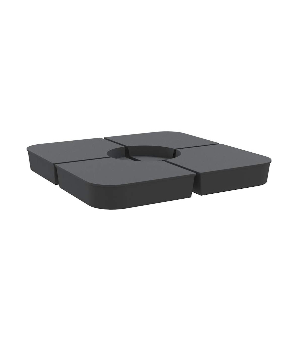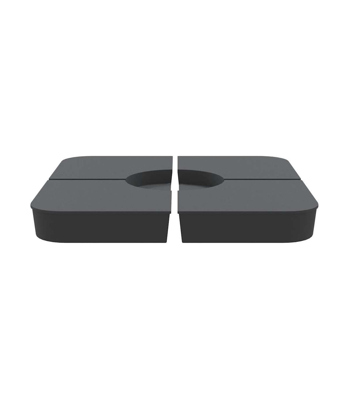 This parasol base set offers a sturdy and reliable foundation to ensure your umbrella remains stable and upright. Durable material: The parasol base is made of polypropylene to ensure high durability, wearability, and longevity.Enhanced stability: Fill the base with the amount of sand that suits your needs to create a reliable foundation, ensuring your umbrella stays securely in place. Each individual base with sand is 25 kg, and the total should be up to 100 kg.Easy to use: This parasol base set consists of four plates that can simply be put together to fix your crossbar base (not included). With a wide opening, the parasol base is simple to fill or empty with sand.Detachable and portable: Thanks to its 4-plate design, this parasol base set is detachable when not in use and can be stacked for convenient transit.Wide applications: The parasol base set is suitable for poolside, patio, garden, or any outdoor space.