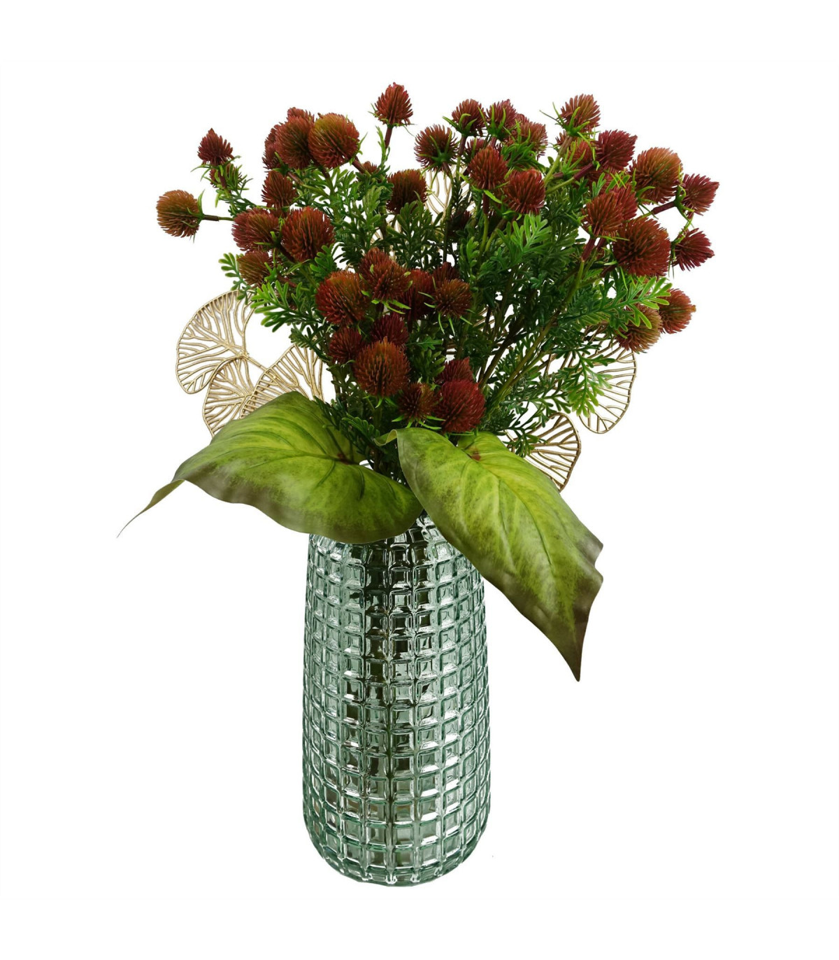 Realistic red craspedia stem with plastic flowers and wired shapable stem. Leaves are silk. Perfect for adding a splash of colour to your floral arrangements. Can be used to make arrangements with our other artificial flowers or as decorations on their own. Each stem measures 55cm overall height x 15cm. These are easy to cut down shorter using a pair of wire cutters if required. Some of our photos show vases to give an idea of size and possibilities for arrangement, but no vases or planters are included with this foliage.