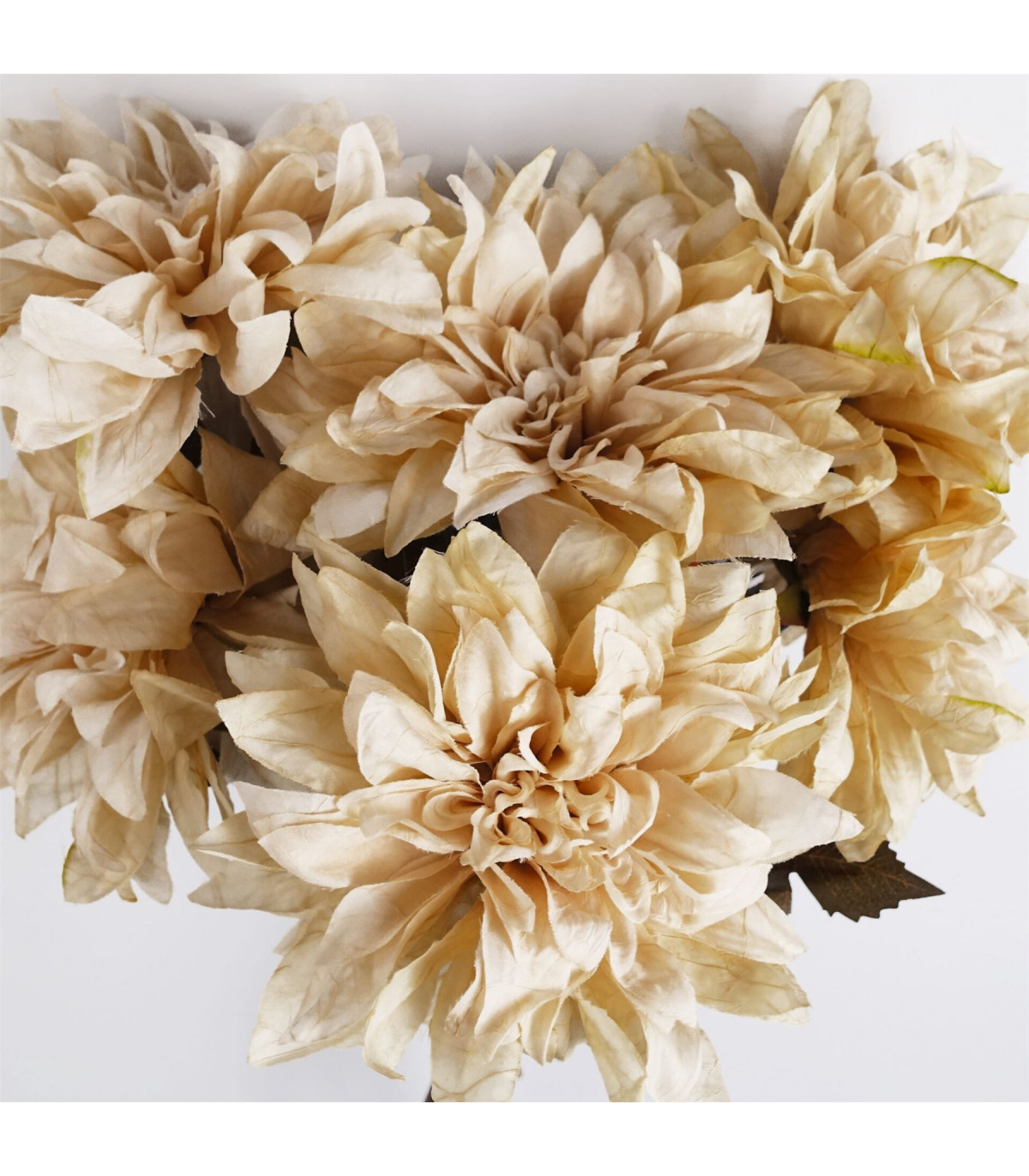 Pack of 6 x 55cm Dahlia Flower stems - Dusty Cream. Realistic dahlia flower stems with silk flowers and wired shapable stems. Leaves are silk. Can be used to make arrangements with our other artificial flowers or as decorations on their own. Each stem measures 55cm overall height x 15cm. These are easy to cut down shorter using a pair of wire cutters if required. Some of our photos show vases to give an idea of size and possibilities for arrangement, but no vases or planters are included with this foliage.