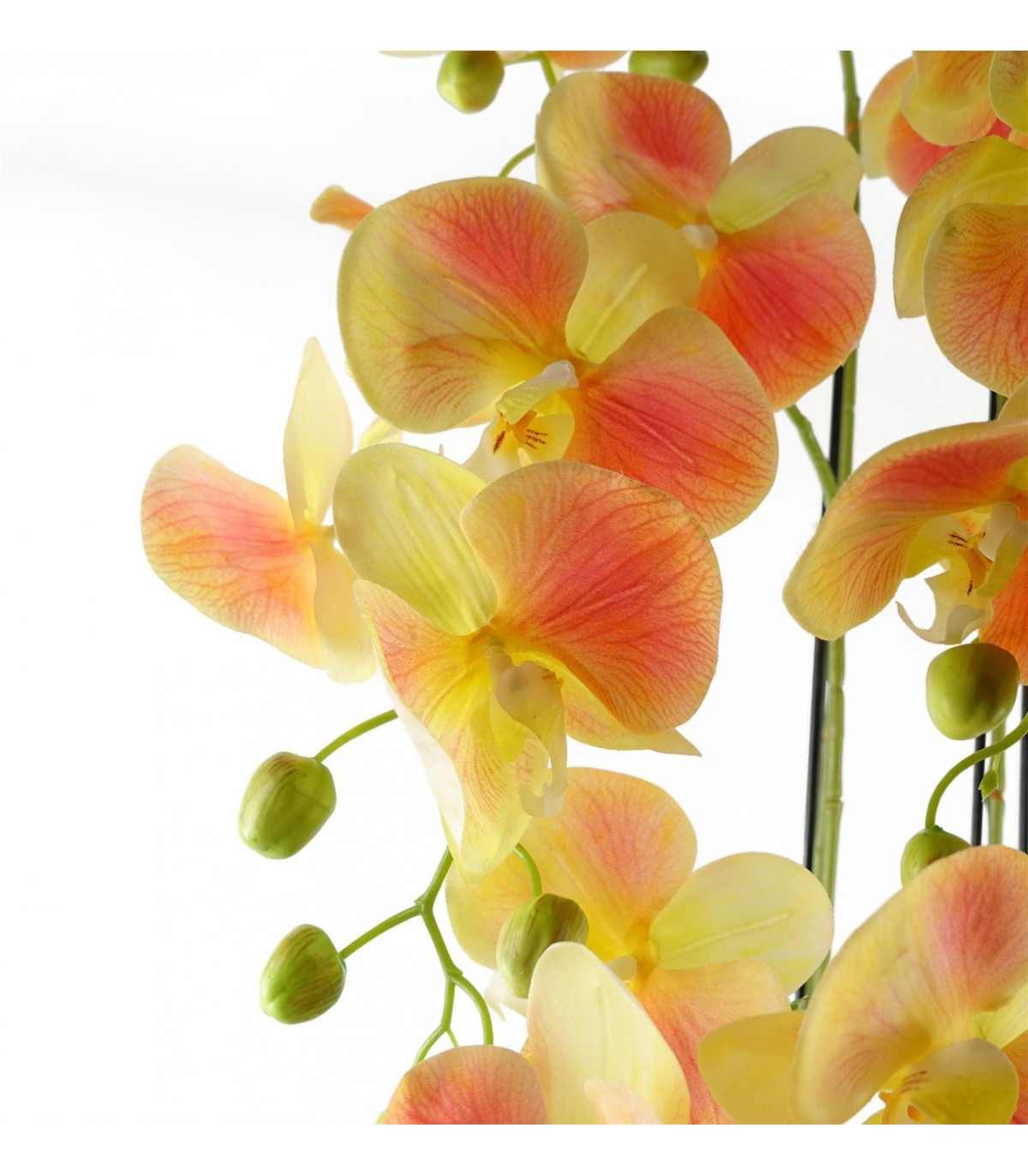 110cm Large Yellow Peach Orchid Plant - Artifcial - 41 REAL TOUCH flowers. Leaf are orchid specialists - our orchids are highly realistic and available in a range of colours. These particular orchids come with 41 Real Touch flowers - these feel like real orchid flowers and are the most realistic available.. As we have it arranged in our photos this plant measures: 110cm x 40cm x 40cm. The stems are wired and this can be shaped to fit your space perfectly.. These look particularly impressive when arranged in one of our decorative planters (available separately).. Pot measures: 27cm (d) x 23cm (h). Pot Material: Plastic weighted pot