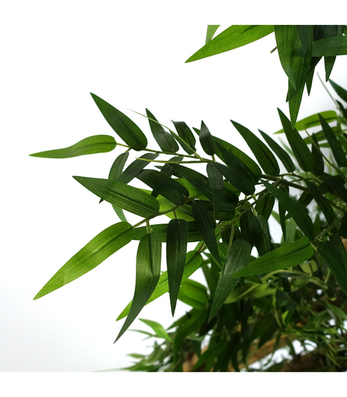 Artificial Bamboo tree. This tree has silk leaves and natural large size bamboo canes really realistic. As we have it arranged in our photos this measures 120cm x 60cm x 60cm. The branches are wired and so the leaves can be shaped to fit your space if you need it to be narrower or wider. It comes potted in a weighted black plastic pot (measuring 18cm (d) x 14cm (h) approx.) These trees look most impressive if you put them inside a decorative planter and cover the top with gravel or soil.