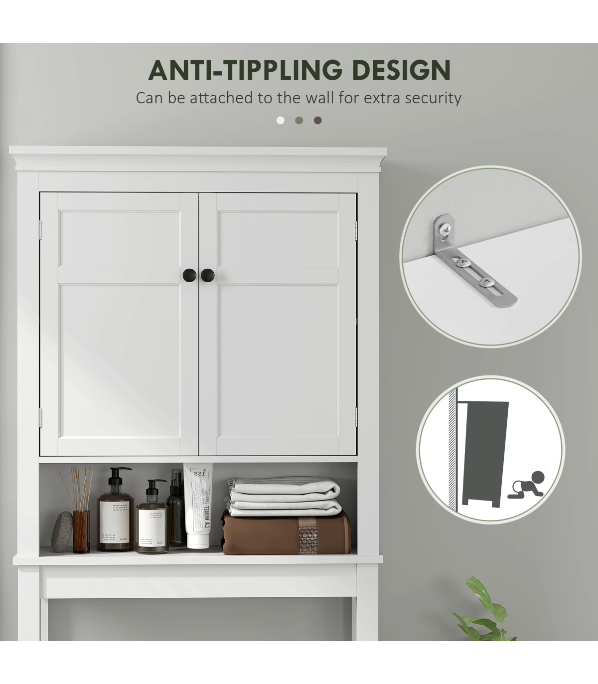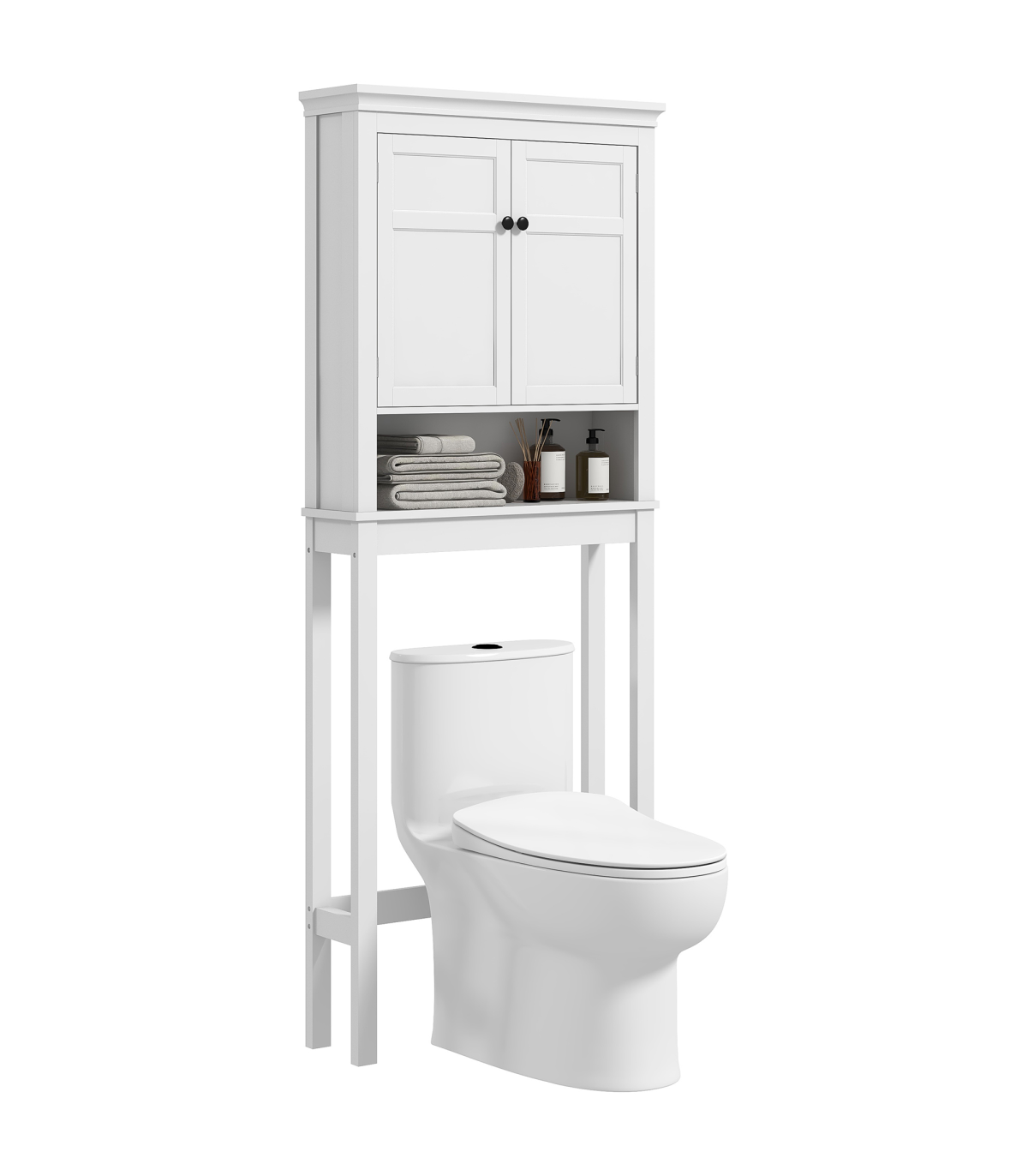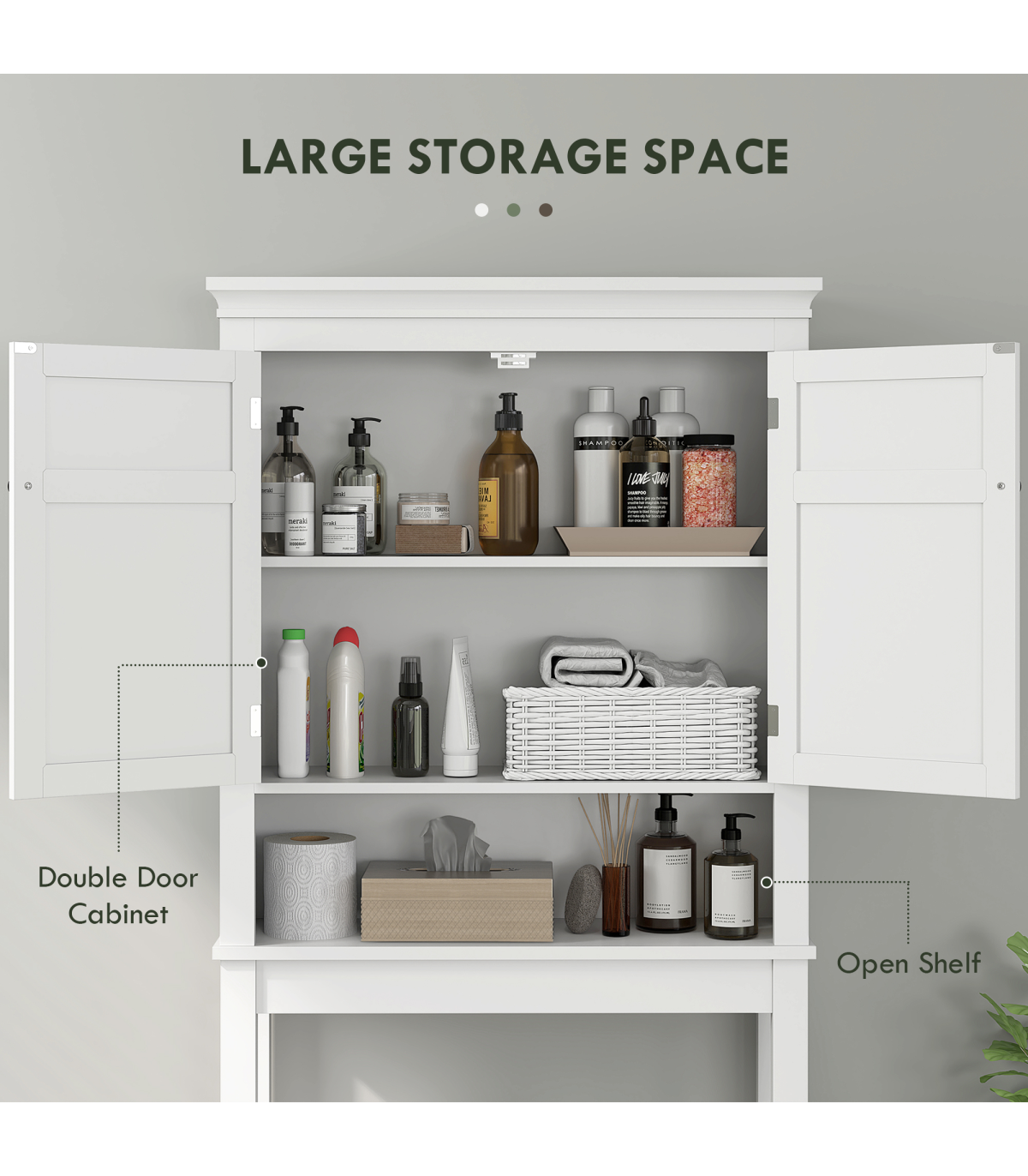 ● Two-tier upper cabinet and lower shelf: room for bathroom products, towels and similar