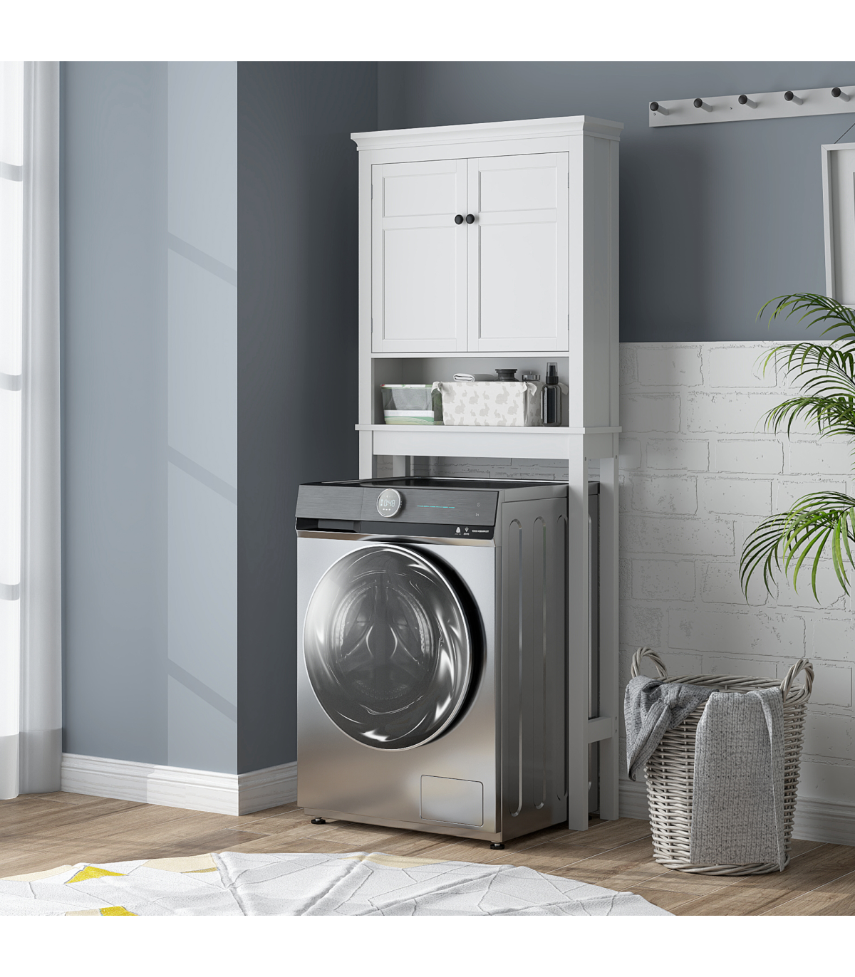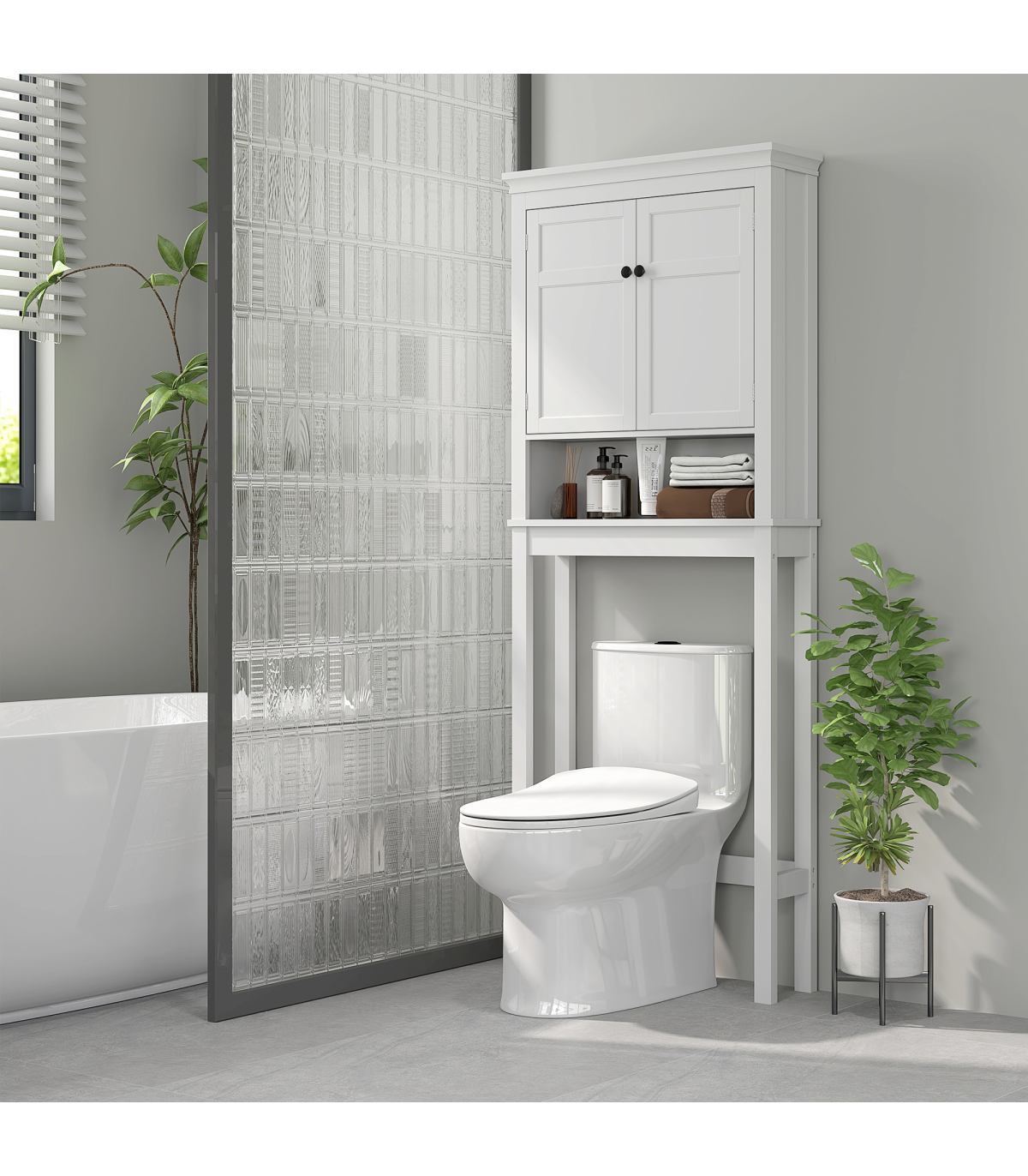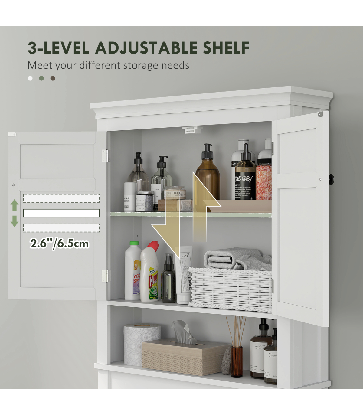 ● Two-tier upper cabinet and lower shelf: room for bathroom products, towels and similar