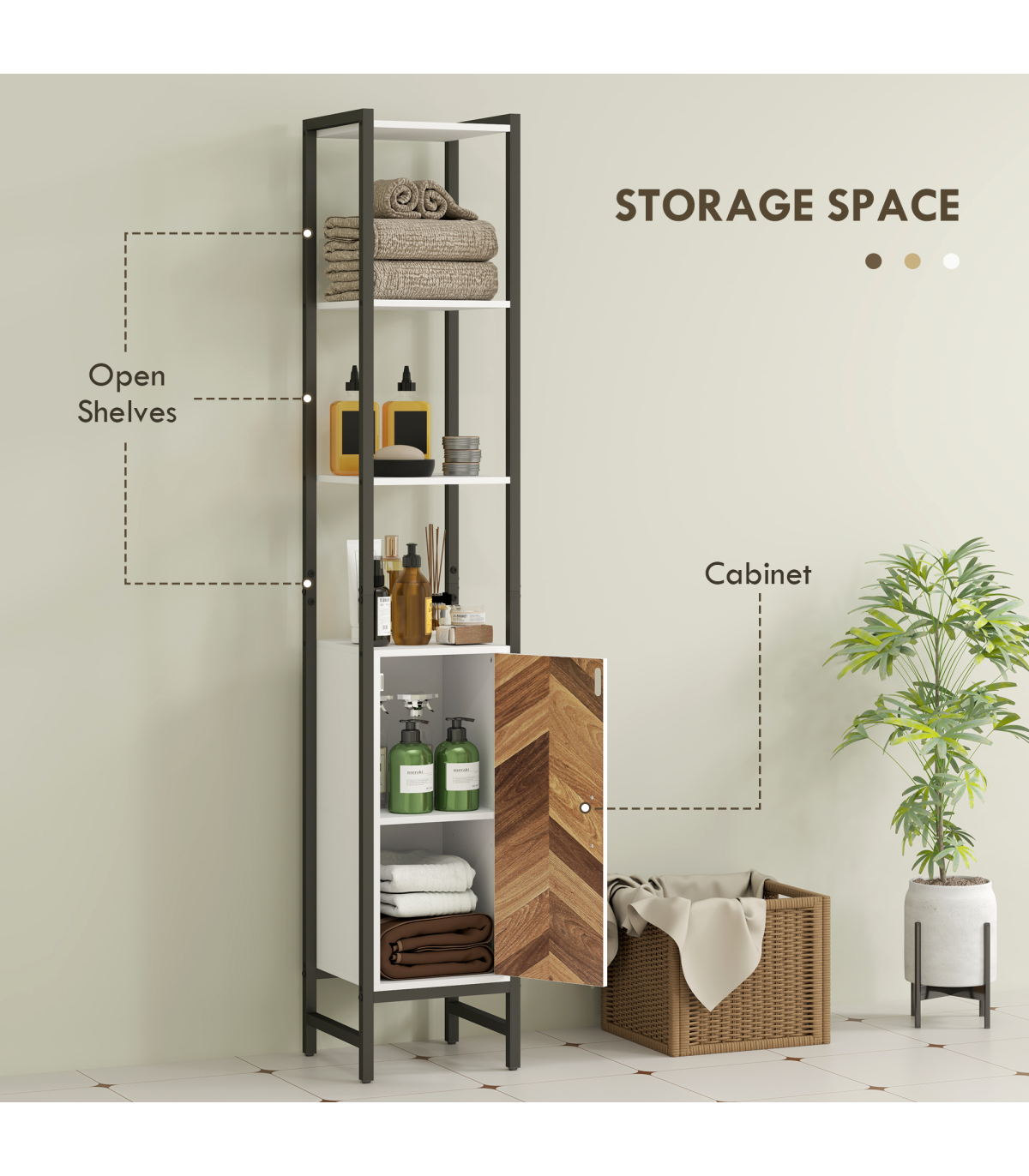 ● Three shelves and a cabinet for various storage needs