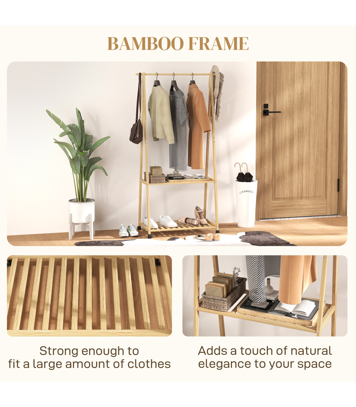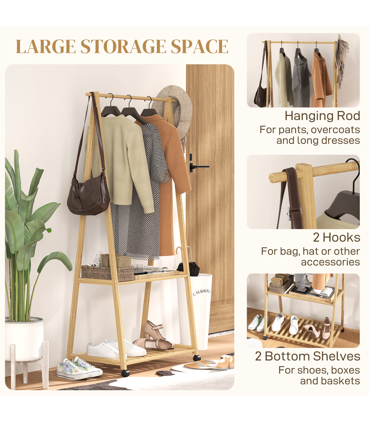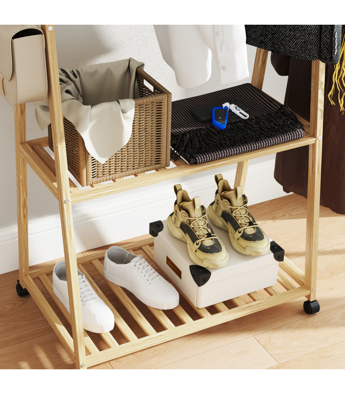 ● Two bottom slatted shelves hold shoes or storage boxes